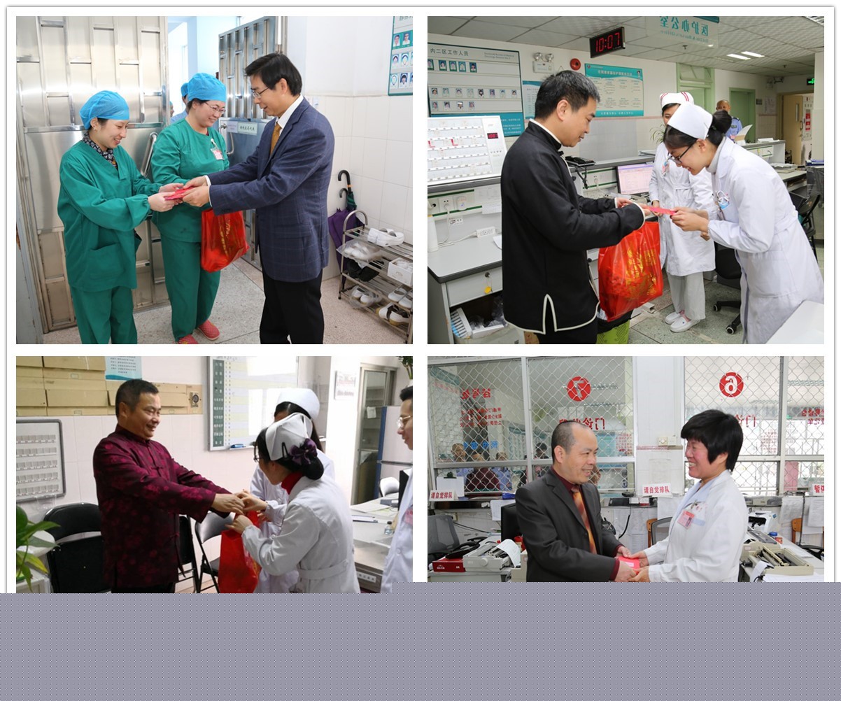 2月16日上午,农历正月初一,阳光明媚,我院姚锡涛书记、林志雄副院长、林英城副书记、邱卫黎副院长、韩冬青总会计师携院办工作人员亲切慰问了坚守在工作岗位上的一线医护、后勤工作人员,为他们送上慰问品,并致以最美好的祝愿,祝大家新春愉快,身体健康,阖家幸福。 走访过程中,院领导询问了各病区的患者住院情况及各科室的运转情况,并与值班人员亲切交谈。院领导对一线人员为医院发展做出的奉献表示肯定,勉励大家节日期间继续坚守岗位,确保医疗和生产安全,确保各项工作正常运转,一如既往地为患者提供优质的医疗服务,度过一个平安祥和的新春佳节。真诚的慰问,温暖的祝福,每个工作人员的脸上都洋溢着幸福的微笑,各病区呈现出温馨、和谐的氛围。在岗工作人员感谢院领导的关心与祝福,他们表示今后将继续立足岗位,全力支持医院的工作,积极为肿瘤医院的发展做贡献。 (通讯员:陈泓琳)