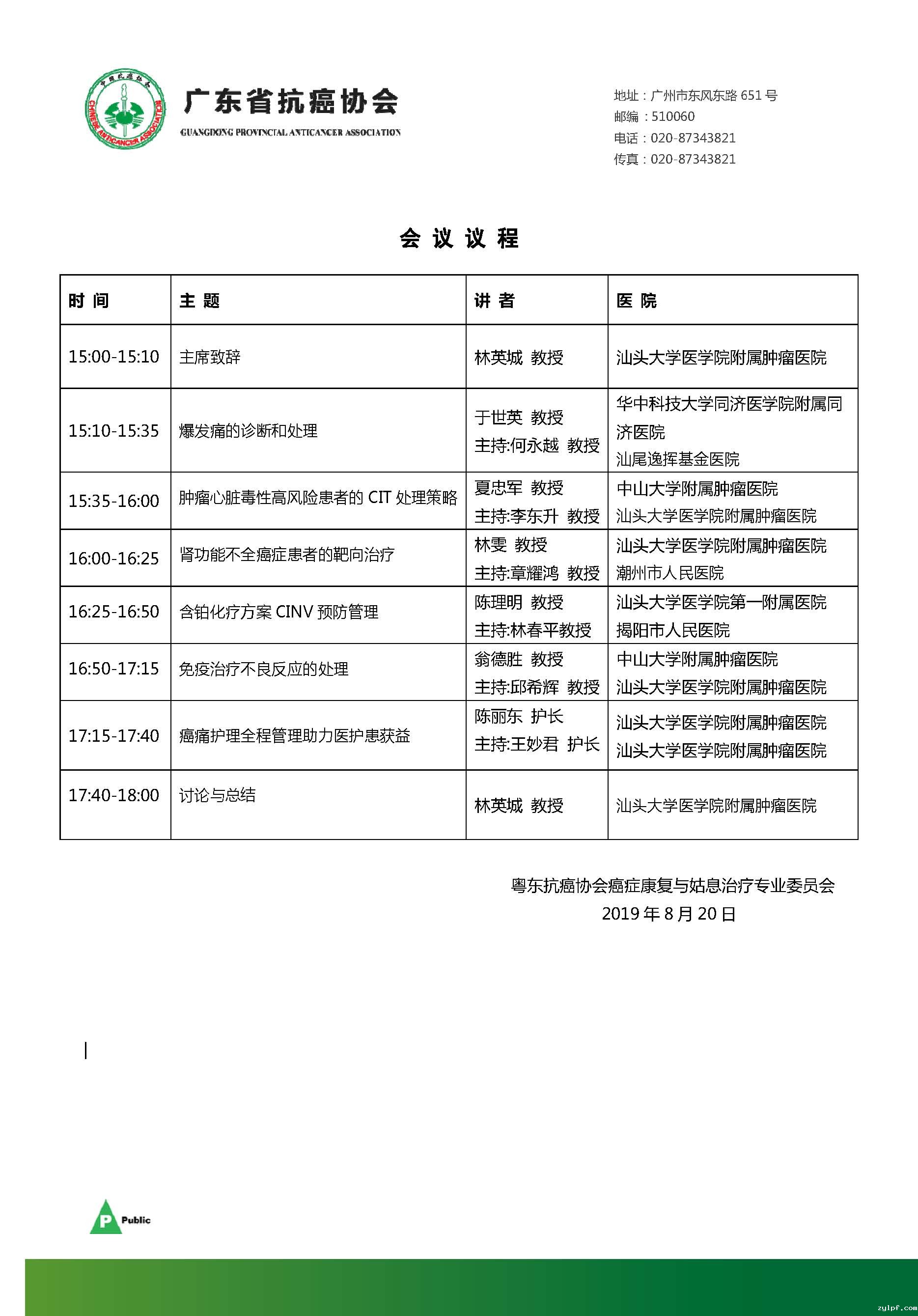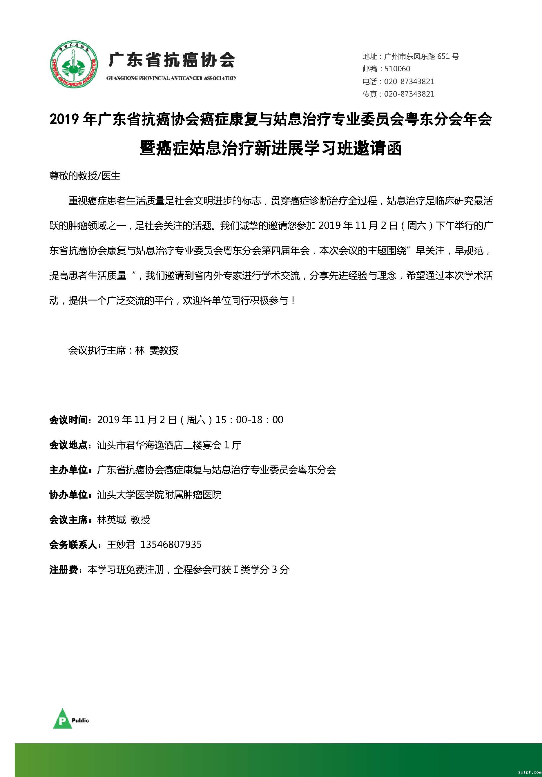2019年广东省抗癌协会癌症康复与姑息治疗专业委员会粤东分会年会 暨癌症姑息治疗新进展学习班邀请函