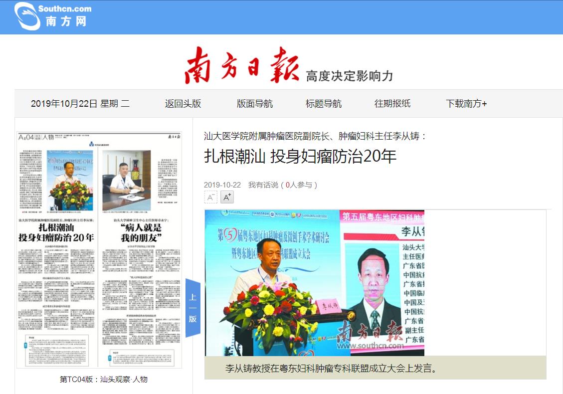 【媒体视角】南方日报:汕大医学院附属肿瘤医院副院长、肿瘤妇科主任李从铸:扎根潮汕 投身妇瘤防治20年