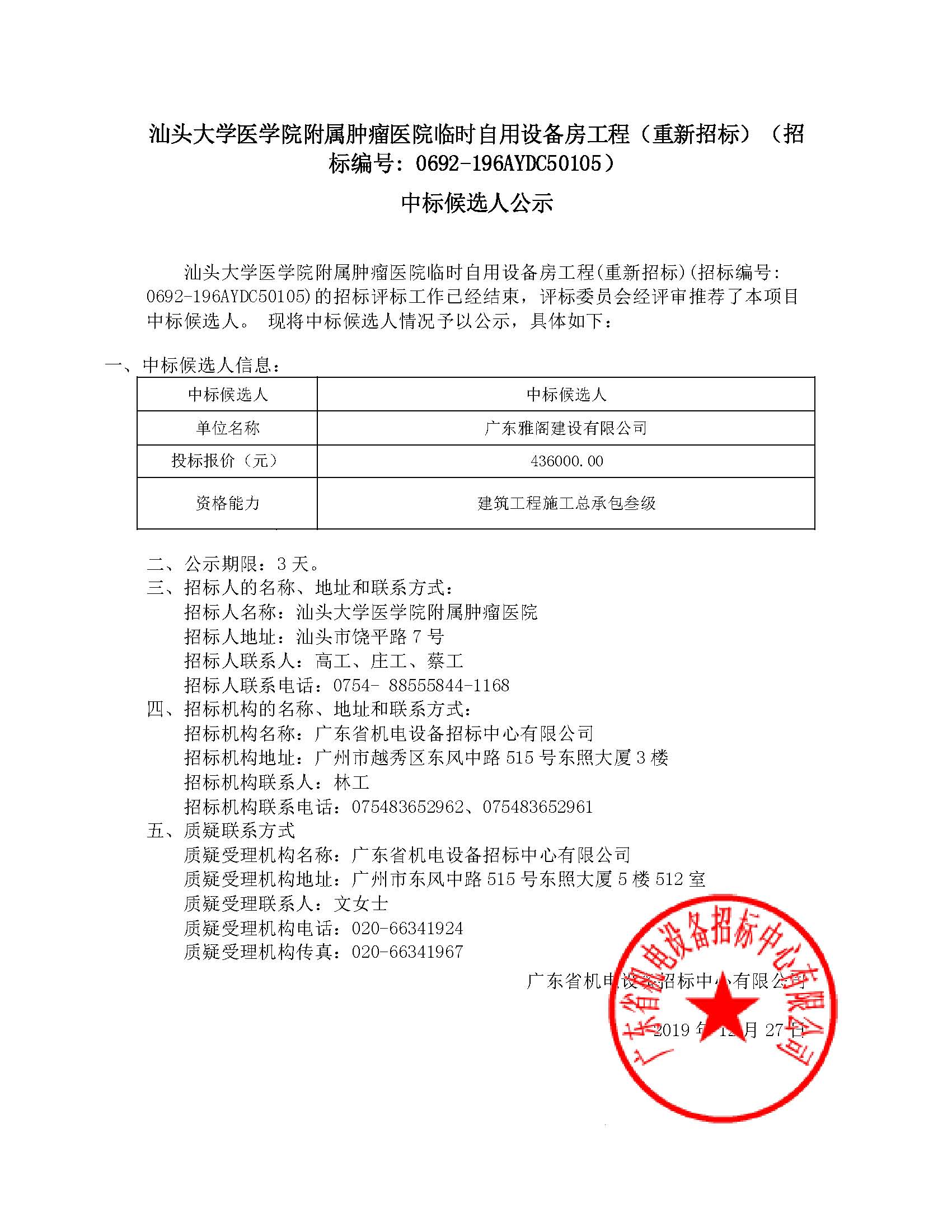 临时自用设备房工程(重新招标)(招标编号: 0692-196AYDC50105)中标候选人公示