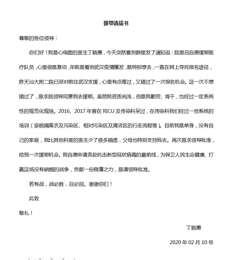 主动请缨,随时准备出征 为做好应急准备,2月10日,医院党政联合发出关于组建援鄂预备医疗队的通知。当消息在院内发出后,12个党支部迅速响应,党员领导干部带头报名,不到一天的时间,收到50多位来自胸外科、放疗科、头颈科、腹部外科、乳腺中心、妇瘤科、肿瘤内科、ICU、介入科、麻醉科、手术室、放射科、检验科、静配中心、超声医学科、内镜室和多个职能科室等医生、护士、医技和行政后勤负责人及工作人员的踊跃报名,请愿投身防治一线,目前报名人员还在增加。护理部早安排、行动快,前期两轮报名通知中已有一批护理同志主动报名。在医院组建援鄂预备医疗队的通知发出后,收到各科护士长及护士们争先恐后、主动请战。更值得称赞的是,年轻的护理人员在关键时刻挺身而出,敢于担当,正如青年护士刁超在请战书里所写的“征程号角已经吹响,不惧疫情,敢较量,为祖国决胜疆场”,毅然决然要求奔赴前线。 作为机关二党支部书记,人事科副科长袁云屡次请战:“国有难,我们义不容辞;家有难,我们义不容辞。我们请求加入援鄂医疗队,理由:‘没有不去的理由’。” 来自外科四支部的ICU护士长余淑贤说:“职责所在,使命必达,我无条件服从与支持”,ICU另有3名护士主动请缨。 来自心电图室的丁晓惠医生说:“2016、2017年曾在RICU及传染科呆过,在传染科我们经过一些系统的培训。目前我是单身,没有自己的家庭,我比其他科室的医生少了很多顾虑,父母也特别支持我去。再次恳求领导批准,给我一次援鄂机会。”