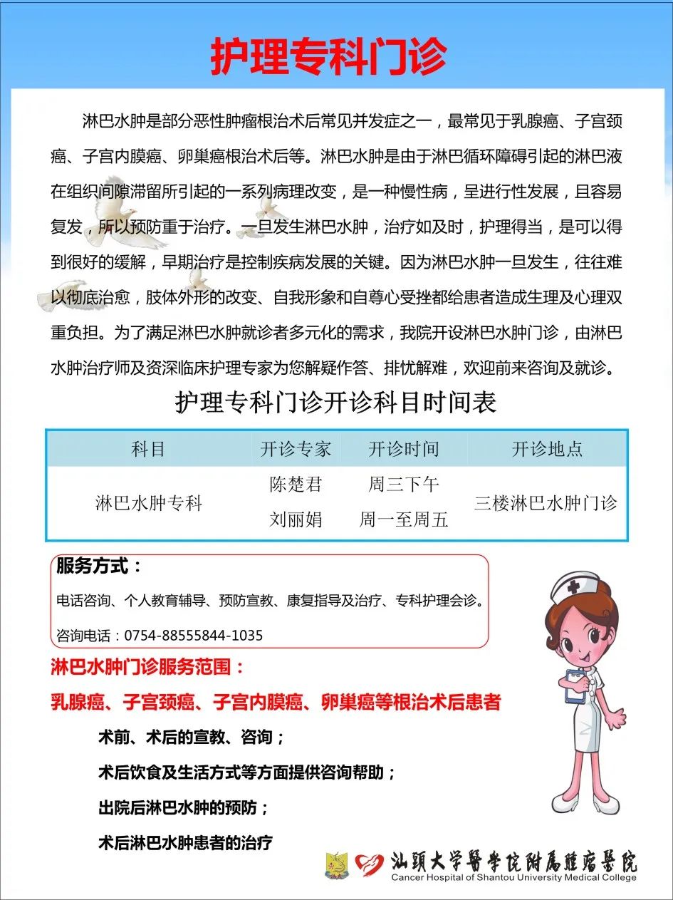 正值“5.12”国际护士节,为弘扬南丁格尔精神,进一步深化以病人为中心的优质护理服务,加强护理学科建设,促进专科护理发展, 不断创新服务理念,拓展护理服务领域和内涵,更好地做好延伸康复护理工作,满足就诊者多元化服务需求,提高患者治疗效果。5月12日上午,我院新增设的淋巴水肿门诊、临床营养门诊、吞咽康复复声门诊正式开诊,这是我院继静脉导管护理门诊、伤口造口护理门诊之后的三大特色护理专科门诊。各护理专科门诊由获得广东省专科护士证书的专科护士及临床资深护理专家坐诊,为患者提供优质护理服务。 新增设的护理门诊各有特色: 1、淋巴水肿门诊 乳腺癌、子宫颈癌、子宫内膜癌、卵巢癌等患者根治术术前、术后的宣教、咨询;术后饮食及生活方式等方面提供咨询帮助;出院后淋巴水肿的预防;术后淋巴水肿患者的治疗。