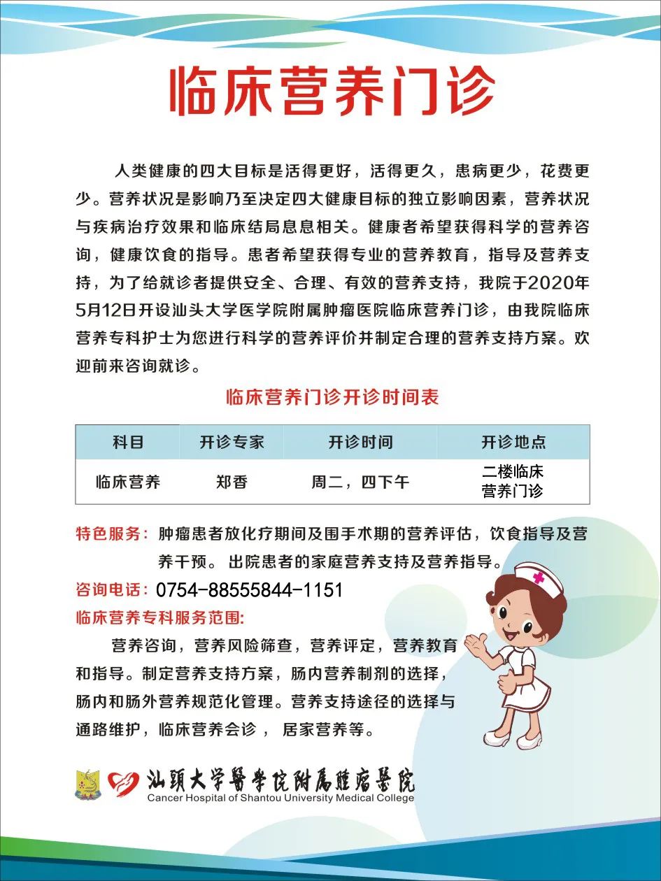 2、临床营养门诊: 为肿瘤患者提供营养咨询,营养风险筛查,营养评定,营养教育和指导,制定营养支持方案,肠内营养制剂的选择,肠内和肠外营养规范化管理,营养支持途径的选择与通路维护,临床营养会诊及居家营养。