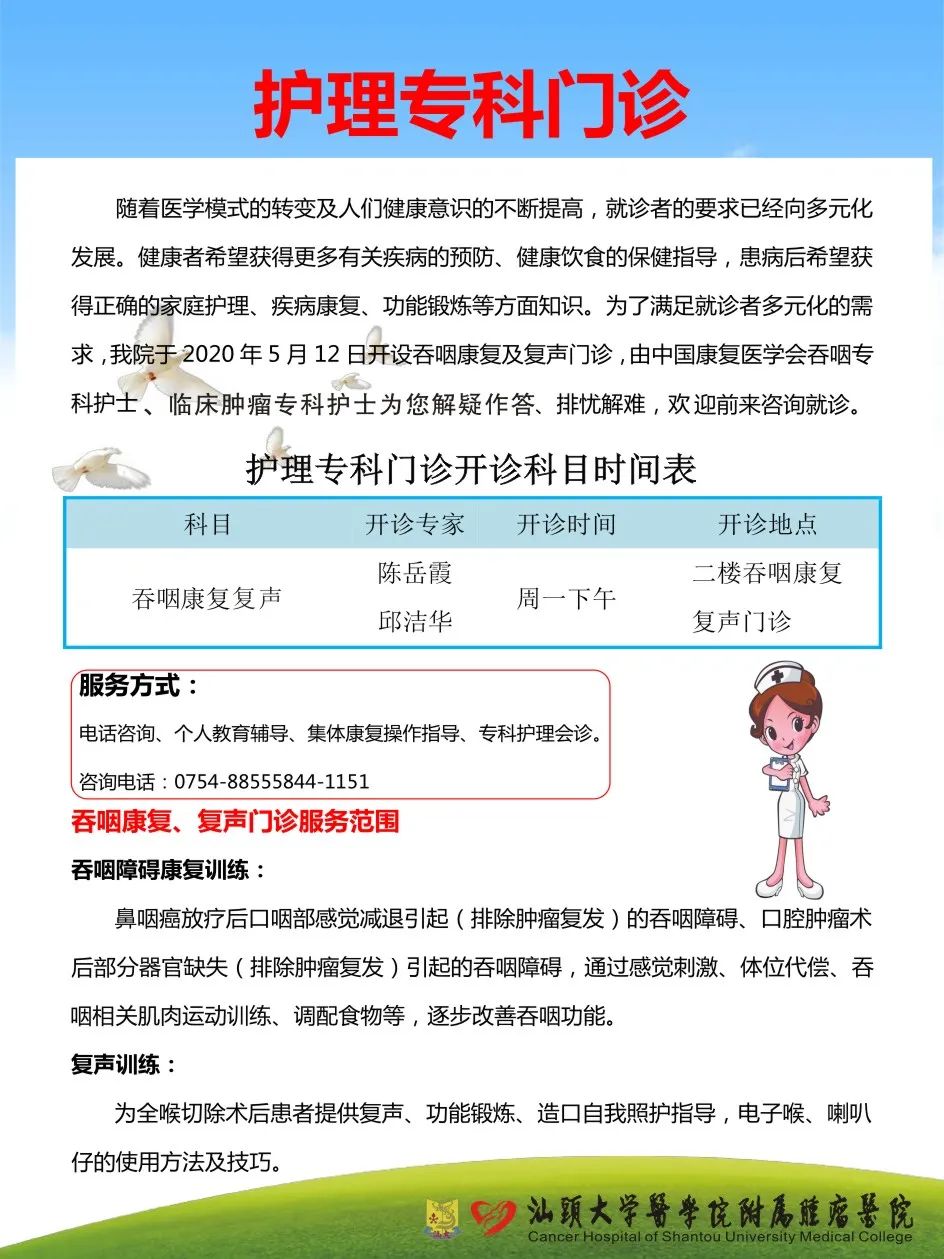 至此, 共有五个护理专科门诊,包括静脉导管护理门诊、伤口造口护理门诊、淋巴水肿、临床营养门诊、吞咽康复复声门诊。 护理专科门诊开诊安排如下: