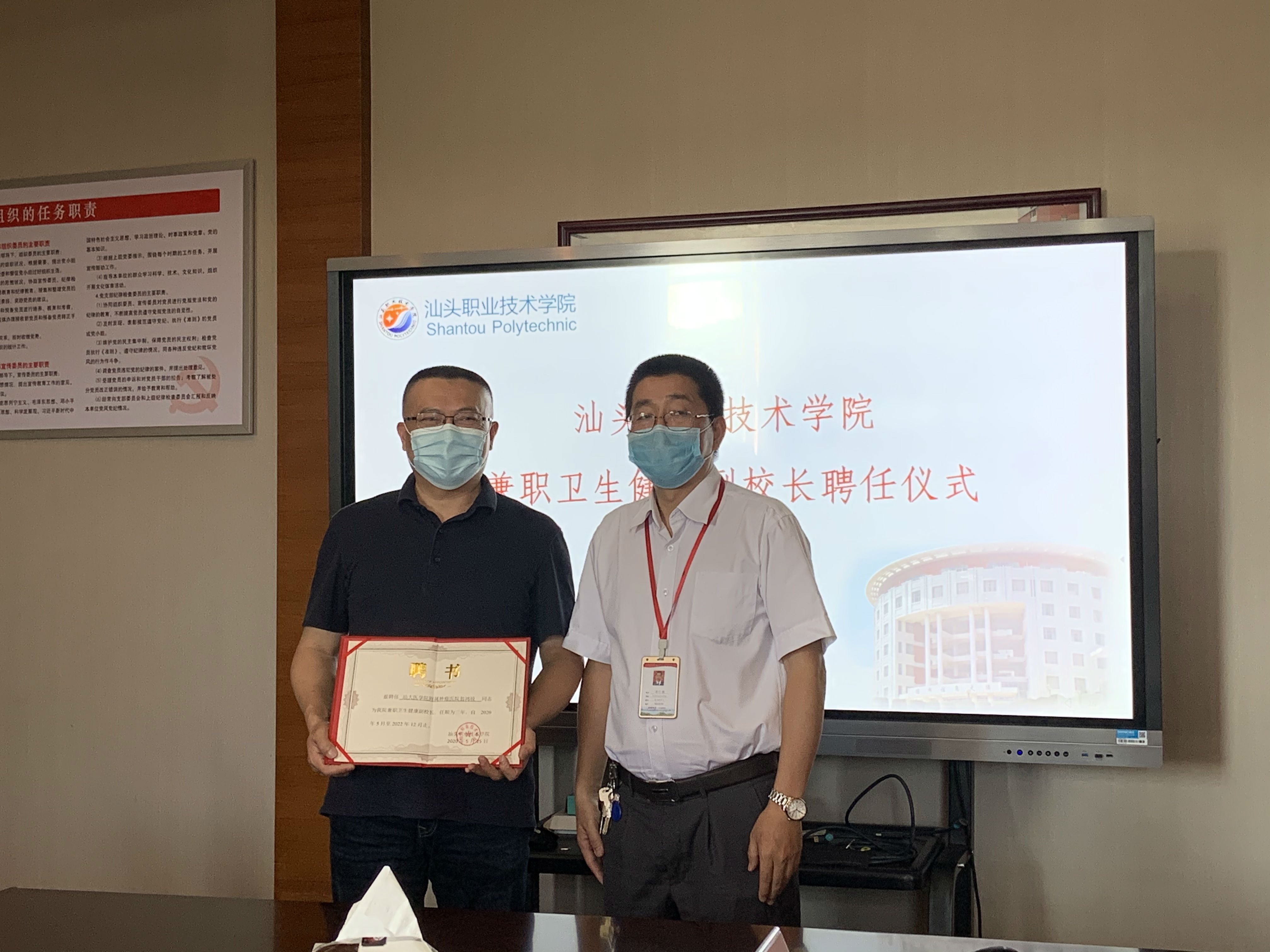 6月3日下午,我院党委书记姚锡涛书记带队一行,到汕头职业技术学院参加该校兼职卫生健康副校长聘任签约仪式,与该校党委副书记方小铁、学院办公室主任曾书培等做交接工作。 为贯彻落实《广东省卫生健康委广东省教育厅关于规范兼职卫生健康副校长管理工作的通知》精神,经市卫生健康局和市教育局联合审定,我院医疗质量管理科副科长翁鸿锐同志受聘为汕职院兼职卫生健康副校长,放疗科主管护师林韵同志驻校指导和协助校医所开展疫情防控工作。 会上,姚书记发言表示,目前,新冠肺炎疫情处于常态化防控阶段,我们仍要时刻绷紧这根弦,不能有松懈情绪,按照省卫生健康委、省教育厅的工作部署和要求,我院愿意全力支持协助学校做好校园疫情防控及卫生工作,为保障学校师生员工生命安全和身体健康尽我们的一份力。 面对汕职院一万多名学生即将来临的复学期间疫情防控压力,来自我院的医疗前线的翁鸿锐同志及林韵同志表示将发挥专业医疗卫生素养,配合学校实际情况及时开展各项疫情防控、卫生突发事件处理及健康卫生知识宣教工作。 会后,在汕职院领导的陪同下,姚书记一行参观了汕职院校园环境及卫生支持系统。