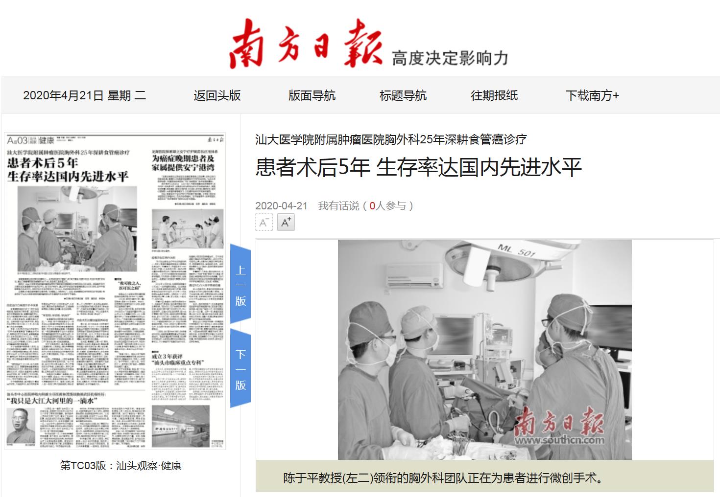 【媒体视角】南方日报:汕大医学院附属肿瘤医院胸外科25年深耕食管癌诊疗 患者术后5年 生存率达国内先进水平