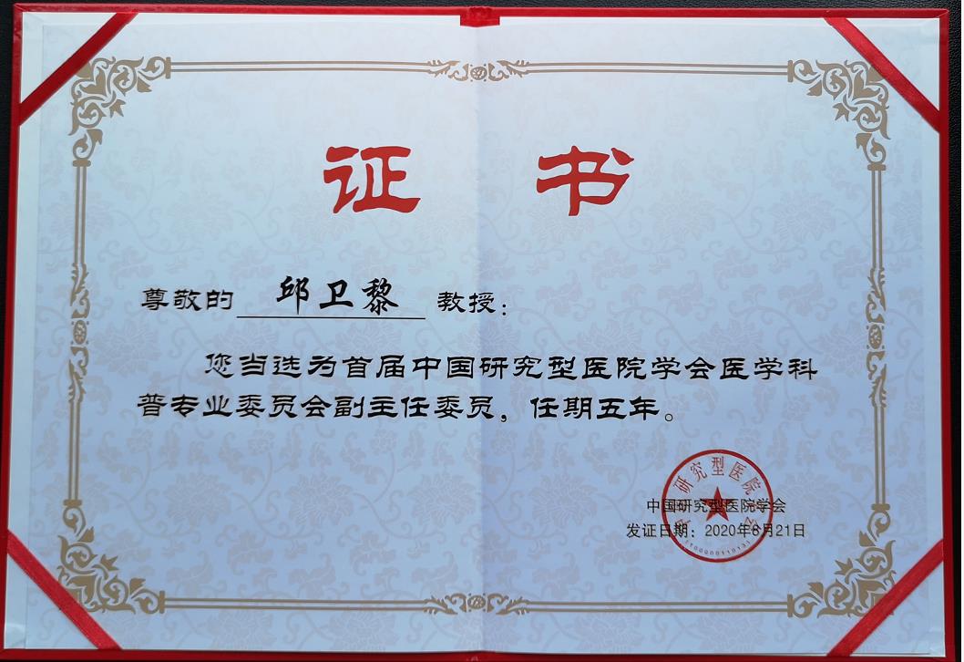 我院邱卫黎副院长当选中国研究型医院学会医学科普专业委员会副主任委员