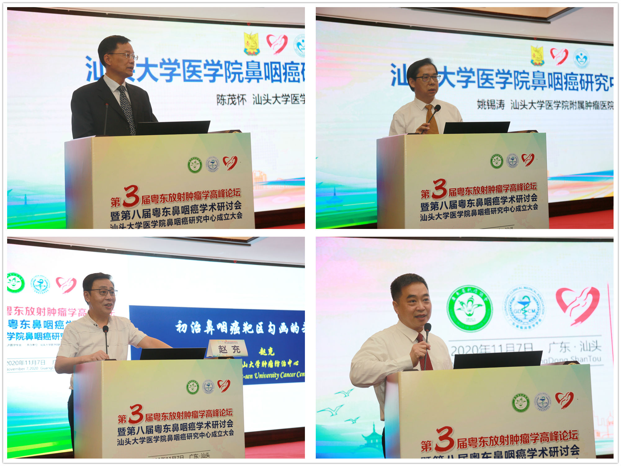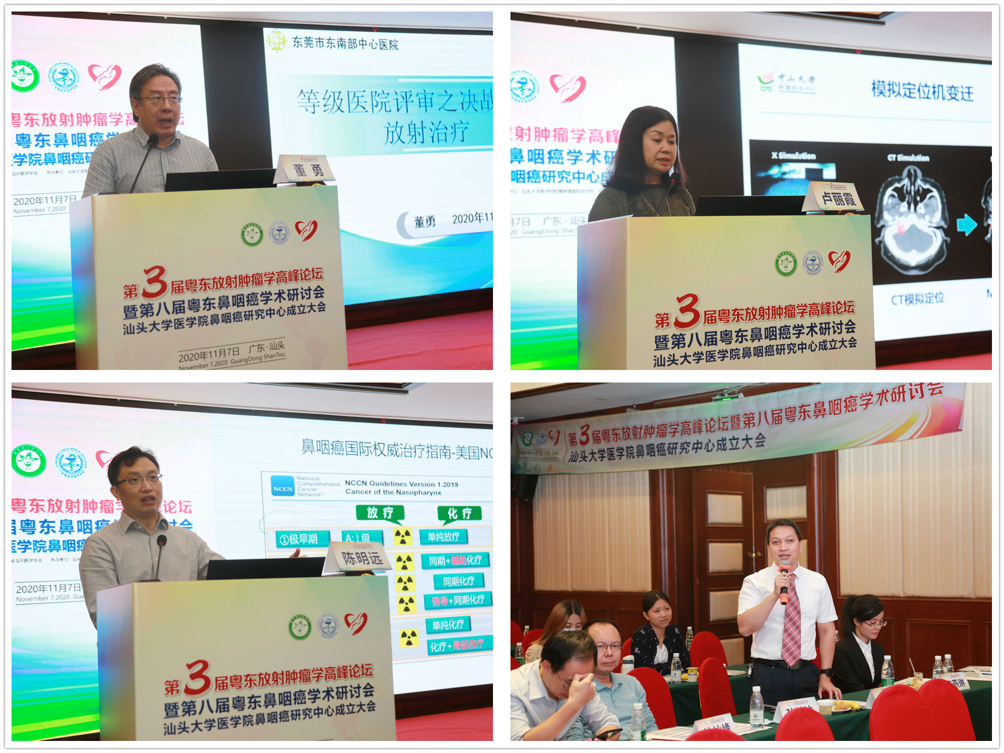 2020年11月7日,由我院放疗科承办的第三届粤东放射肿瘤学高峰论坛暨第八届粤东鼻咽癌学术研讨会在汕头市金海湾大酒店会议厅顺利召开,会上举行了汕头大学医学院鼻咽癌研究中心揭牌仪式,汕头大学医学院党委书记陈茂怀教授出席会议。 陈茂怀书记及我院党委姚锡涛书记分别致辞,对我院放疗科30多年来在学科建设、人才梯队培养、教学和科研等方面取得的成绩给予了高度的评价,祝贺汕大医学院鼻咽癌研究中心的成立并预祝本次学术会议圆满成功。随后,两位书记协同来自中山大学肿瘤防治中心的赵充教授与汕大医学院鼻咽癌研究中心主任、我院党委副书记、大放疗科主任林志雄教授共同为研究中心揭牌。 我院放疗科举办的学术年会已经连续八年,规模不断扩大,已经成为粤东地区最大的肿瘤放疗会议和重要的学术交流平台,吸引了大湾区和梅州、揭阳、潮州以及汕头本地的众多专家参会。会议采用线上、线下相结合的方式,从当前放疗领域的热点靶区勾画、国际上最顶尖的磁共振模拟技术、三维后装治疗的应用、免疫治疗的最新进展,到等级肿瘤医院评审的关键所在、代表大湾区水平的放疗流程管理,乃至处于探索阶段的放射组学和人工智能,广州深圳和粤东本地的14位专家学者轮番上台,互相交流切磋,构成成了这次高层次学术会议的主旋律。本次放疗会议邀请了鼻咽外科专家,并由另外8位专家担纲嘉宾讨论,也是前所未有的新尝试,现场讨论氛围浓厚,交流内容紧贴临床实践,紧跟科研前沿,活跃了整个会程。 我院肿瘤科是广东省重点专科,鼻咽癌病区是医院的优势学科,多位医生有留学美国斯坦福大学和纽约纪念医院、欧洲格罗宁根大学、澳洲墨尔本大学的经历,一直紧跟国际上最先进的规范化诊治流程,拥有先进的治疗仪器和设备,30多年来积累了丰富的临床经验,发表了肿瘤医院第一篇中华系列和SCI文章,获得了第一个汕头市科技进步一等奖,培养了几十位硕士研究生,鼻咽癌治疗总的生存率到达80%,早期超过92%,跻身国际先进行列,得到了广大患者的信任和好评。经过长期的努力,厚积薄发,在中山大学肿瘤防治中心马骏教授和孙颖教授的认可和帮助下,放疗科于今年7月份向汕大医学院申请成立鼻咽癌研究中心并获批准,这标志着作为潮汕地区高发肿瘤之一的鼻咽癌的预防治疗和研究将迈上一个新的台阶,有利于在粤东地区实现同质化治疗、开展临床研究、促进学术交流、提高诊疗水平,同时也必将促进我院乃至整个粤东地区的肿瘤放射治疗水平的发展。