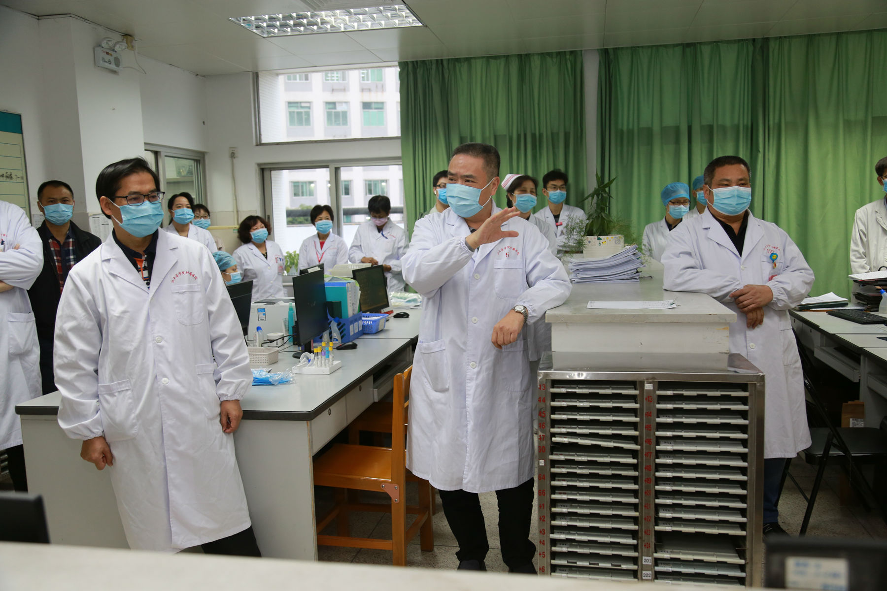 12月4日下午,我院组织开展秋冬季应对新型冠状病毒肺炎感染应急处置演练,旨在进一步做好新型冠状病毒感染预防与控制工作,有效降低新型冠状病毒在医疗机构内的传播风险,规范医务人员行为,提高医务人员防护水平,严格落实终末消毒工作,提升全员疫情应急处置的实战能力。 为确保演练的效果和可行性,保证演练的顺利开展,我院医务科伍方财科长先后组织开展了两场脚本讨论会,对演练脚本进行完善和细化。 本次演练由我院新冠肺炎防控工作领导小组组织指挥,防控工作领导小组全体成员、医务科、护理部、医院感染管理科、门诊部、保卫科、放疗一区、放射科等相关科室人员及物业保洁人员参加演练。医院感染管理科江敏霞科长率领医院感控督导小组成员到演练现场对演练的每一个环节,每一步流程进行督导。 演练开始前,杨院长讲话指出本次演练的主要目的是熟悉应对新型冠状病毒肺炎感染应急处置流程,提高疫情处置能力。 演练场景模拟放疗一区某患者住院期间出现发热+呼吸道症状后,经询问病史,科室讨论后无法排除新冠肺炎的可能。立即请院内医疗救治专家组成员会诊,根据患者临床表现和流行病学史情况,医疗救治组专家无法排除患者新冠肺炎的可能,在此情况下,病房如何将该患者置于缓冲病房隔离?科室医务人员如何落实感染防护措施,落实床单元、环境、物表、空气的终末清洁消毒?该患者要做CT检查时,检查前、检查中、检查后CT室医务人员如何落实院感防控要求,做好个人防护,落实清洁消毒流程?从病例发现、报告、隔离、核酸检测、CT检查、院感防控、医务人员个人防护、终末消毒等一系列过程中,临床科室与CT室医务人员以及物业保洁人员之间配合默契,演练严格按照脚本有序进行,过程顺利。 演练结束后,杨院长指示安排召开专题会议,对本次演练中存在的问题进行分析反馈,切实提高医院疫情防控能力。 疾风知劲草,烈火炼真金。通过演练进一步检验我院相关部门在处置疫情突发时应急处理和医疗救治能力,加强各部门之间协调配合,最大限度降低医院感染造成的危害,进一步提高医务人员对新冠肺炎防护的认识,提高感控意识和防护能力。