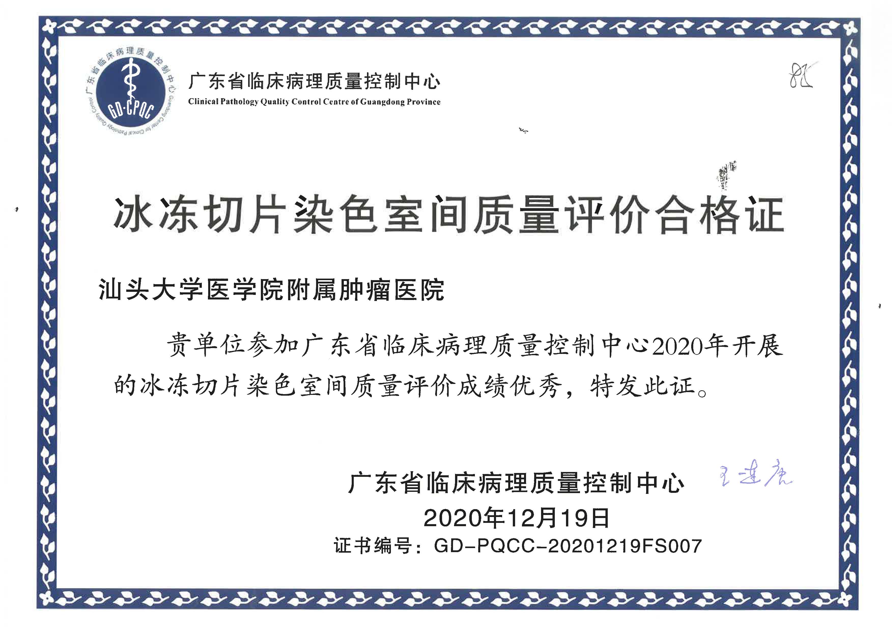 我院冰冻切片染色室间质控喜获粤东唯一一家成绩优秀