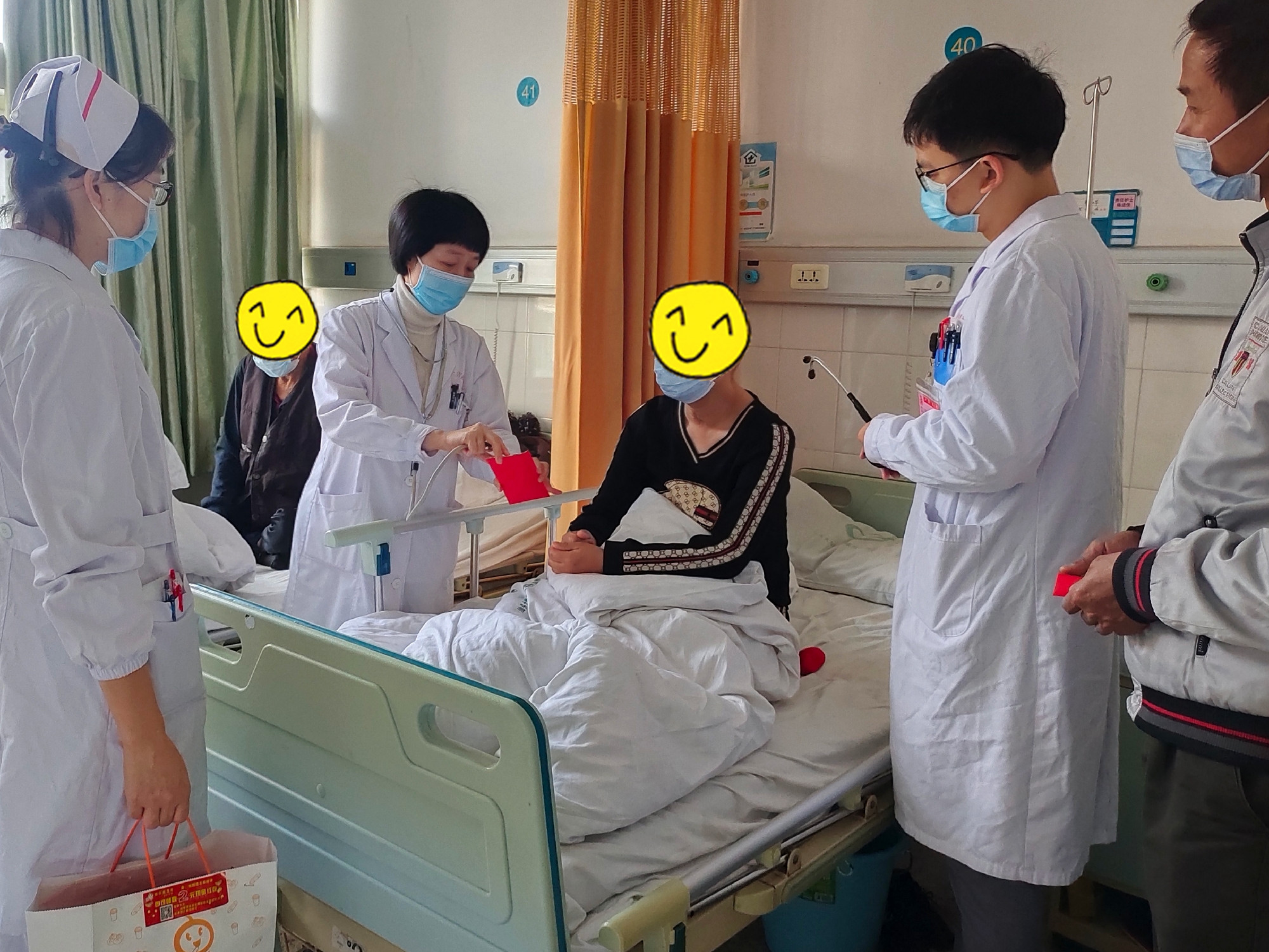 2月8日,林英城副院长、林雯主任、王鸿彪副主任及内科一区全体医师们到病房为患者送温暖。他们为患者送上由白衣天使们准备的“春节红包”,精美的红包里装满了糖果与祝福,寓意每个患者新的一年都能像糖果一般,生活甜甜蜜蜜,并祝愿患者们能早日康复。所到之处无不欢声笑语,暖意融融,洋溢着浓浓的节日气息。 此次活动,内科一区营造温馨愉快的氛围,体现了“以人为本”的服务理念。 (通讯员:李铷) |