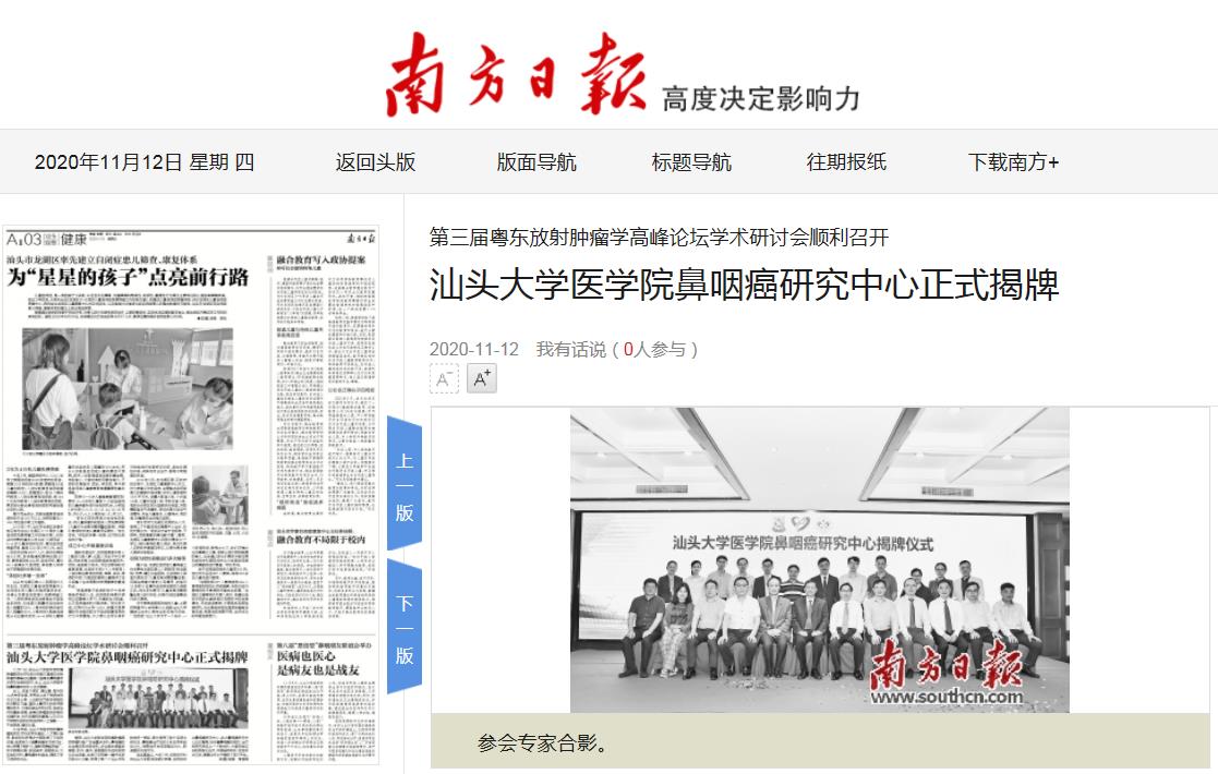 【媒体视角】南方日报:汕头大学医学院鼻咽癌研究中心正式揭牌