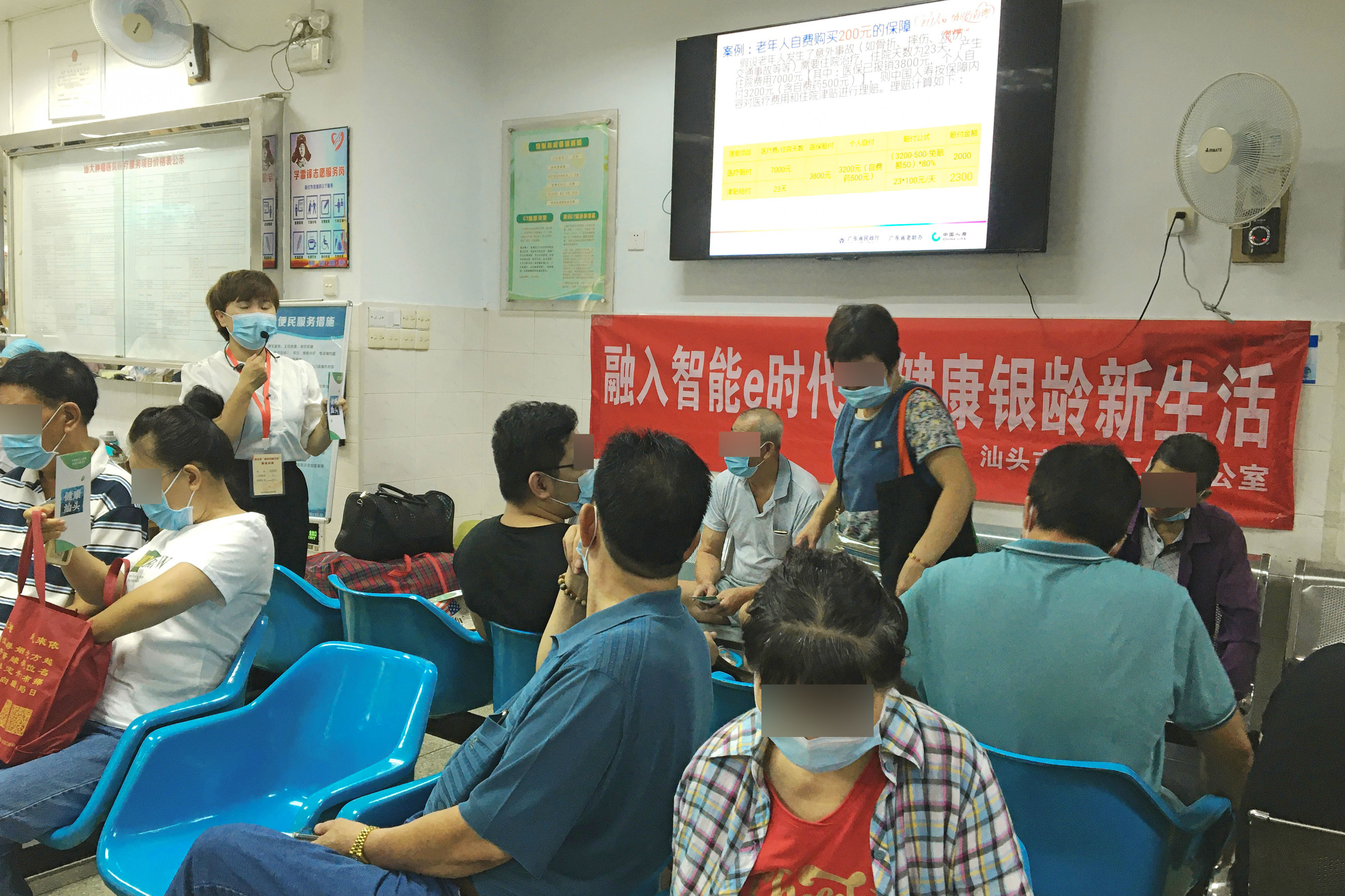 “银龄安康行动”是广东省卫健委、广东省老龄办为积极应对人口老龄化,健全养老保障体系,提高老年人抗风险能力而开展的一项重要工作,是一项“政府显关爱、子女尽孝心、社会献爱心、老年人得实惠”的民生工程。为了让就诊的老年患者能够详细了解这项惠民政策, 2021年8月30日上午, 门诊部联合中国人寿汕头分公司在门诊一楼大厅举行一系列与老年人相关的“意外伤害组合保险”知识讲座。