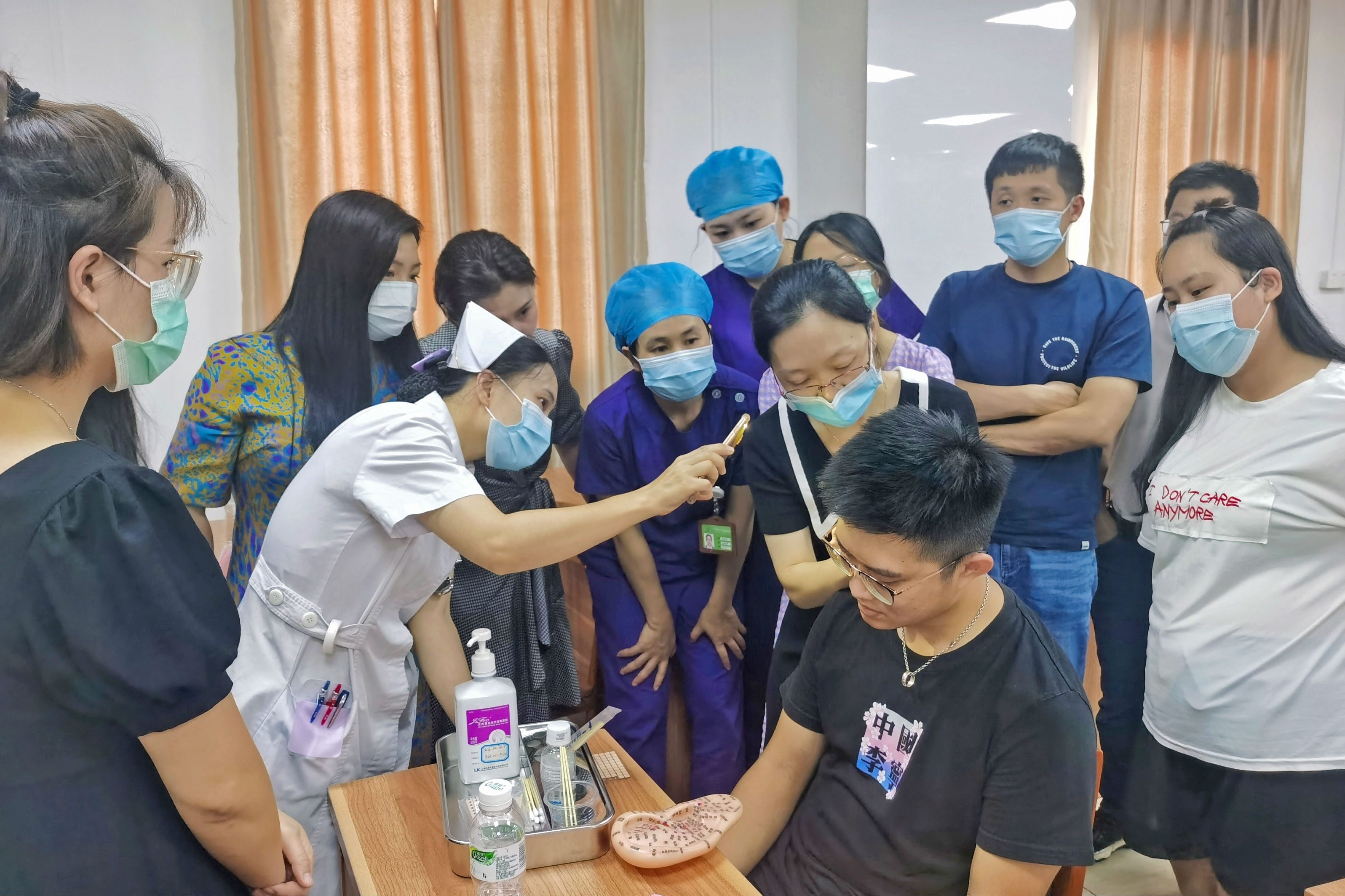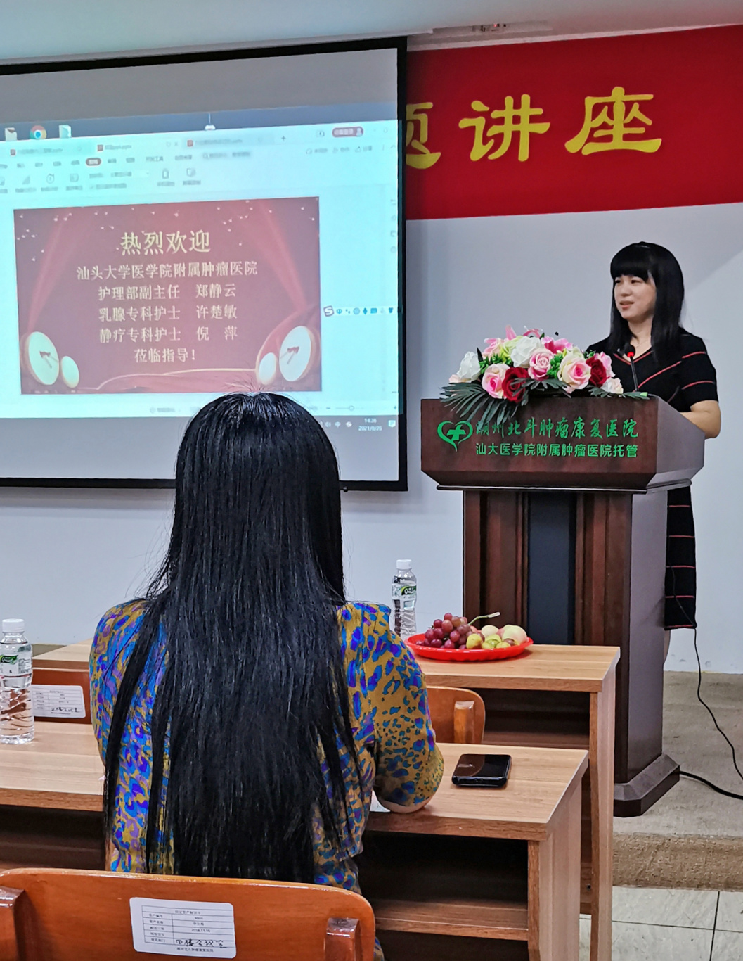 8月26日,肿瘤医院乳腺内科专科护士倪萍主管护师和许楚敏主管护师,前往由本院托管的潮州北斗肿瘤康复医院(以下简称:北斗肿瘤医院)开展耳穴压豆及穴位敷贴技术的讲授与学术交流活动。 近年来, 陆续开展了一系列中医药及传统医学辅助治疗肿瘤患者的创新疗法和技术。医院派驻北斗肿瘤医院的潘春玲护士长在了解到乳腺内科目前开展的耳穴压豆与穴位敷贴技术在止呕方面有显著的成效,既经济又操作简便,希望能在北斗肿瘤医院推广应用该技术,使更多的病人获益。 当天参加学术交流会的专家还有护理部副主任的郑静云等。郑主任表示重返曾与大家一起并肩作战的北斗医院倍感亲切,今天带领着医院两位优秀老师前来传经送宝,希望各位在此次活动上相互学习,有所收获。