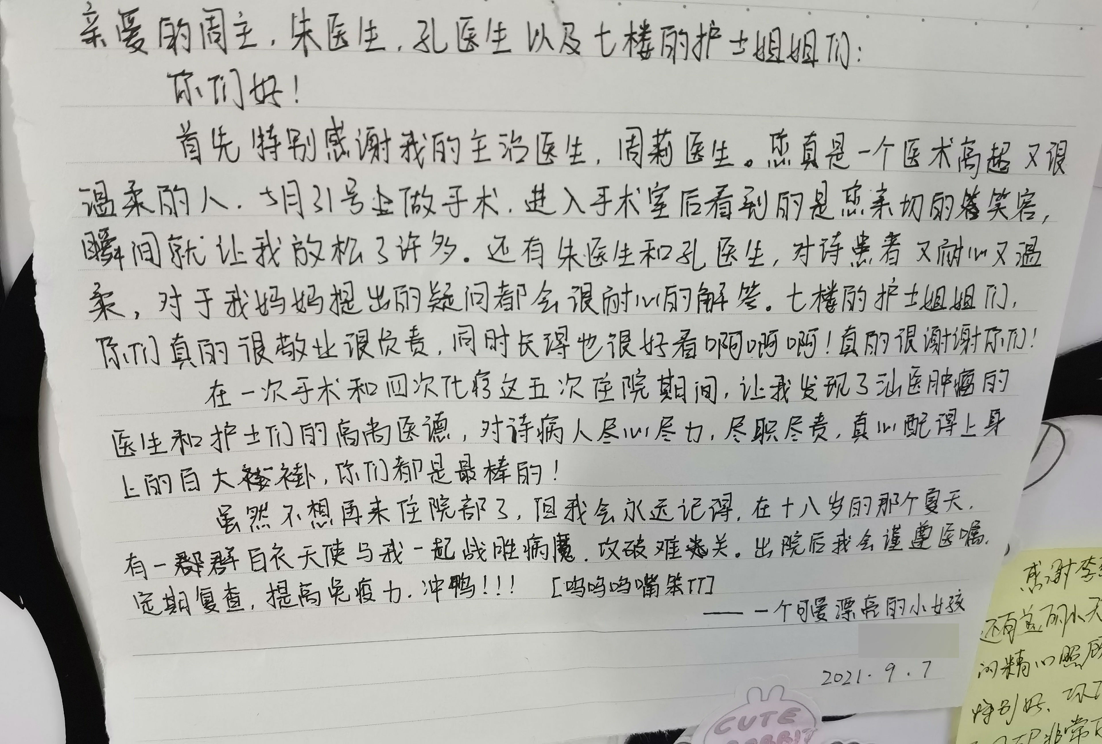 “汕医肿瘤的医生和护士们的高尚医德,对待病人尽心尽力,尽职尽责,真心配得上身上的白大褂,你们都是最棒的。” 今年九月, 外科一区的医护人员收到了一封感谢信,字里行间表达了对外科一区全体医护人员无微不至的关怀和照顾的感激之情,并对妇瘤科周莉副主任、朱安娜医生、孔晓霞医生精湛高超的医疗技术、护士姐姐们认真负责的工作态度给予高度赞誉。 这封来信的作者是今年刚满十八岁却被确诊为左卵巢无性细胞瘤的小莹(化名)。今年3月份小莹开始出现腹胀的情况,伴有食欲下降。5月25日前来医院门诊就诊,并于28日收入我院外科一区接受进一步治疗。入院后,患者和家属的情绪都十分紧张,医生及时耐心地与他们沟通解答问题,消除家属的疑虑,缓解患者及家属的情绪。 有一天早上护士长查房时,发现小莹在看书,一聊才得知小莹是今年的高三学生,她还想着做完手术去参加6月份的高考,所以充分利用时间备考冲刺着。外科一区的医护团队知道后,纷纷为她加油打气,希望小莹能如愿参加高考。 “进入手术室后看到的是您亲切的笑容,瞬间就让我放松了许多。” 5月31日小莹进行手术治疗。刚开始进入手术室时,小莹有些许的紧张,但在医生们的安抚下稳定了下来。之后在医生们高超的医疗技术下,手术顺利地完成。 在外科一区医护团队的精心护理下,小莹恢复良好,但由于面临术后化疗,再加上其他原因,小莹只能遗憾地放弃参加今年的高考。 六月份小莹开始接受化疗治疗,历经四个疗程,最终于九月份圆满完成整个治疗方案。其实在整个治疗期间,小莹经历了手术后的伤口疼痛、各种不适,化疗后的恶心呕吐、脱发、留置PICC管后出现的血栓等不良反应。但这位18岁的小妹妹,犹如一株顽强生长的小草,没有一丝退缩,在外科一区医护人员的安抚及鼓励下,积极配合治疗。与我们遇到的同龄孩子相比,小莹似乎多了一份坚强与沉着。 “虽然不想再来住院部,但我会永远记得,在十八岁的那个夏天,有一群白衣天使与我一起战胜病魔,攻克难关。” 在治疗结束后,小莹特意写了这封感谢信,表达她真挚的情感和满心的感激。我们也永远会记得有一位如此可爱好学的小妹妹,希望在明年的夏天能等来你的好消息,愿你高考顺利。 一份真诚换来一份信任,一份服务收获一声感谢。一封短短的感谢信,象征着医患情深,收获的不仅仅是一份荣誉、更是一份期望、一份鞭策、一份信任,肿瘤医院的医护人员将以此为动力,致力于为每位患者提供更加优质的服务。