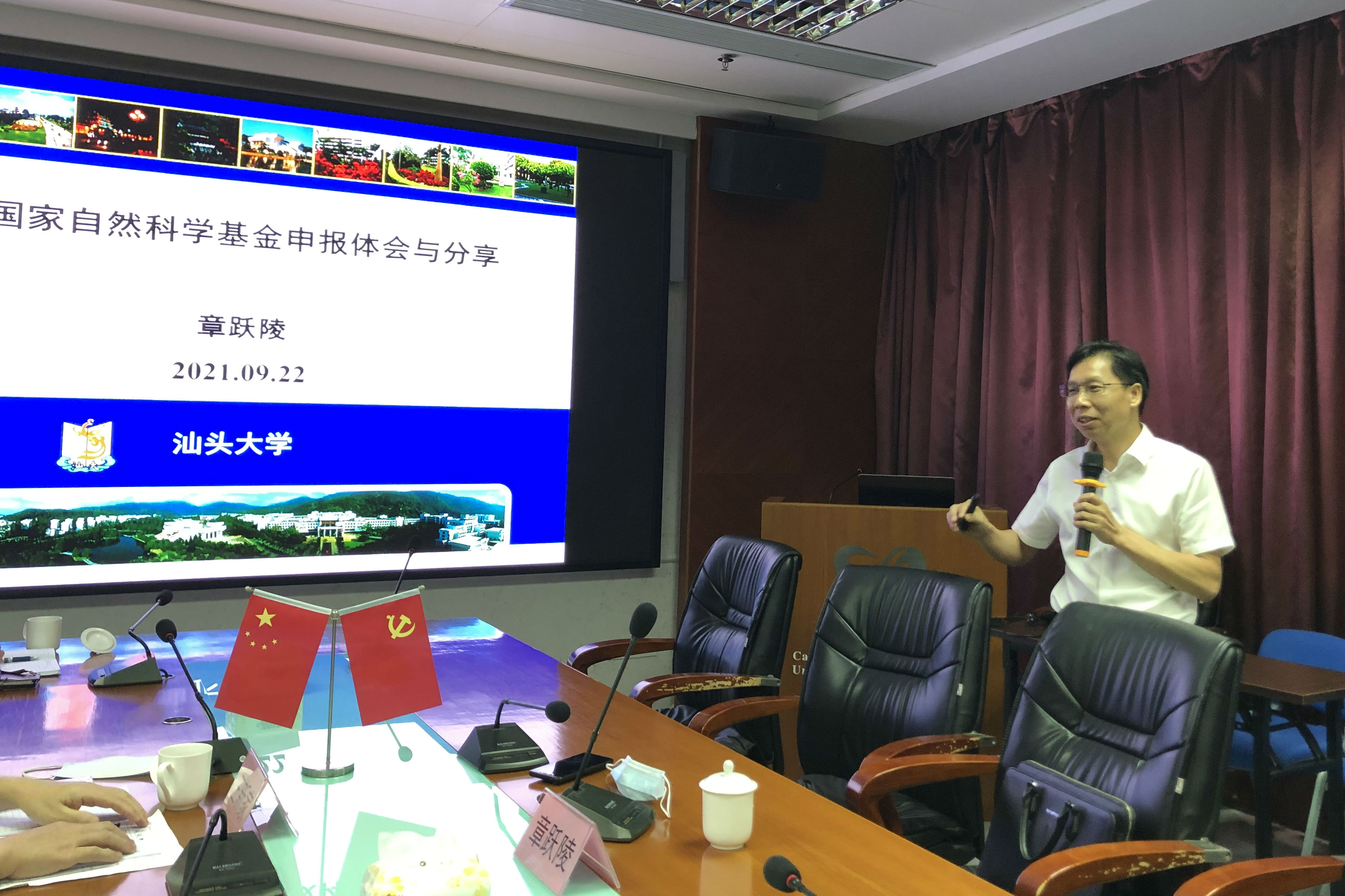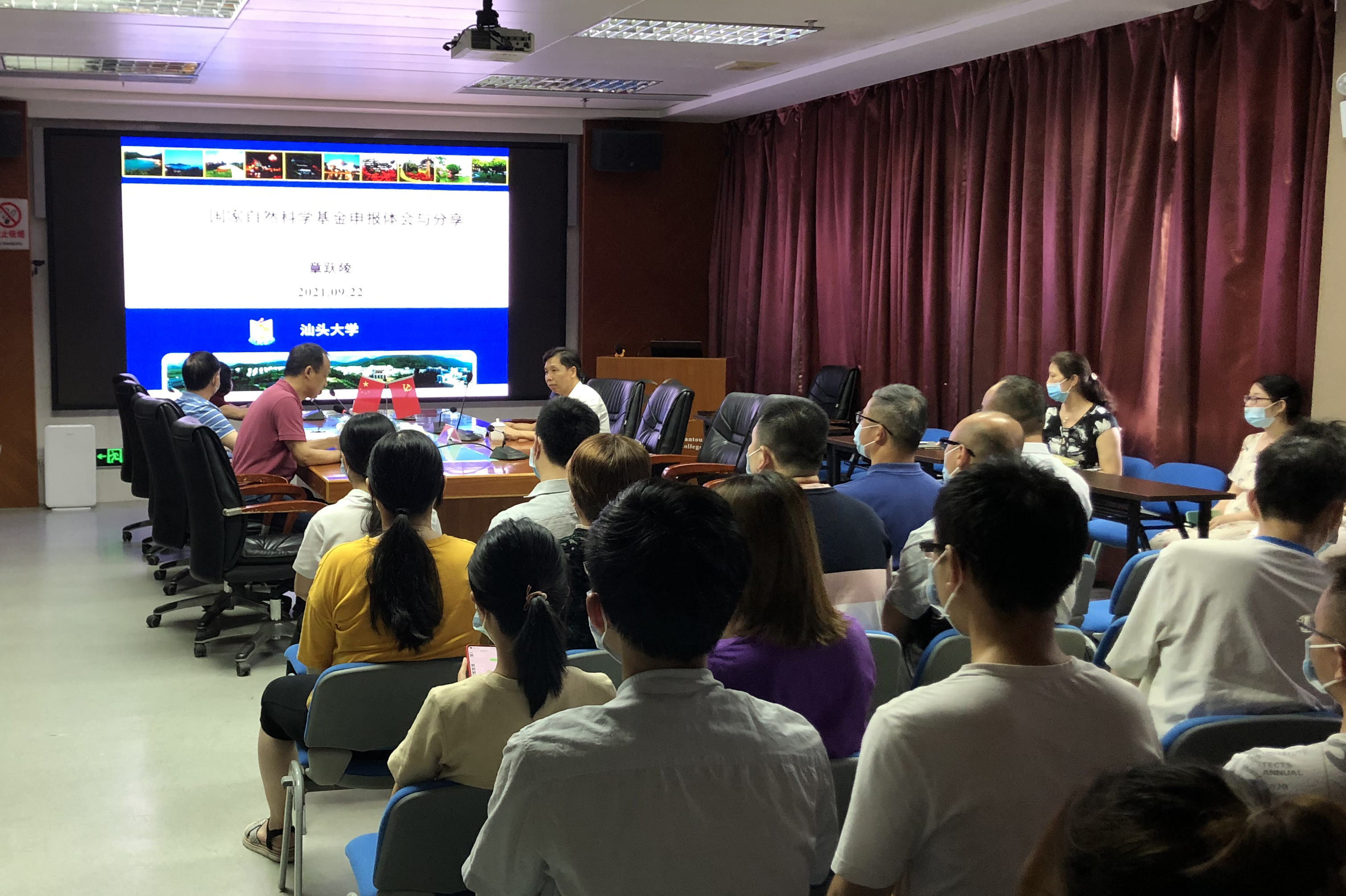 9月22日下午, 在门诊部六楼会议室召开2022年国家自然科学基金(以下简称国基金)申报辅导会,汕头大学理学院院长章跃陵教授应邀作经验分享和申报前辅导。会议由李从铸副院长主持,王新家院长出席会议,部分科室主任、科研骨干和优秀青年人才参加会议。