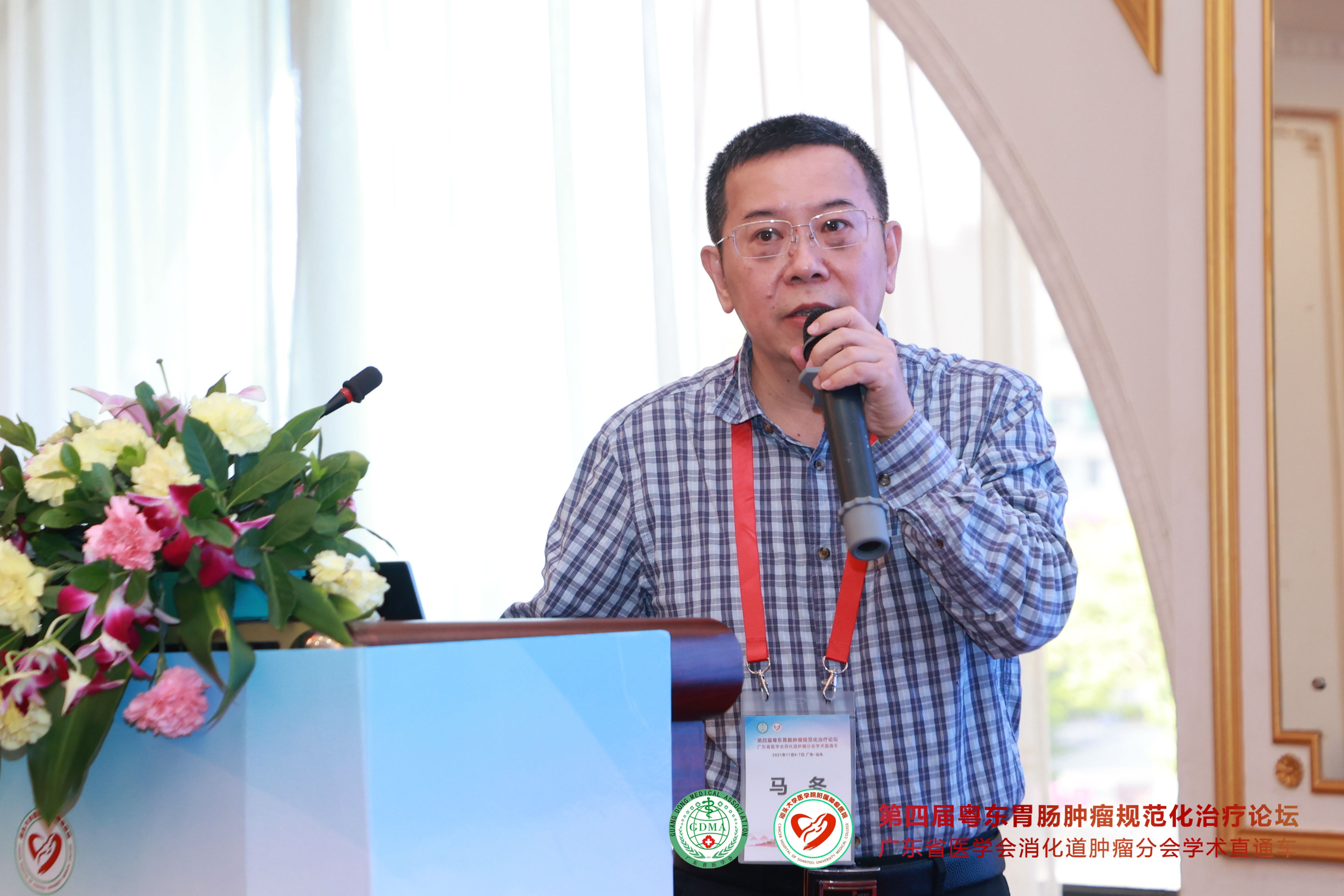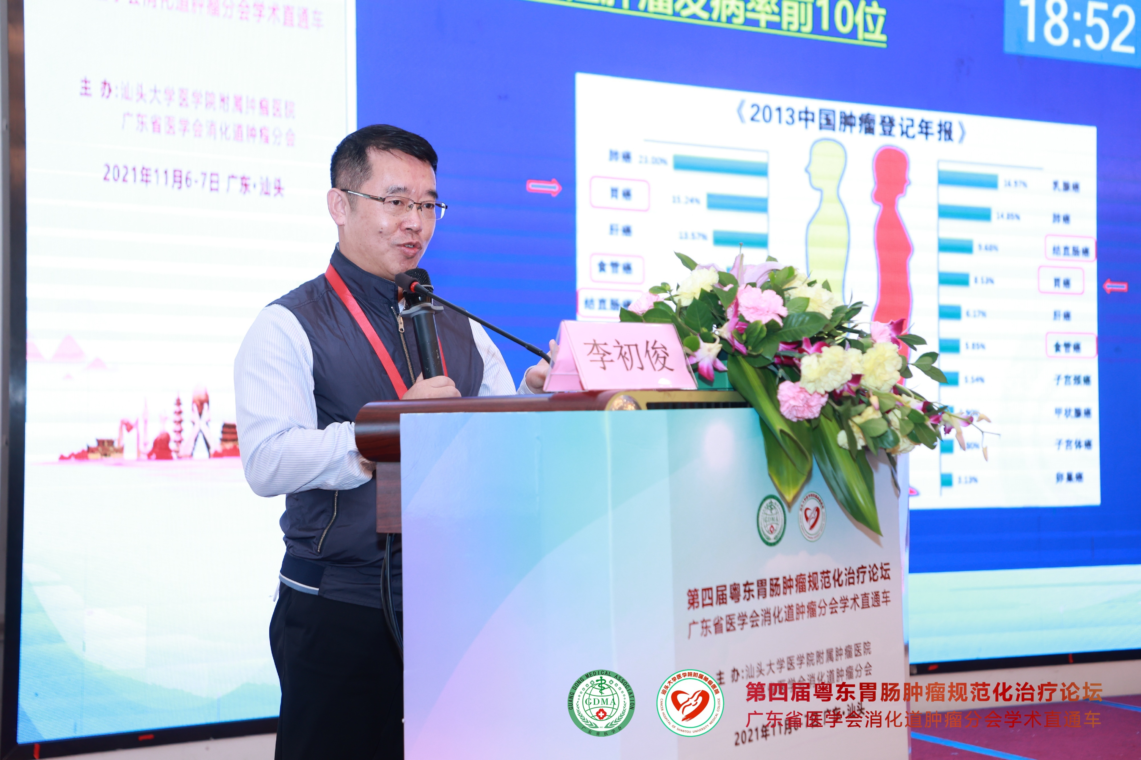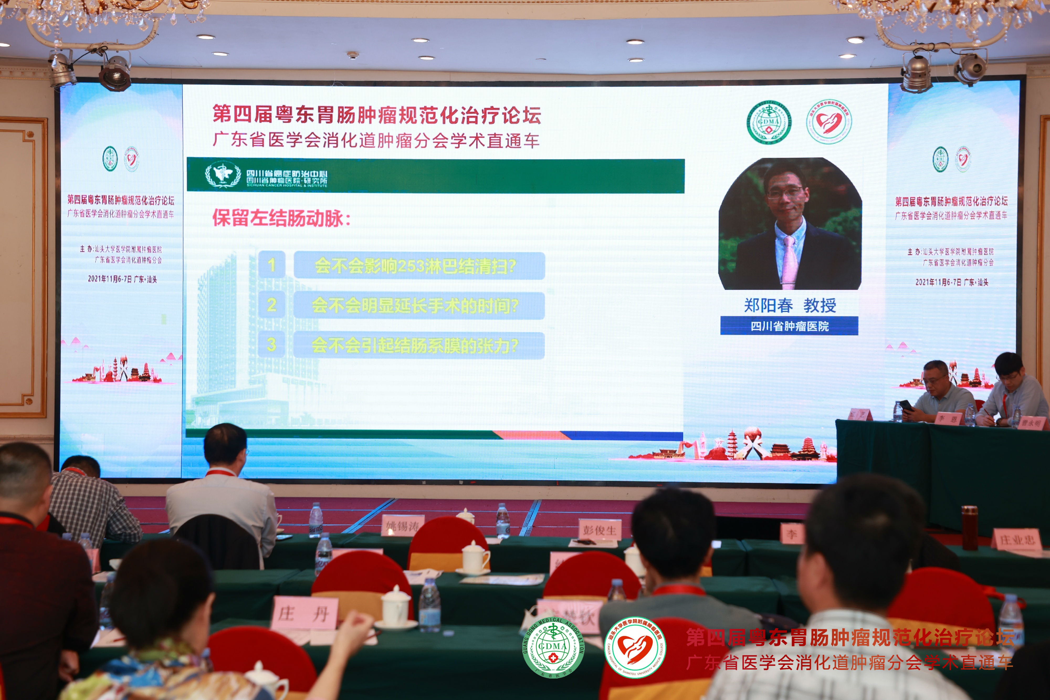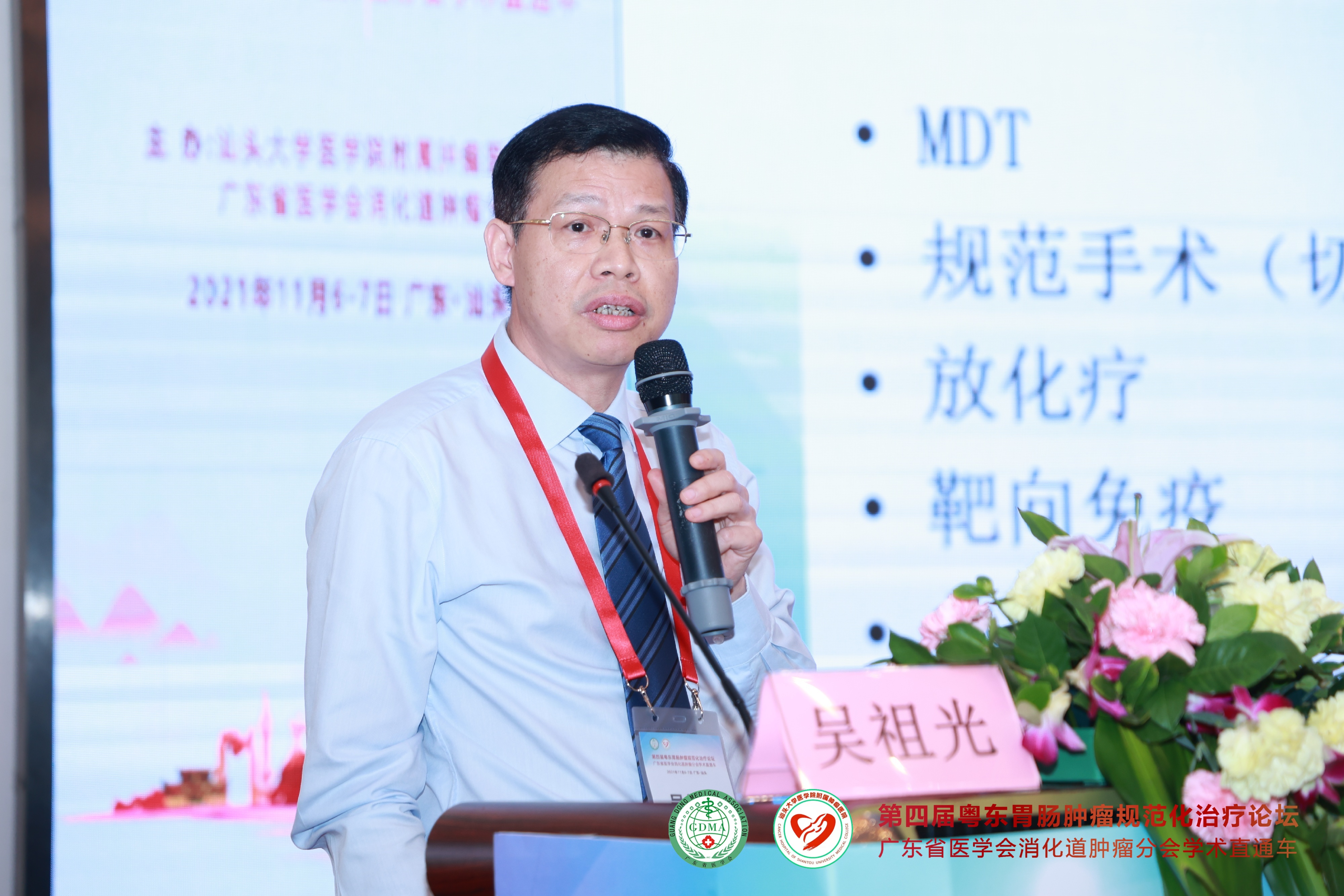 2021年11月7日,由 与广东省医学会消化道肿瘤分会联合主办的“第四届粤东胃肠肿瘤规范化治疗论坛—广东省医学会消化道肿瘤分会学术直通车”在汕头市金海湾大酒店隆重举行。广东省医学会消化道肿瘤分会主任委员彭俊生教授与我院党委姚锡涛书记担任大会主席,我院胃肠外科副主任庄业忠担任执行主席。 会议采用现场和网络直播“线上+线下”相结合的形式进行,为全国消化道肿瘤领域同道提供高质量的学术盛宴。会议期间全程严格落实疫情防护措施,进场人员需佩戴口罩并出示健康码,每个座位之间保持1米距离。 开幕式 上午8点30分,大会正式开始。我院党委书记姚锡涛首先发表讲话,他指出潮汕地区的胃肠癌发病率在所有恶性肿瘤中位于前列,通过学术交流可以进一步提高粤东地区胃肠肿瘤的诊治水平。彭俊生教授发表热情洋溢的致辞,勉励大家共同努力,为粤东地区消化道肿瘤患者提供更好的服务。庄业忠主任对远道而来参会的专家表示衷心的感谢并宣布会议正式开始。 姚锡涛书记发表讲话 彭俊生教授致开幕辞 庄业忠主任致辞 全体专家合影 第一议程 开幕式后,各项议程正式开始。第一议程由彭俊生教授讲授《腹腔镜胃癌根治术的质量控制》,通过介绍胃癌淋巴结清扫的要点、基本路径等,从而保证胃癌手术的同质化。 广东省人民医院马冬教授讲授《2021ASCO胃癌治疗进展》,通过盘点晚期胃癌各线治疗,给予我们最新的学术前沿分享。 中山大学附属肿瘤防治中心的丁培荣教授结合相关病例,为我们讲解了《肠癌免疫治疗新进展》,其中最令人印象深刻的是一例结肠癌术后肝多发转移的病人,其微卫星状态为MSI-H,仅通过免疫治疗获得2年的无病生存期,疗效显著,令人鼓舞。 广东省中医院刁德昌教授讲授《腹膜后巨大肿瘤的术前评估与手术策略》,通过一个个高难度的病例,显示了年轻专家的担当与责任,他强调腹膜后肿瘤应该以手术治疗为主,术前充分评估,术中做到整块切除、控制出血并保全重要脏器功能,这样才能最大程度提高治疗效果。 本节议程由李威教授、张涛教授、林菁教授和练磊教授主持,参与讨论的嘉宾就相关的议题展开激烈的讨论。 第二议程 第二节议程由汕大附一胃肠外科陈君填教授、曾永明教授,梅州市人民医院胃肠外科李恩教授和汕头大学附属肿瘤医院消化肿瘤内科副主任江艺主持。 远在四川省肿瘤医院的郑阳春教授通过网络直播的形式,根据自身经验体会,讲授《腹腔镜直肠癌根治术中左结肠动脉的解剖变异与保留技巧》,他主张在腹腔镜直肠癌根治术中保留左结肠动脉,以此改善结肠残端的血运,并且认为不会影响253组淋巴结的清扫,也不明显增加手术时间。 中山大学附属肿瘤医院邱妙珍教授为我们解读《结直肠癌改良三药方案的临床应用》,讲授在提高三药方案疗效的同时,如何更好地控制其不良反应。 汕头市中心医院王小忠教授结合自身经验,从清扫范围、入路及顺序等方面讲授《腹腔镜胃癌胰腺上区淋巴结清扫体会》,他认为胃癌胰腺上区淋巴结的清扫要做到“吊肝、断肠、显露好”,遵循血管导向,层面优先的原则,并且术前要进行CTA评估。 梅州市人民医院吴祖光教授强调了胃癌手术中淋巴结分拣的重要性,他认为规范的淋巴结分拣是开展胃癌规范化诊治的先决条件。要做到胃癌的规范化治疗,就必须成立专门的分拣团队,标准化分拣流程,做好质量控制。 第三议程 第三节议程由庄业忠、陈维荣、陈蕾及陈实四位专家主持。 中山大学附属第六医院杨祖立教授讲授基于根治、保功能的早期胃癌手术方式的选择,他认为改善胃癌患者预后最重要的是要做到早诊早治。 李力人教授同样以线上的形式,讲授了大肠癌的筛查方法以及高风险人群的甄别,并强调要提高早癌筛出率,就必须提高人民群众的防癌意识。 叶文锋教授分析了消化道肿瘤患者营养不良的原因,以及围术期营养支持的作用等。围术期全程营养管理,可改善肿瘤患者的营养状态,提高生存期。 李初俊教授讲授了胃癌的筛查策略,并推荐对非侵入性检查筛查出的高危人群进行内镜检查。 第四议程 第四节议程由彭云恒、李东升、章斐然三位专家主持。 蔡高阳、谢澳斯、林佳锐三位医生带来了精彩的病例分享。 其中最精彩的莫过于林佳锐医生的病例分享,一位年轻的妈妈,初诊乙状结肠癌伴肝多发转移,经我院多次多学科会诊讨论后,采取术前转化治疗使肿瘤降期,随后进行原发灶+转移灶根治性切除,术后辅助化疗的治疗模式,疗效显著。1年过去了,这位年轻妈妈仍然处于无瘤状态,续写生命的奇迹,不仅展示了多学科团队的重要作用,同时也彰显医者仁心的温情。
