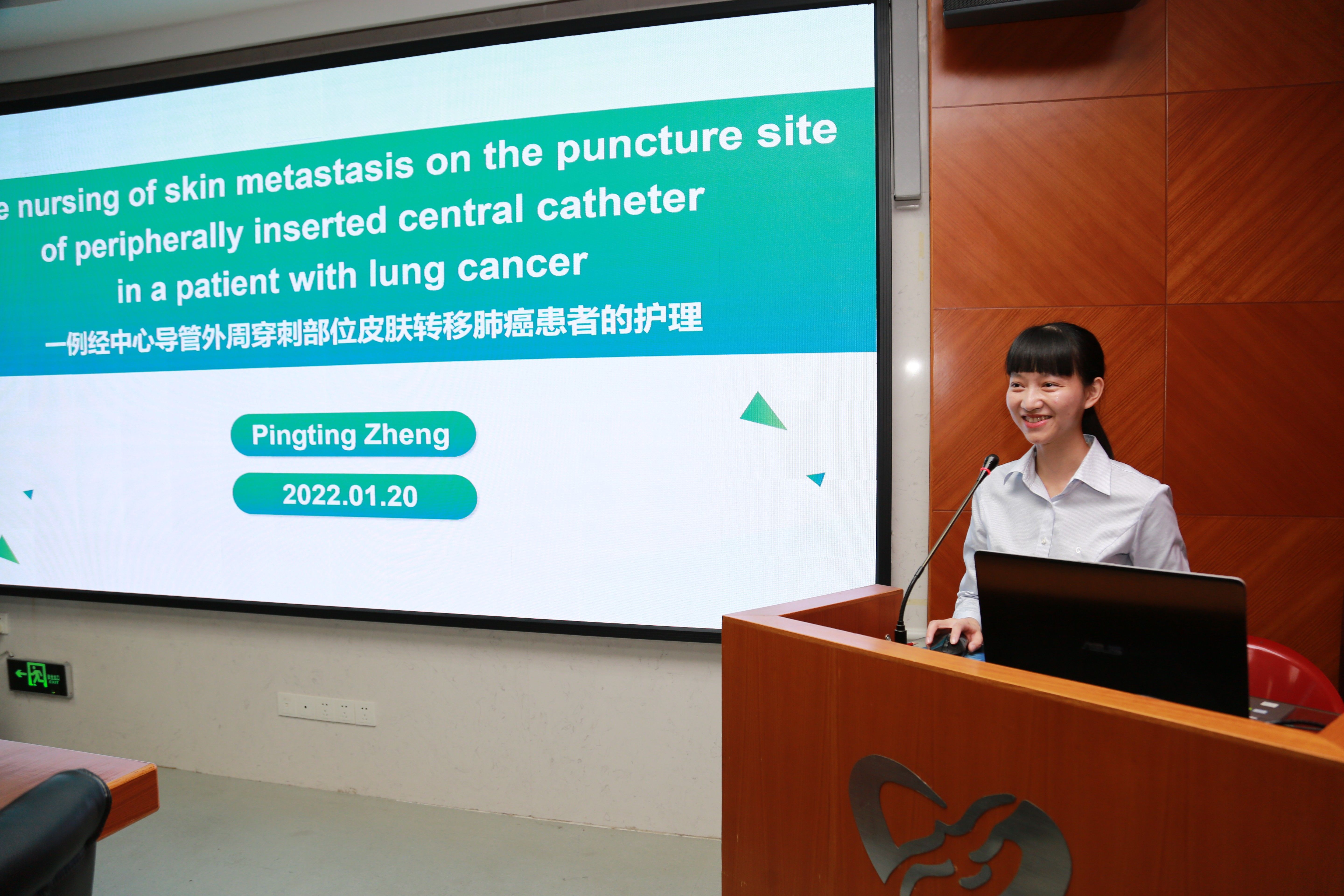 ICU郑娉婷主管护师演讲的题目为“The nursing of skin metastasis on the puncture site of peripherally inserted central catheter in a patient with lung cancer”。她从护理的角度深入浅出地探讨了PICC穿刺点皮肤转移癌的发生原因、临床表现及护理,对我院PICC维护及安全管理有很大的启示意义。