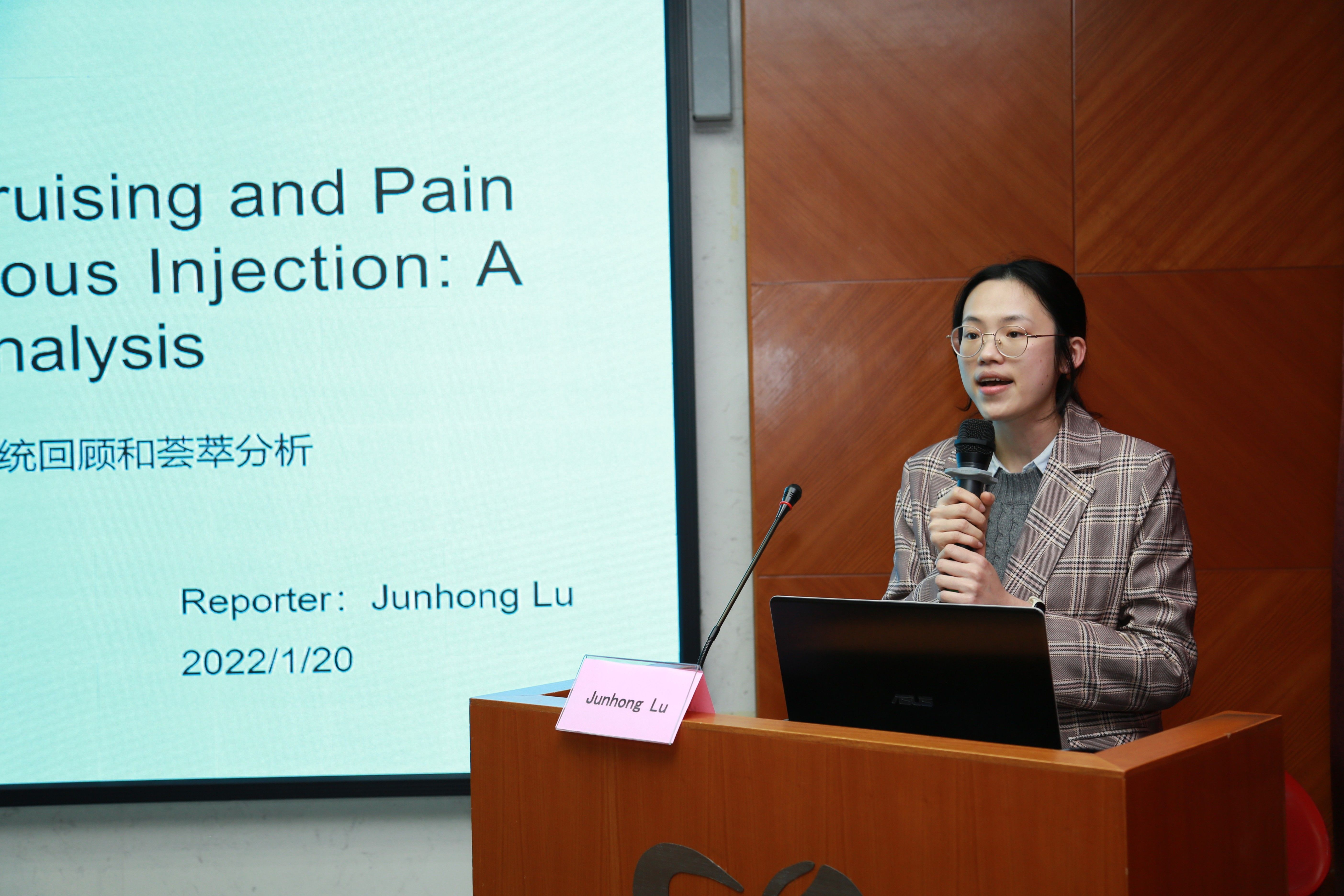 来自内一区的卢俊红护理师介绍的主题是“Effect of Cold Application on Bruising and Pain Following Heparin Subcutaneous Injection: A Systematic Review and Meta‐Analysis”,她对冷疗法作用于低分子肝素钙皮下注射后的皮下出血和疼痛的效果进行了深入分析,并以此为基础,分享了自己对这个领域的研究设计的看法和今后相关领域研究的设想。