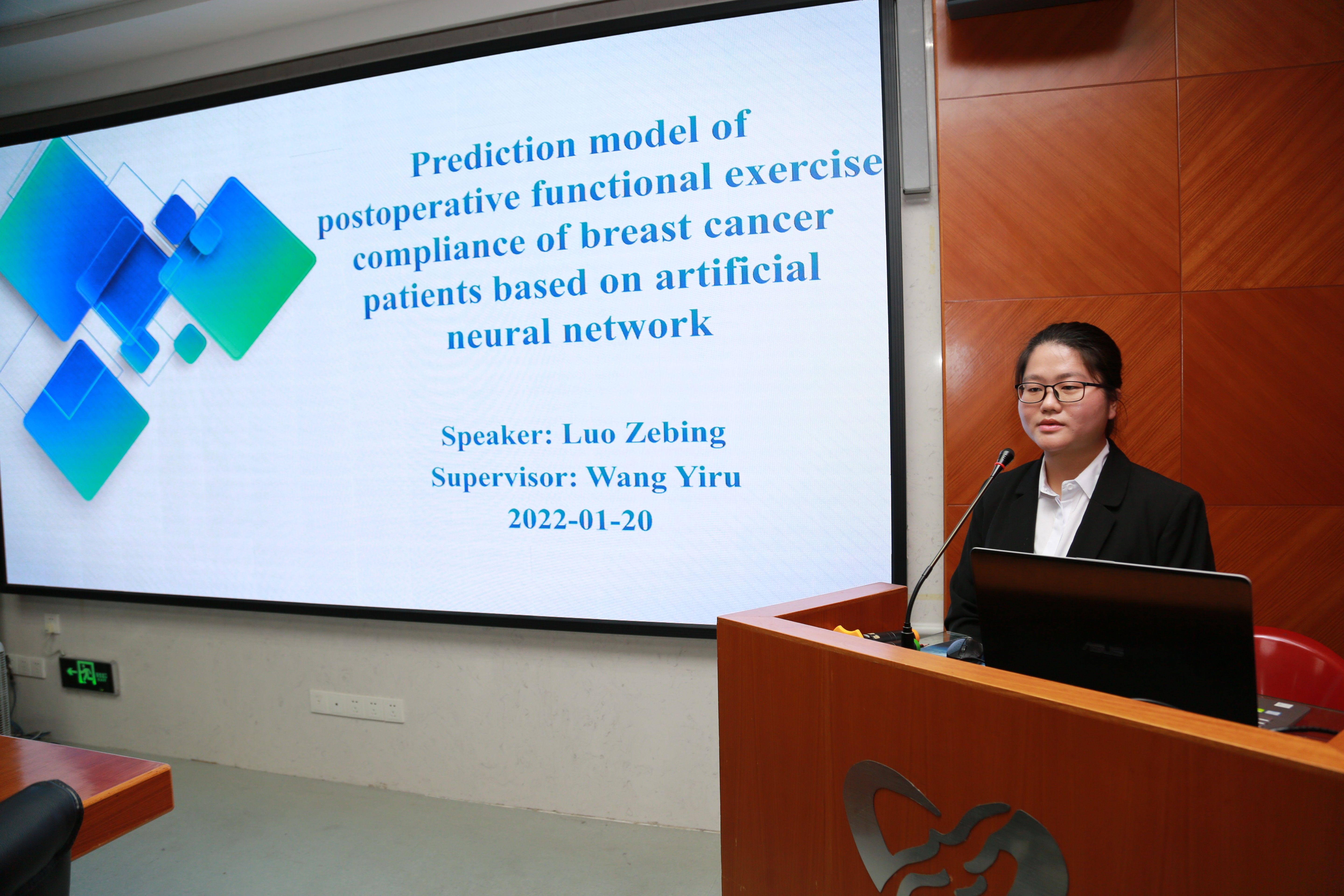 最后由王逸如主任的研究生罗泽槟同学分享她的课题“Prediction model of postoperative functional exercise compliance of breast cancer patients based on artificial neural network”,她详细介绍了其构建乳腺癌患者术后功能锻炼依从性预测模型的过程,并对人工神经网络(Artificial Neural Network,ANN)的应用进行了详细的介绍,引起了现场听众极大的兴趣,点评嘉宾也针对其研究进行热烈的讨论并给予了宝贵的意见,使讲者和听众受益颇深。