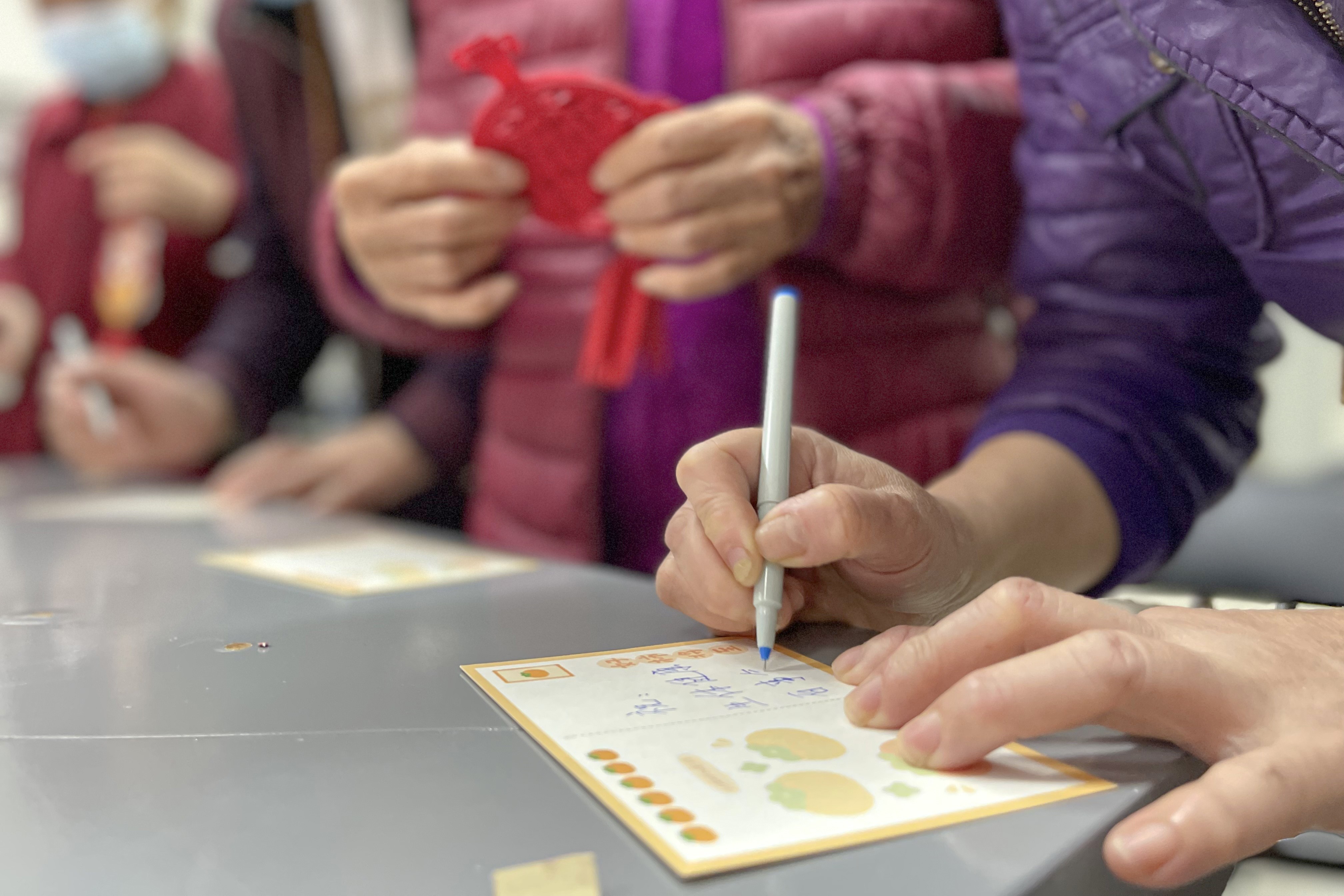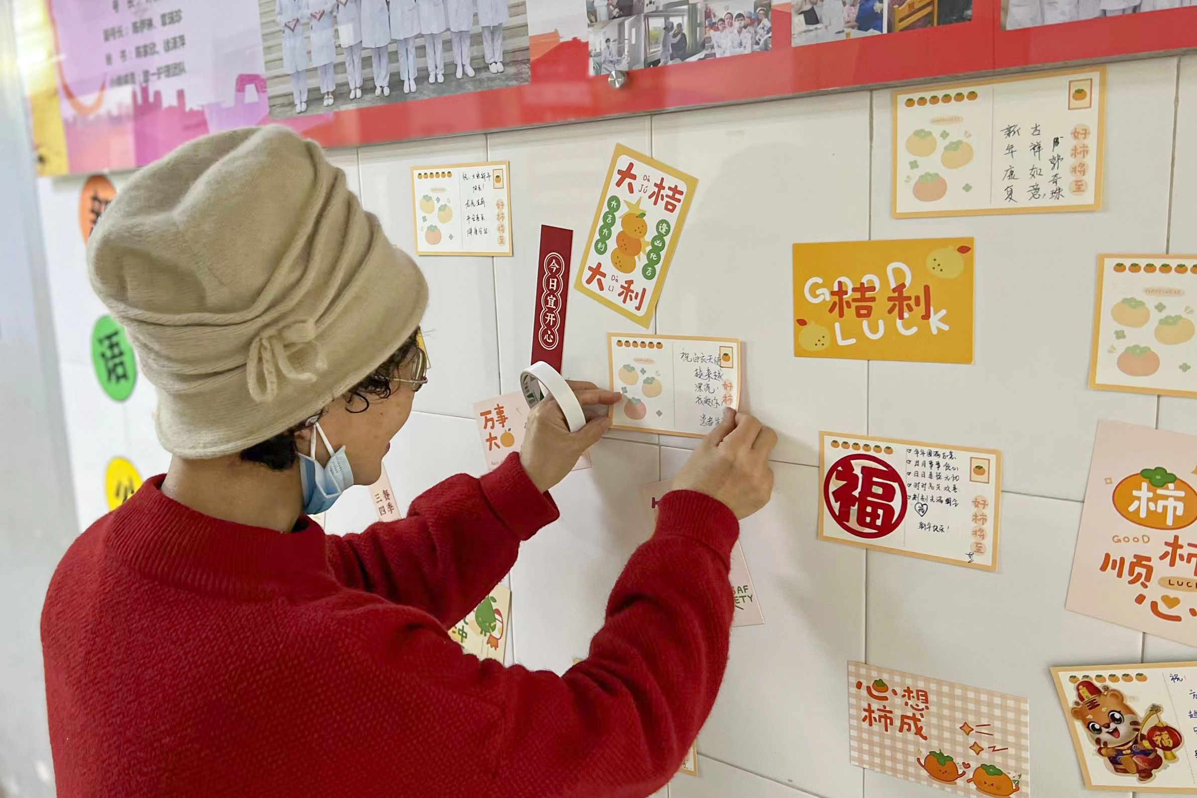此次活动医护患共同参与,制灯笼,插春花,写贺卡,大家一起把来年的新愿贴在心愿墙上,寓祝新年国泰民安,身体健康。由于还有很多患者在治疗无法亲临现场参与活动,许晓丹护副士长带领送“福”小分队,下病房让患者抽取新春心愿卡并送上最真诚的祝福。