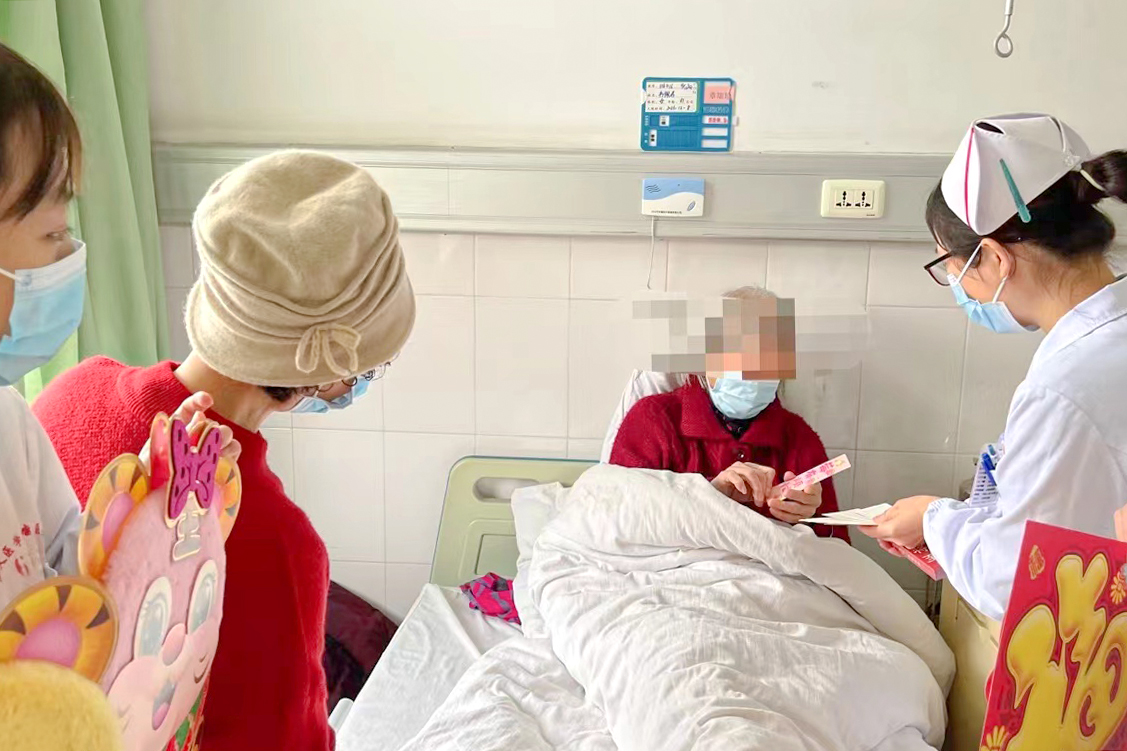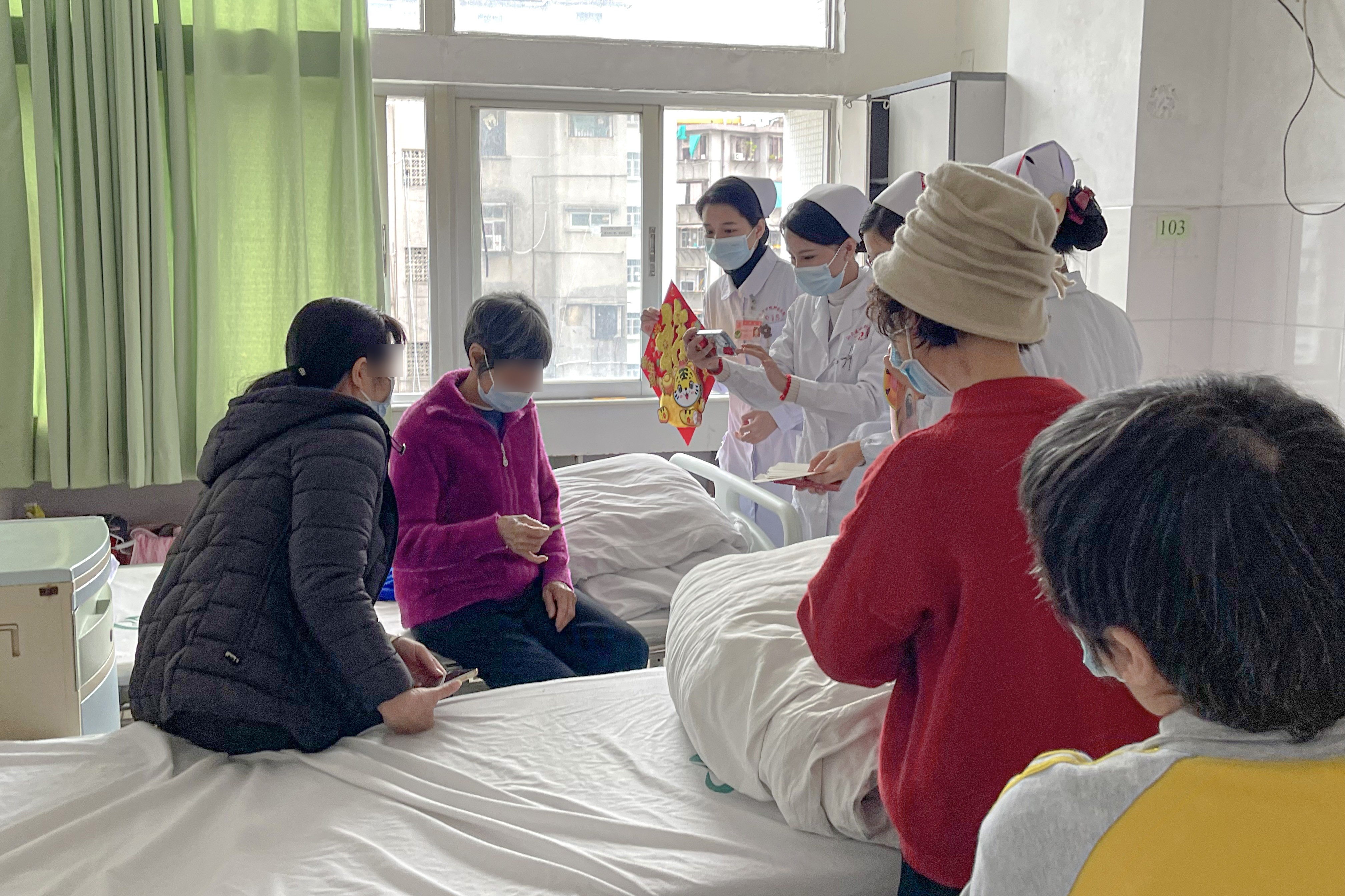 红红的福字,辉映幸福的光芒;声声的笑语,回响每间病房。科室里洋溢着浓浓的年味,大家其乐融融拍照留念。患者及家属纷纷表示感谢,陈姨竖起了大拇指对我们的活动表示了大大的肯定,“频繁的入院让很多人忘记了生活,多亏你们暖心的活动让我们忘却了烦恼,放松了心情,更树立了战胜疾病的信心。”