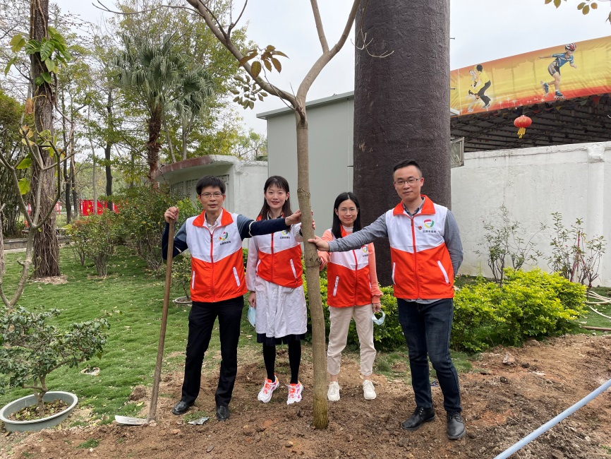 左起为:药师邱国栋、药学部主任朱志伟、药师郑洁婷、药师吴佳欢 本次植树活动提倡人与自然和谐共处的理念。活动当天,志愿者代表们铲起鲜土,扶直树苗,培植新土,浇水灌溉,在中山公园一起种下了五棵代表五家医院团队的公益树,为公园的春天增添了一丝丝的绿意。大家给予小树苗众多祝福并纷纷拍照留念。