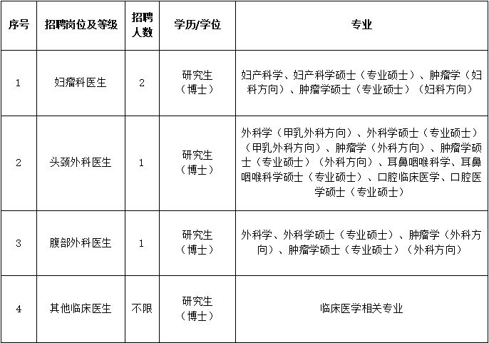 是粤东地区唯一一所集预防、医疗、教学和科研为一体的非营利性三级肿瘤专科医院。在省、市各级领导的关心支持和李嘉诚先生的鼎力资助下,医院于1994年11月28日正式成立并得到快速发展。全院职工共754人,高中级职称411人,博、硕士学历195人。医院现有病床704张,设有放疗科、胸部外科、乳腺外科、腹部外科、头颈外科、妇瘤科、中西结合科、呼吸肿瘤内科、消化肿瘤内科、乳腺肿瘤内科、淋巴瘤与血液肿瘤内科、生物治疗科、泌尿外科、介入治疗科、家庭病床科、重症监护室、核医学科等30多个临床和医技科室。开展各种肿瘤的规范化综合治疗和研究,取得良好的效果。乳腺癌、鼻咽癌、食管癌等潮汕高发常见的肿瘤疗效达国内先进水平,医疗技术水平在粤东地区享有盛誉,已成为粤东地区的肿瘤防治中心。 1996年食管外科被评定为汕头市“4115科教兴医”重点专科,2005年医院成为国家药物临床试验机构。肿瘤学荣获广东省“十二五”医学重点学科和第九轮广东省优势重点学科,拥有省内唯一的 “广东省乳腺癌诊治研究重点实验室”,内科为广东省首批“癌痛规范化治疗示范病房”,肿瘤科和胸外科获广东省临床重点学科。2003 年成为肿瘤学硕士学位授权点,2012年成为汕头大学医学院二级学科肿瘤临床医学博士点和博士后流动站。设立广东省食管癌研究汕头分中心、汕头大学医学院甲状腺外科研究中心及汕头大学医学院临床药学研究中心。 作为一所定位为国际化研究型肿瘤防治中心的肿瘤专科医院,医院一直重视国际交流和学习。医院长期与斯坦福大学、剑桥大学、波恩大学、密歇根大学、香港大学、香港中文大学、香港理工大学等国际一流的高等院校和肿瘤研究中心保持紧密联系与合作,以食管癌、鼻咽癌、乳腺癌为重点,积极开展国际性、多中心、前瞻性的临床试验和科研合作。 医院积极拓宽出国出境访问学习途径,支持、选派业务骨干出国进修、访问及学术交流。定期选派医师到美国斯坦福大学癌症中心、美国纽约Memorial Sloan-Kettering 癌症中心、香港中文大学威尔斯亲王医院、加利福尼亚大学旧金山分校、澳大利亚墨尔本大学学习进修。同时,邀请国外知名专家到医院开展学术交流,不断引进新技术、新理念,为提高肿瘤诊治水平起到了积极的促进作用。 在汕头市委、市政府及李嘉诚基金会的鼎力支持下,我院获得易地升级重建建设用地150亩,座落于汕头大学对面的汕大智慧城。医院易地重建项目(一期)已于2019年9月正式启动,计划2022年底竣工。新医院将以高起点、前瞻性、有特色、国际化的视野进行整体规划,拥有床位1500张,具备PET-CT、MRI、TrueBeam等世界一流诊疗设备,建成专业项目齐全、人才结构合理、技术先进、学术水平高、以乳腺癌、食管癌、鼻咽癌三个专科为重点,以肿瘤学硕士、博士点为人才摇篮的国内一流、国际知名,临床、科研、教学并举的现代化肿瘤防治中心。 为满足高水平医院发展的需要,现招聘博士若干名,竭诚欢迎您来加盟! 一、招聘要求 1、遵纪守法,具有较强的组织纪律观念,无违纪违法记录; 2、作风正派、敬业奉献,具有良好的思想政治素质和职业道德水平; 3、具有正常履行职责的身体条件和符合岗位要求的工作能力; 4、年龄40周岁以下; 5、完成住院医师规范化培训; 6、具有医师资格证。