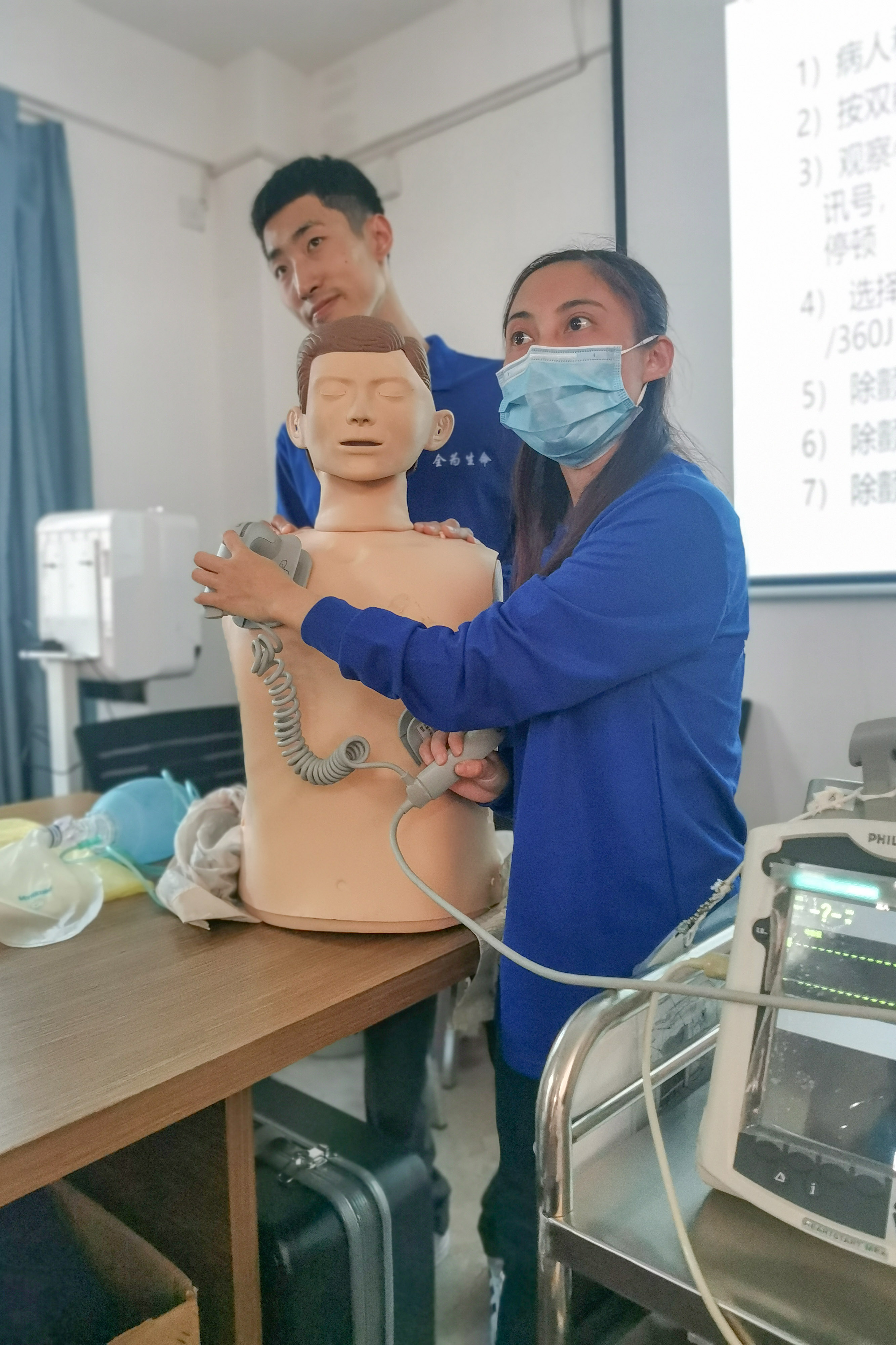 随后,两位老师采取了理论知识和实践操作相结合的方式,对整个抢救操作流程进行操作演示,进一步向大家详细地讲解2020年AHA心肺复苏指南相关要求、操作关键点及注意事项。参训人员也轮流进行实际操作演练,两位老师在旁一一指导,让参训人员掌握了更加规范的救护知识,在突发事件现场能够正确使用救护知识和技术。培训现场学习氛围十分热烈。