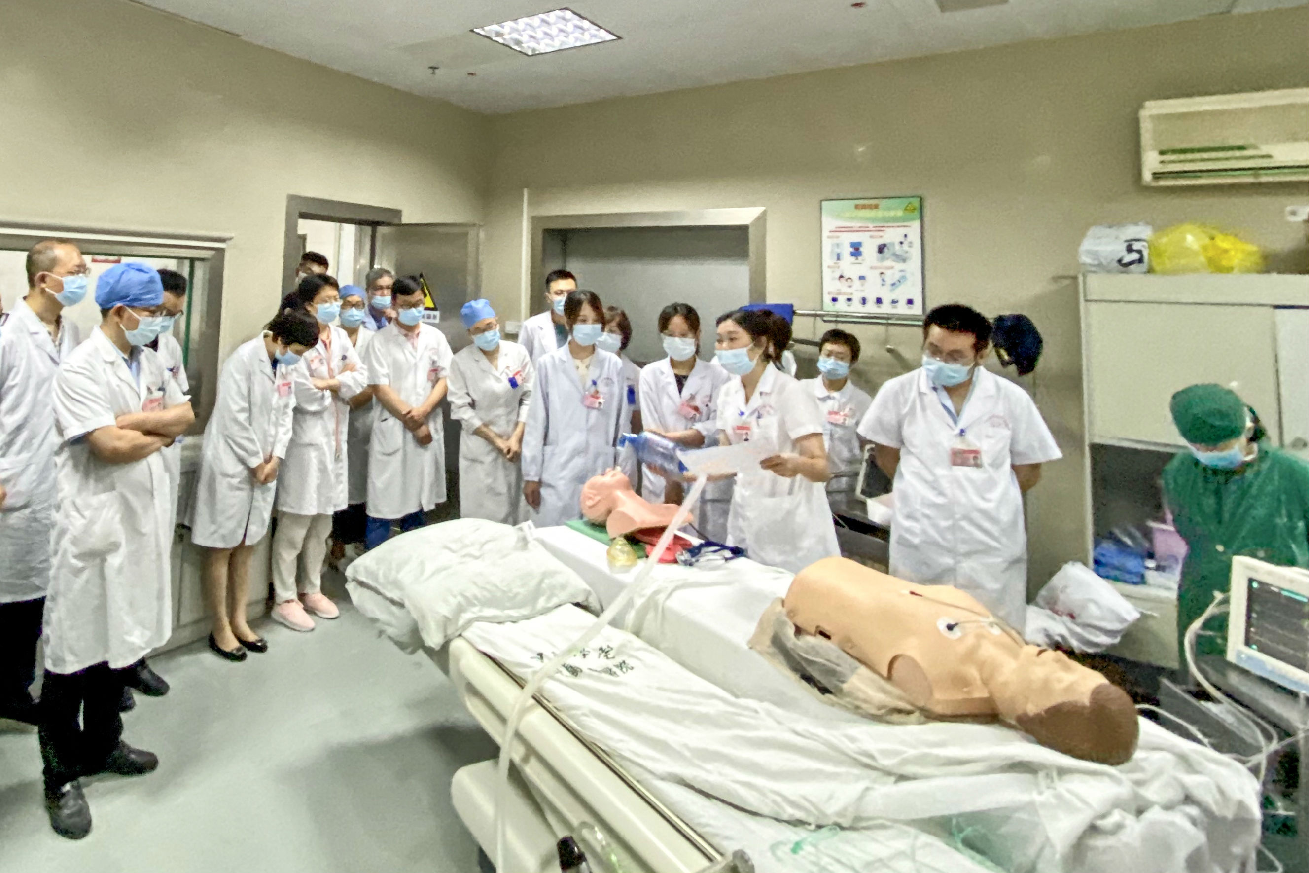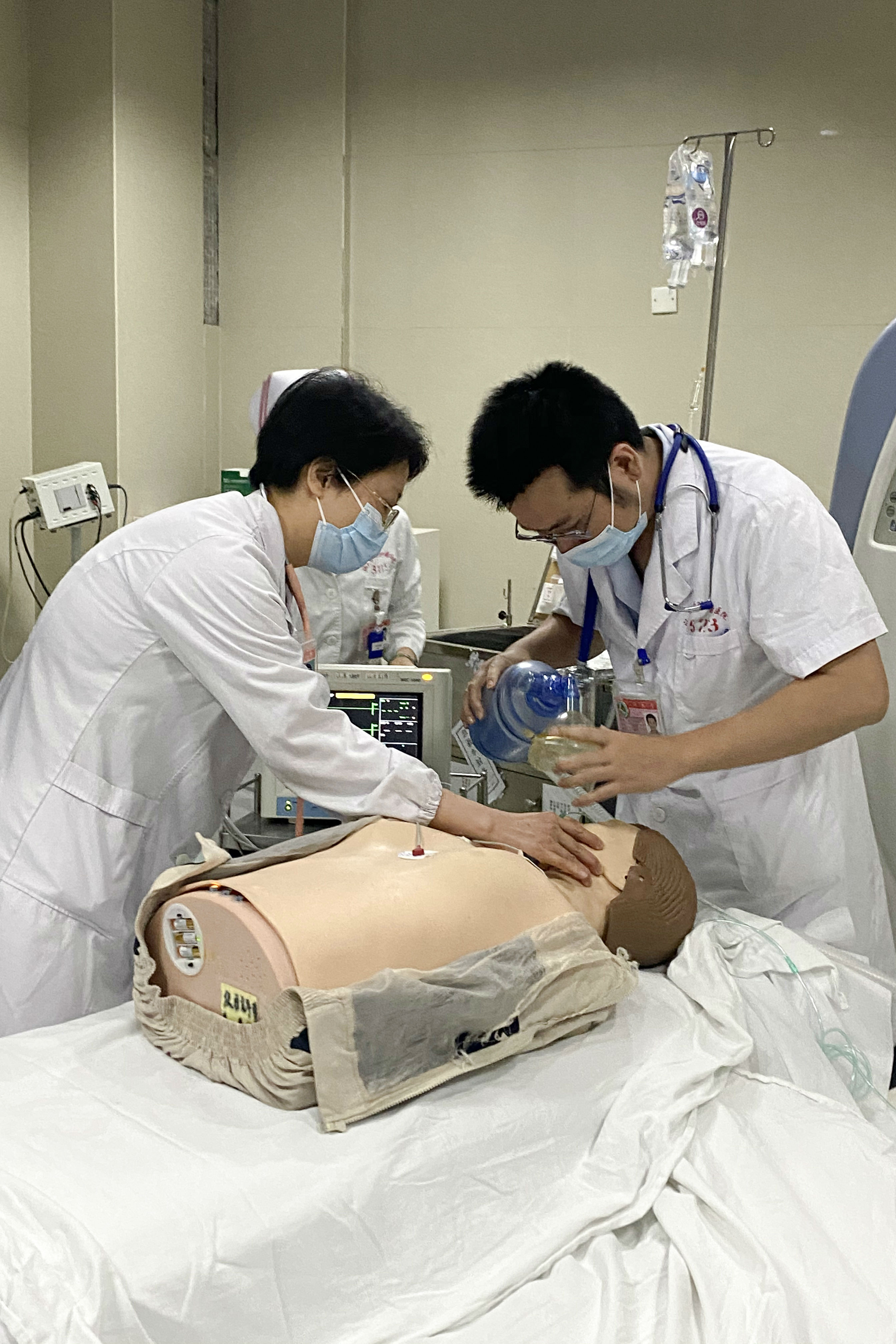 心电监护显示患者出现室颤,即启用除颤仪除颤。麻醉科医生到场后立即对“患者”进行气管插管,并持续心肺复苏及人工呼吸。经合力抢救,“患者”呼吸心跳恢复、血压血氧回复正常,神志恢复正常,随后转运至重症医学科进一步观察。