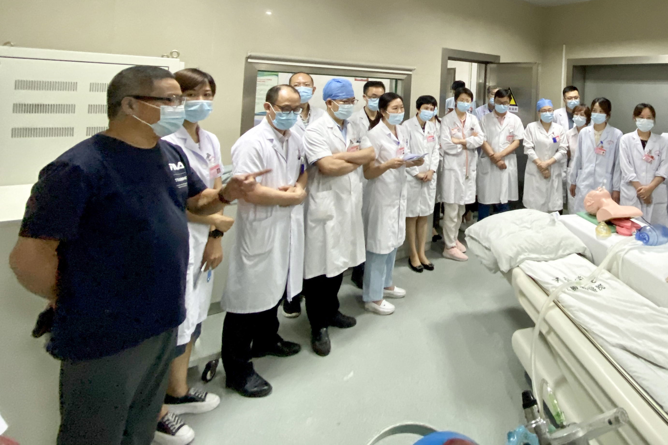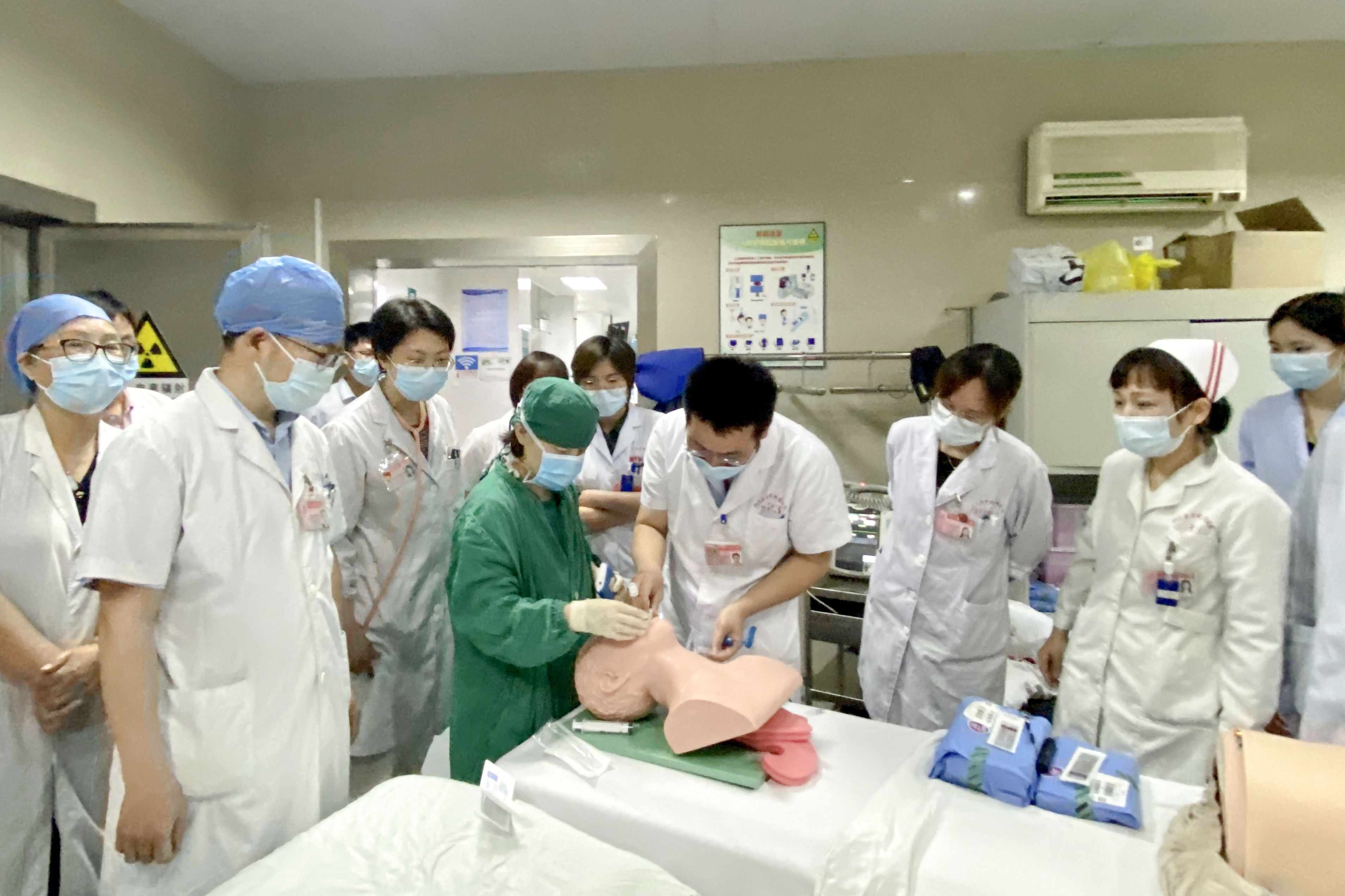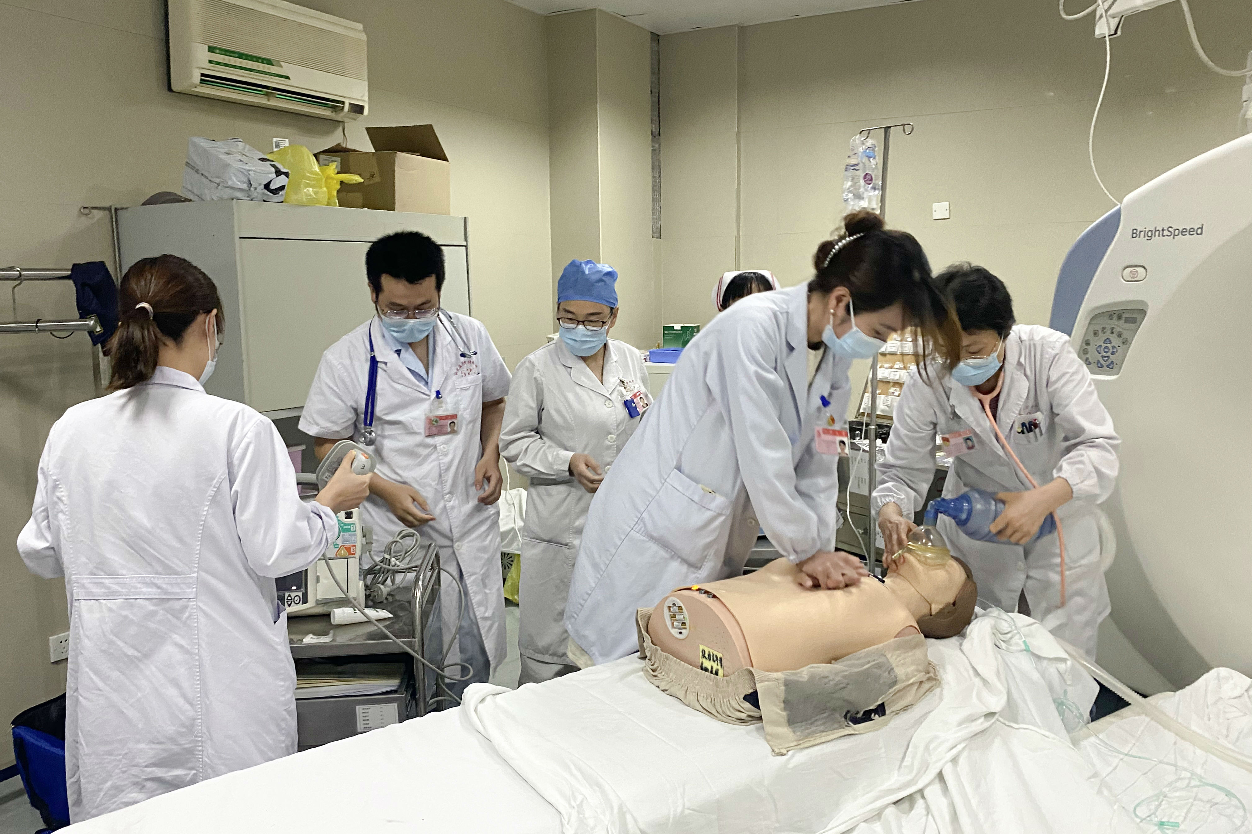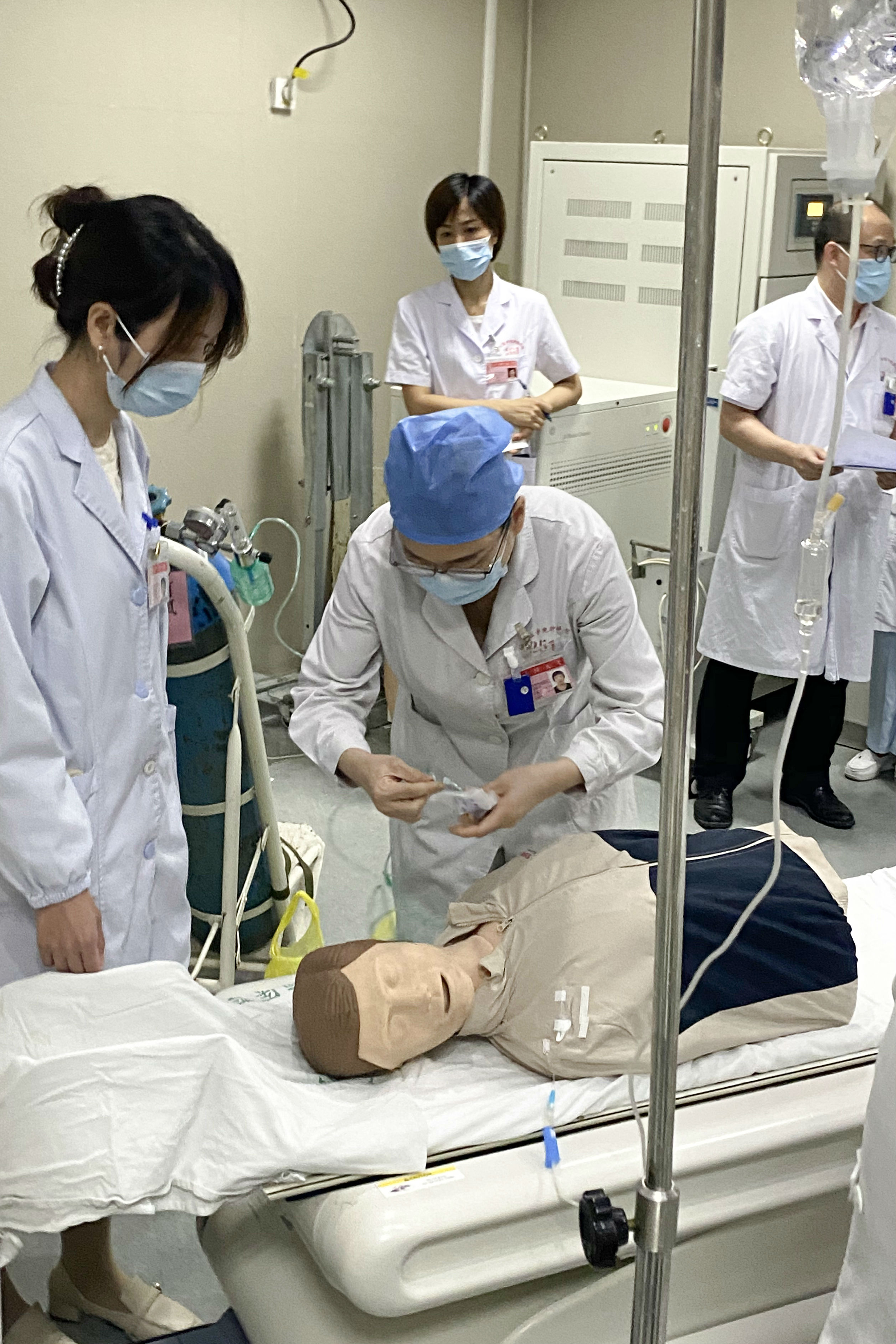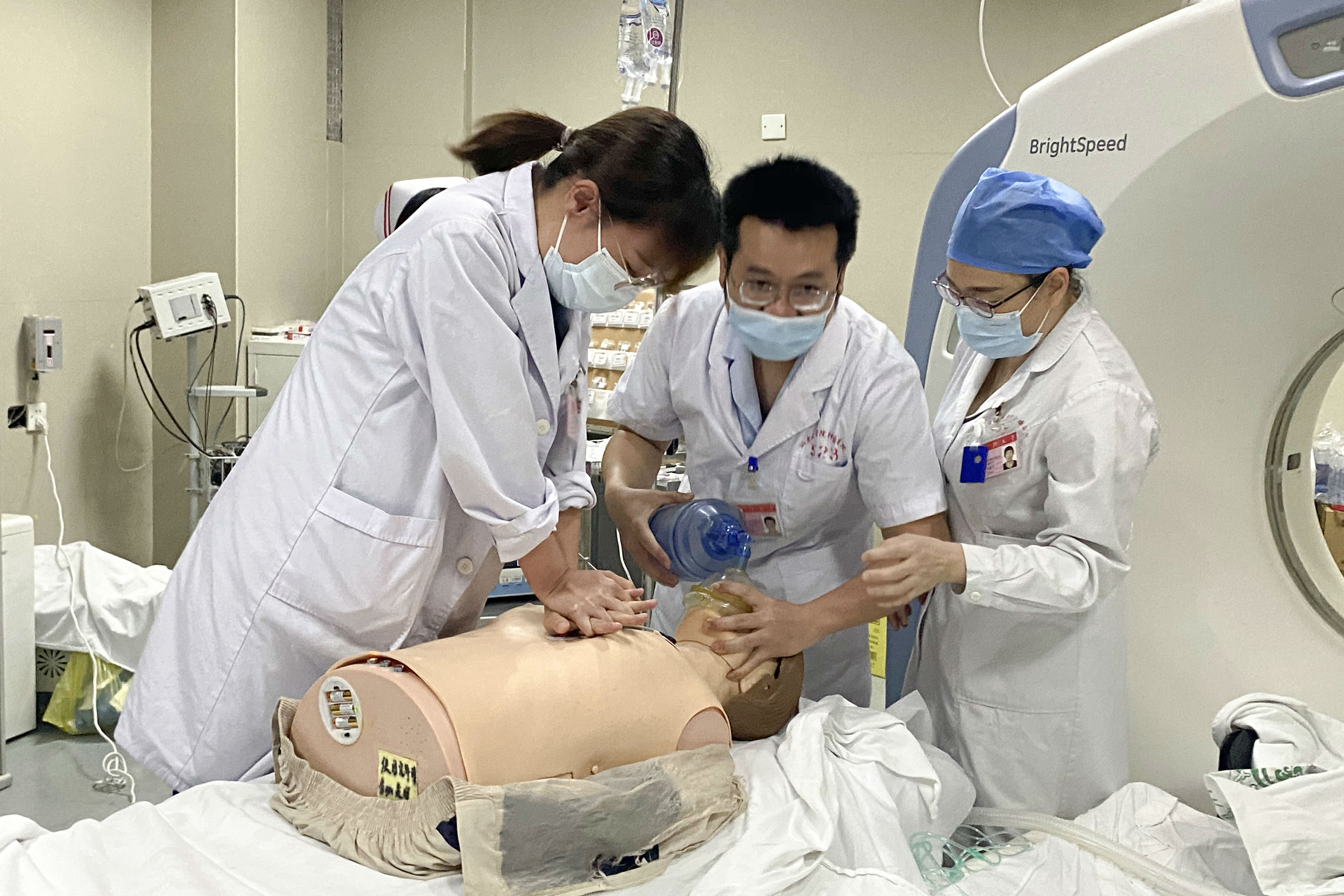 随后“患者”依次出现意识不清、肢冷、发绀、血压下降至60/30mmHg、血氧饱和度持续下降、呼吸心跳停止等情况,抢救人员立即对患者进行持续心肺复苏及人工呼吸,同时,CT室工作人员电话呼叫麻醉科、头颈外科前来协助抢救。