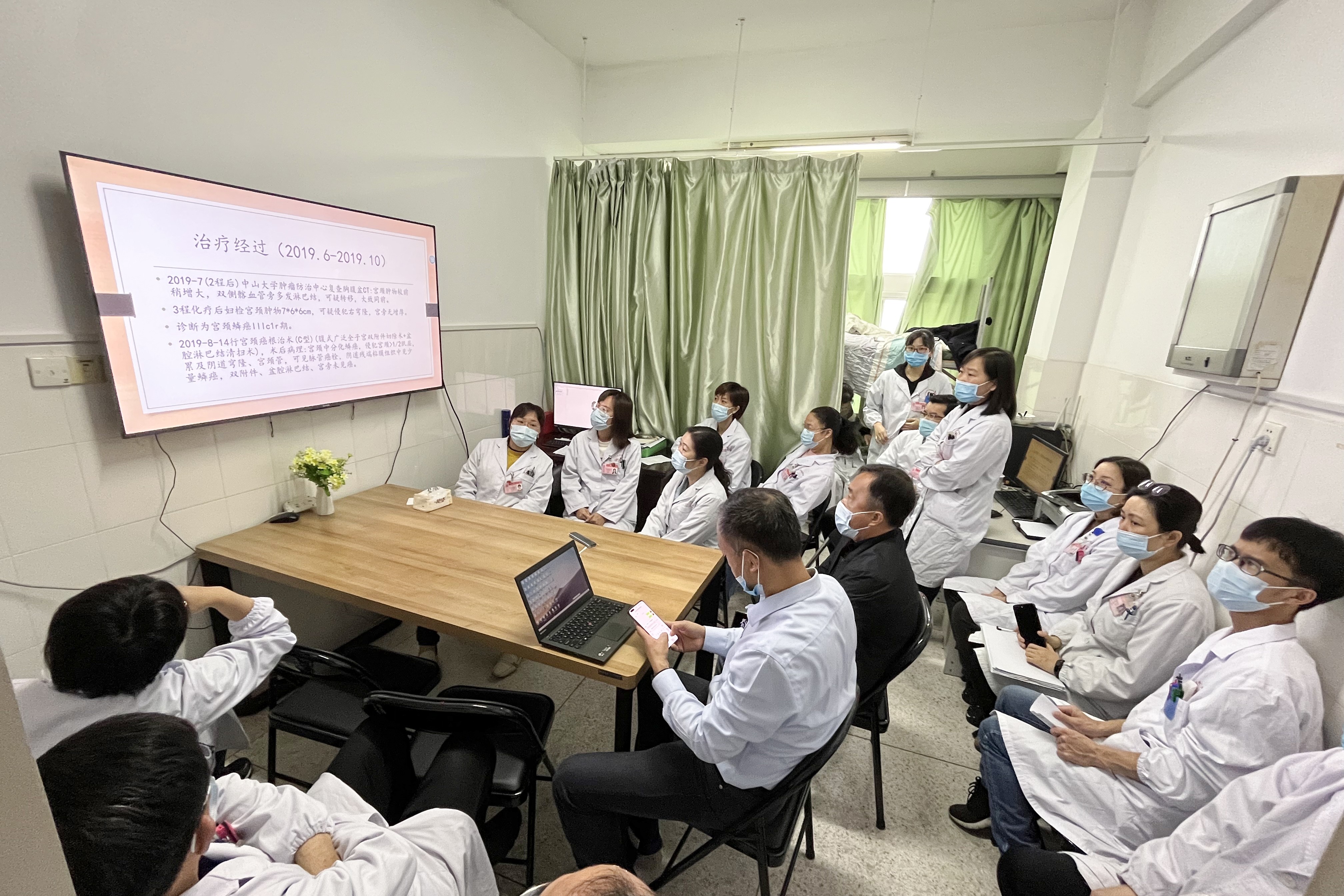 家属向李从铸院长了解患者情况 据该院副院长、妇瘤科主任李从铸介绍,经检查发现,黄姨是宫颈癌术后放化疗后复发患者,CT提示盆腔病灶大约6-7cm,侵犯直肠、膀胱、左侧输尿管,引起直肠阴道瘘和膀胱阴道瘘。鉴于此,李从铸随即发起了全院多学科联合会诊(即MDT),在综合各科专家的会诊意见后,制定最后的治疗方案——全盆腔脏器廓清术。