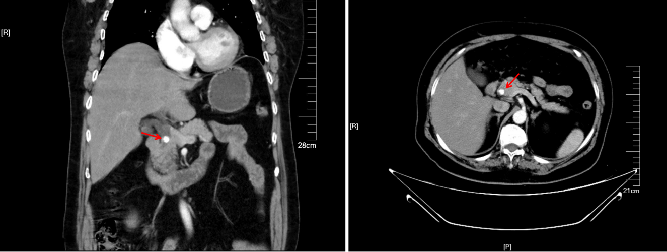 近日, 肝胆胰外科成功为胆总管结石患者实施无需开刀,微创的“口中取石术”——内镜逆行胰胆管造影+十二指肠乳头括约肌切开(ERCP+EST)取石术。 病例回顾 患者为62岁女性,因“发现右乳肿块2月余”收治于我院乳腺外科,入院后查CT提示:右乳腺癌;胆总管结石;胆囊结石。患者右乳腺癌合并胆道结石问题,经乳腺外科医师专科手术处理后,转肝胆胰外科进一步处理胆道结石。