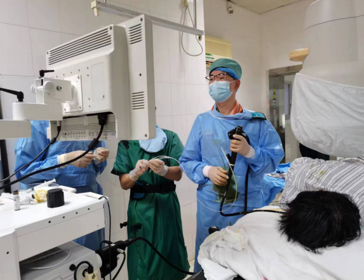 ▲ 手术现场 手术当天,在内镜室负责人郭毅、介入科副主任庄学龙、麻醉科副主任李义贤、黄小燕主治医师及介入手术室廖贤英主管护师的大力支持和默契配合下,历时不到1小时,便将患者胆总管结石顺利取出,手术顺利完成。