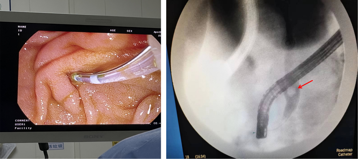 ▲ 十二指肠镜下找到十二指肠乳头,插入导管并造影显示胆总管结石(红色箭头所示)