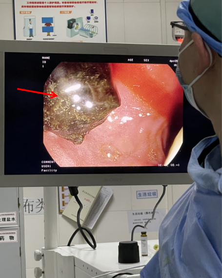 ▲CT 检查提示胆总管结石(红色箭头所示) 治疗过程 由于郭阿姨在乳腺外科已行两次手术治疗,对再次开刀或腹腔镜手术比较抗拒。此外为了患者术后能尽快恢复,以便进行后续针对乳腺癌的辅助治疗,肝胆胰外科学科带头人古松钢副主任医师决定为患者实施微创的“口中取石”—ERCP取石术,取除患者胆总管的结石。