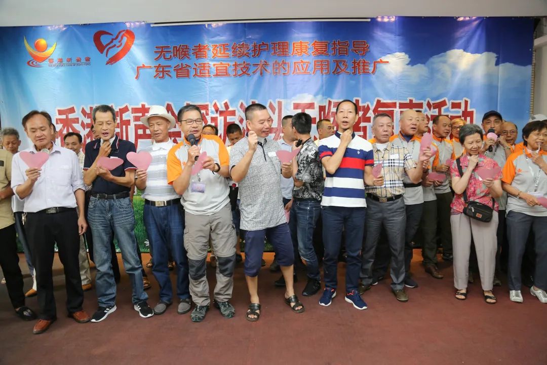 大合照 此后,汕头“新声会”每2个月举办一次活动。邱洁华将成员带到了汕头石炮台公园的茶座,虽然每次都会为他们检查造口,提供护理建议,但脱离了医院的环境,换下了病号服和护士服,轻松的环境和集体的力量让无喉患者放下心中的包袱,无惧周围人的目光,借助设备大胆发声。 一组照片最能说明“新声会”给患者带来的改变。60多岁的许伯第一次见邱洁华时用手指做出了潮汕地区意味着“死亡”的手势。他的儿子告诉邱洁华,父亲术后一直觉得自己再也无用,只能等死。第一次活动照,许伯一脸沮丧;而仅仅参加了几场活动,第四次活动照上的许伯搂着另外一位“新声会”成员,笑得眼睛都眯成了缝。 在香港“新声会”25周年联谊会上,汕头“新声会”17名成员用电子喉和小喇叭为现场来自香港、北京、新加坡等地的无喉者献唱《爱拼才会赢》,全场沸腾。一句“爱拼才会赢”引发大合唱,重复了一次又一次……