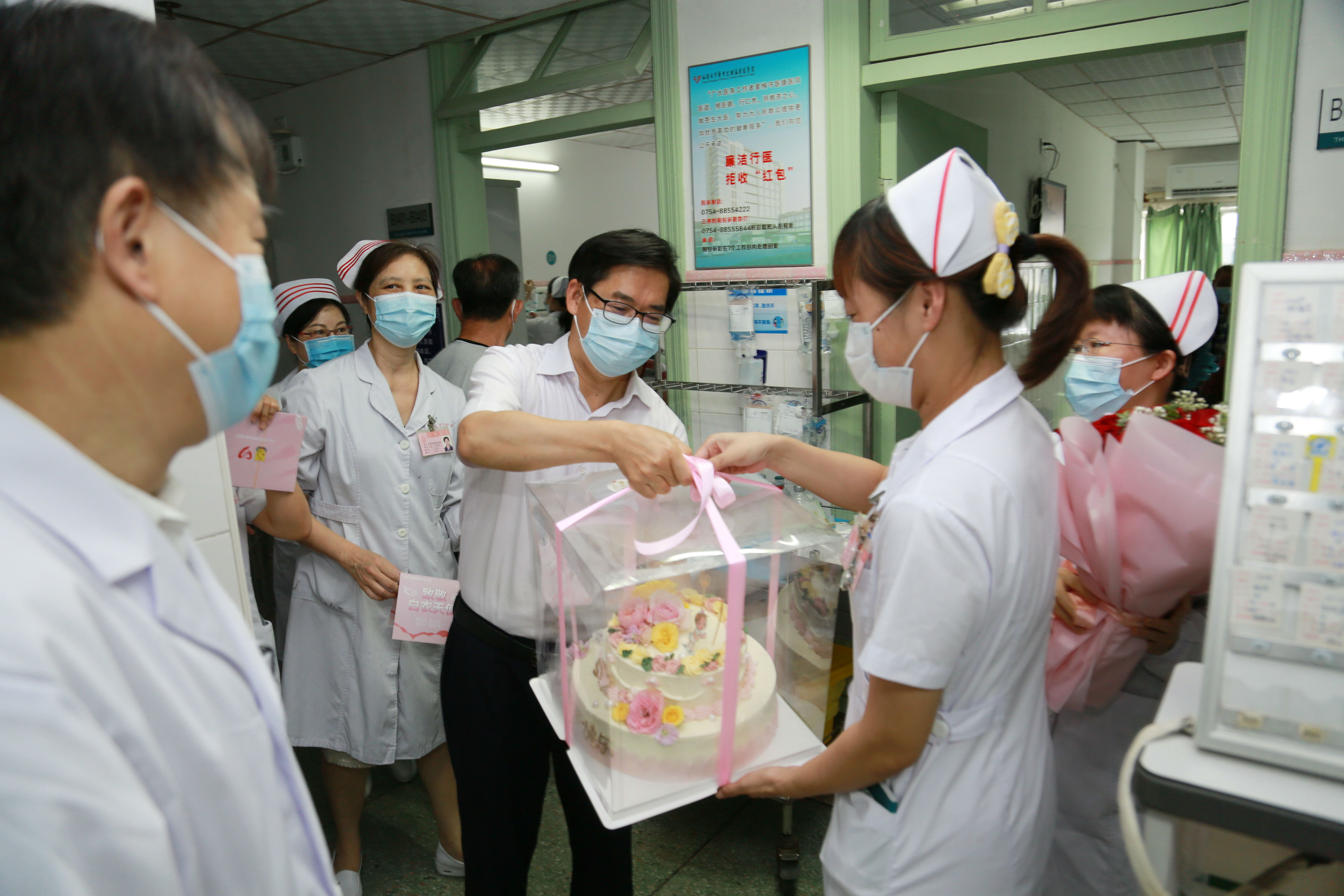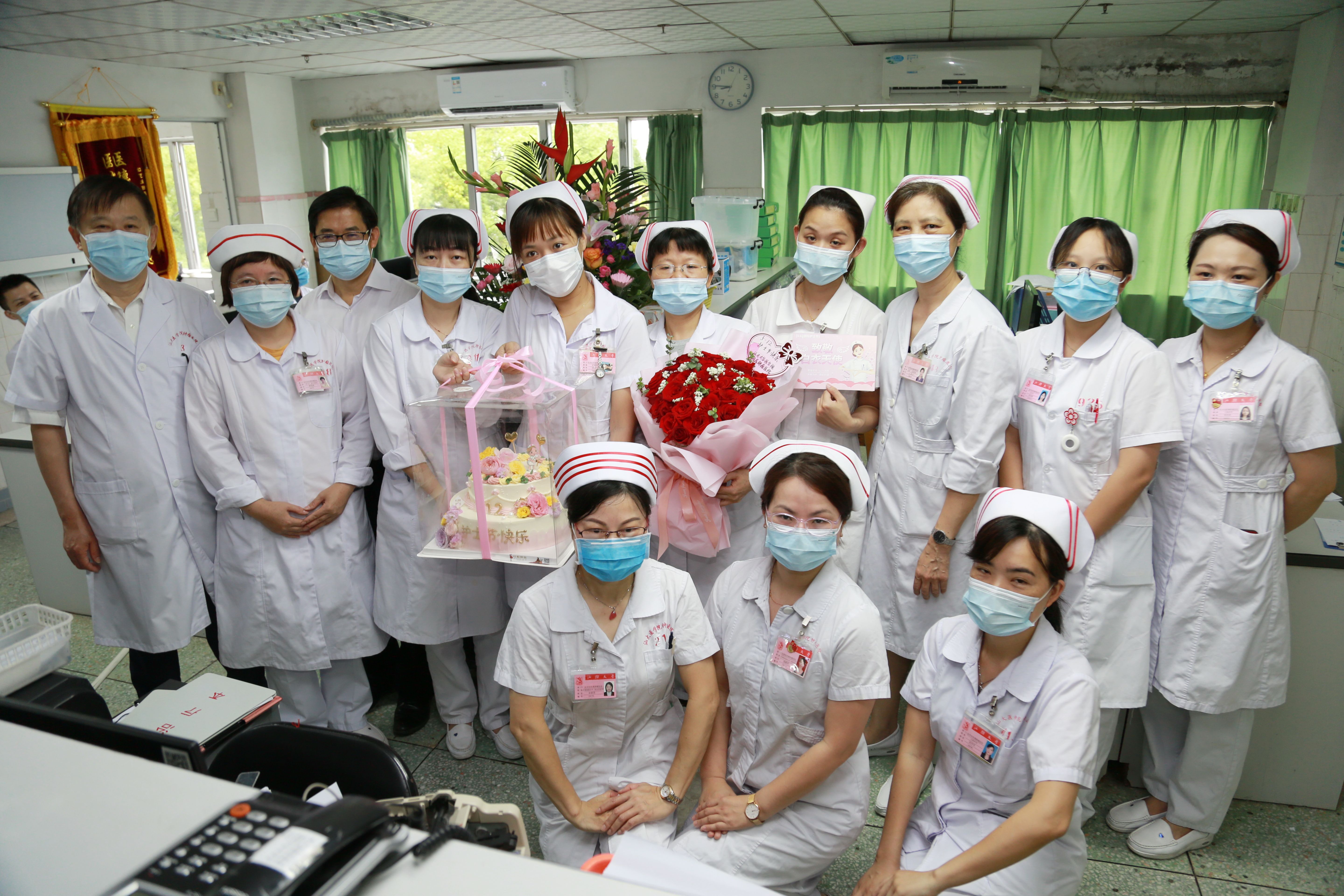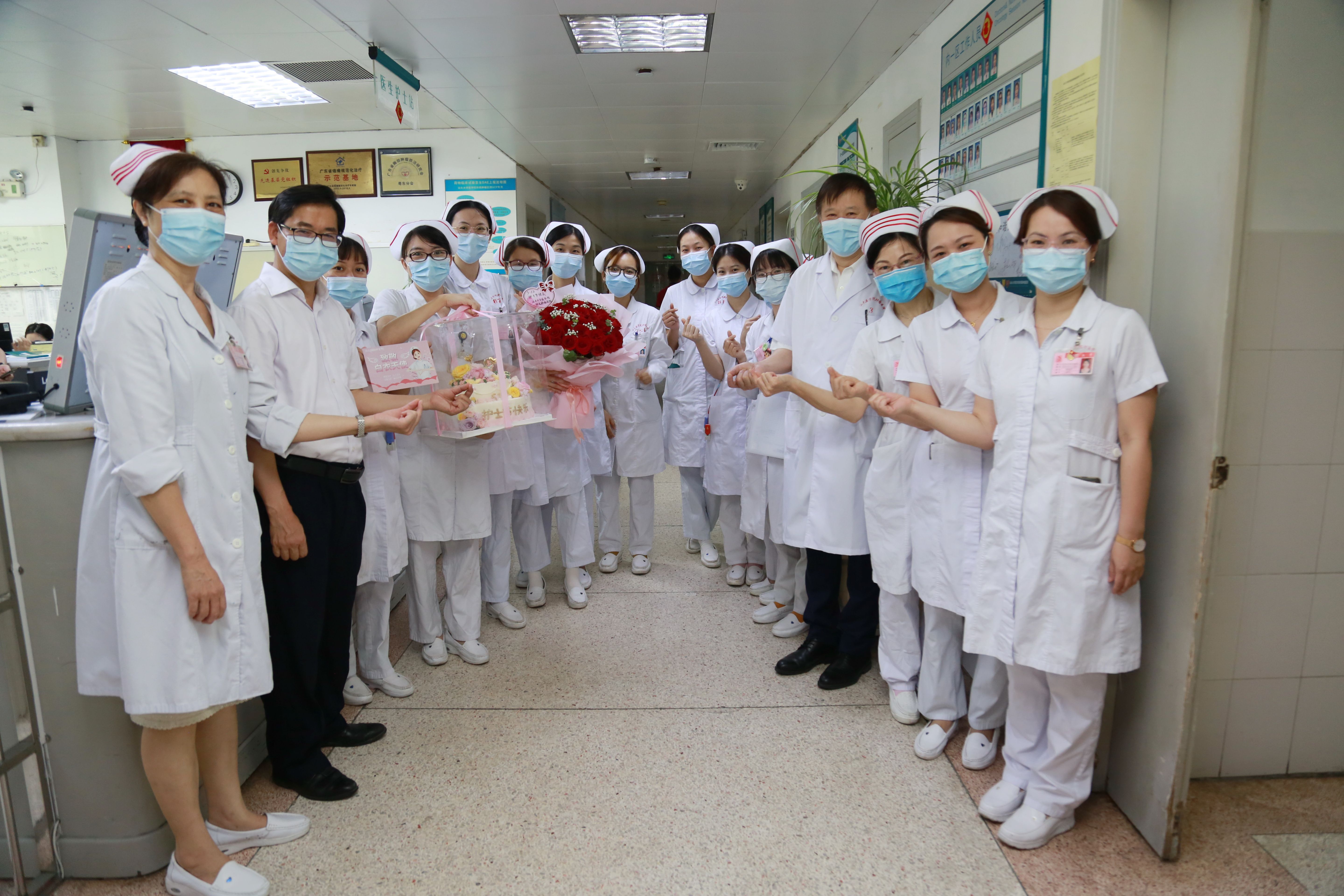 白衣天使爱心博 洒下花香遍地浓 是天使也是凡人 因平凡而伟大 致敬白衣天使 2022年5月12日是第111个国际护士节,今年我国护士节的主题是“关爱护士队伍,护佑人民健康”。在护士节到来之际,为表达对我院最可爱的白衣天使的节日祝福,5月12日上午,各病区工作人员忙碌的背影还来回穿梭在明亮的病房中,我院党委书记姚锡涛、院长王新家、护理部主任王逸如等已经手捧艳丽的鲜花、可口的蛋糕和饱含深情寓意的贺卡冒着雨来到了科室,向辛勤奉献的天使们送上节日的问候和美好的祝愿。