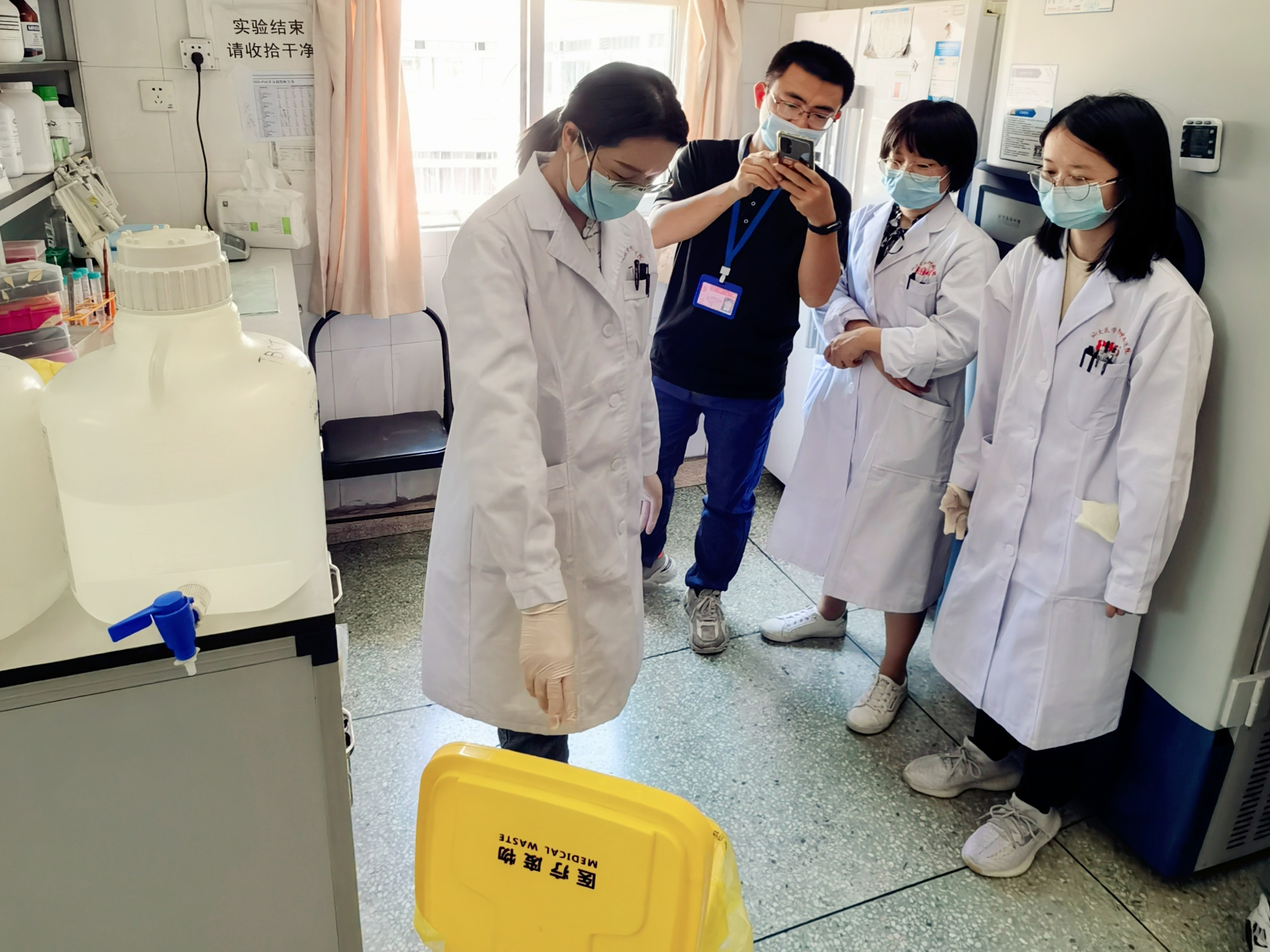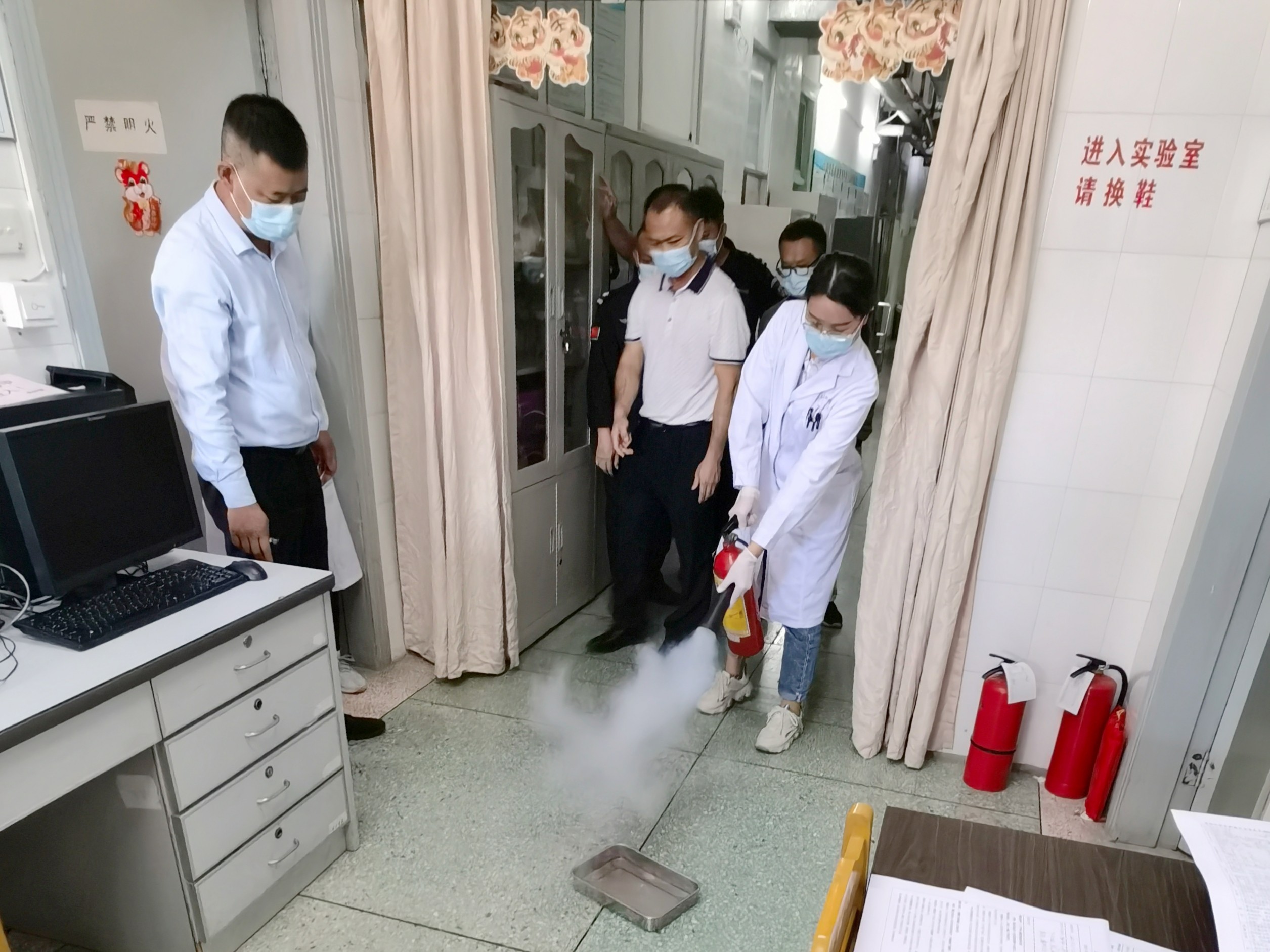 饶科长指导使用灭火器 通过本次安全事故应急演练,强化了实验室工作人员和研究生的危险化学品和消防安全意识,切实提高了实验室在应对突发事件的应急处置能力,为实验室科研工作提供安全保障,助力我院三级甲等专科医院的评审工作。 (中心实验室) |
