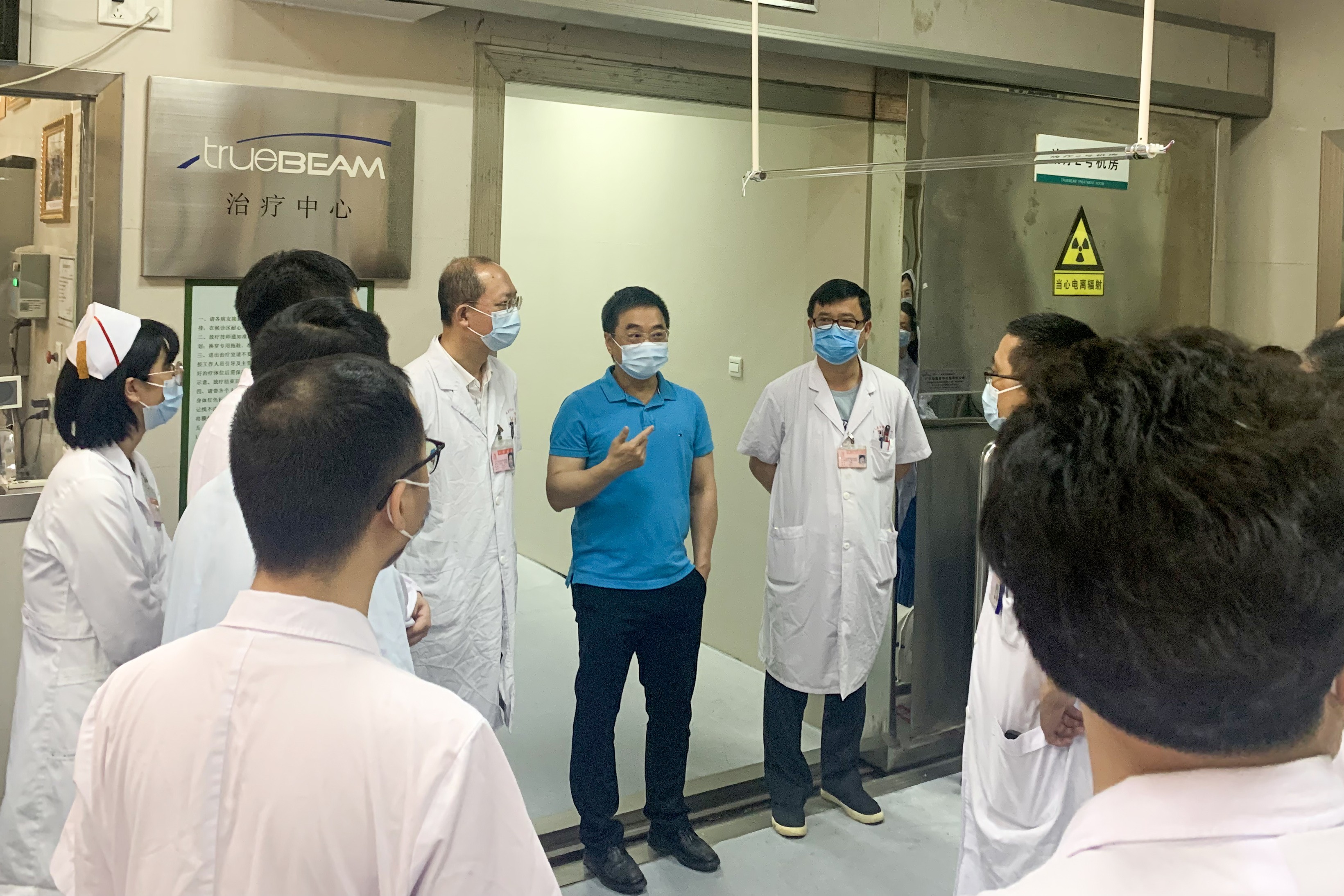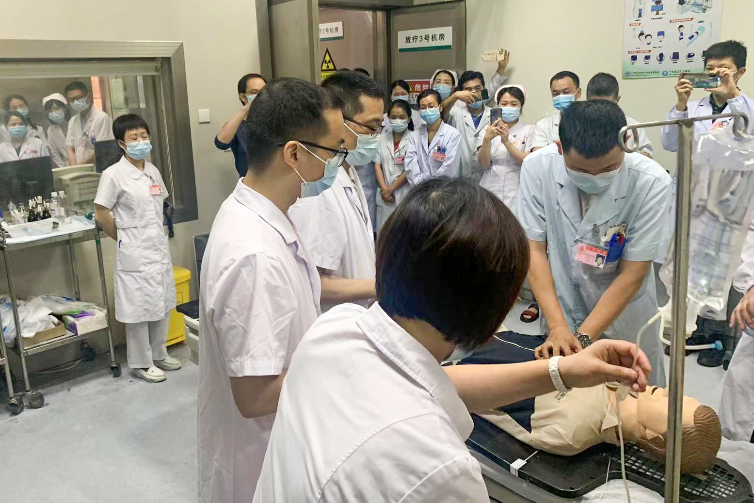 为提高医务人员对医疗安全事故的防范意识,提升放疗机房工作人员应对突发情况的应对处理能力,5月21日上午和5月28日下午, 放疗科物理技术部在部门负责人彭逊副主任的组织下联合门诊部、重症医学科和头颈外科在放疗1-3号机房开展四场应急演练。 本次演练围绕模拟放射治疗过程中可能出现的突发状况进行。演练由医院党委副书记、大放疗科主任林志雄教授主持,放疗科病区医生、护士和放疗科物理技术部全体工作人员近40人参与了演练。 5月21日上午 9:05分,林志雄副书记进行了简短的动员讲话,他强调了开展应急演练的重要性并宣布演练正式开始。