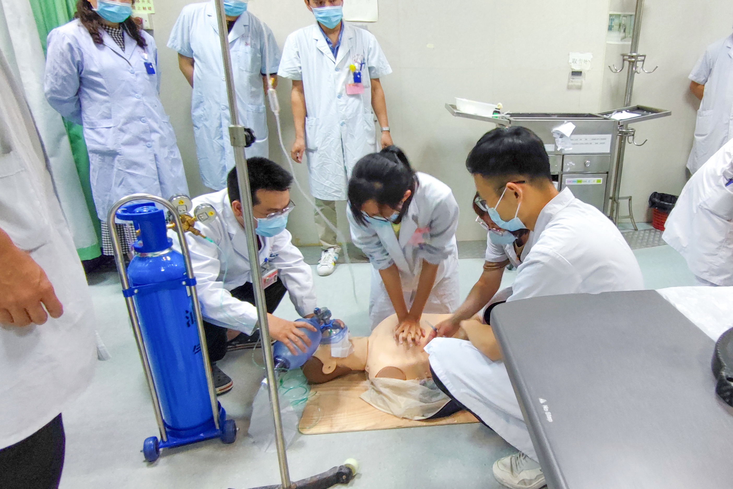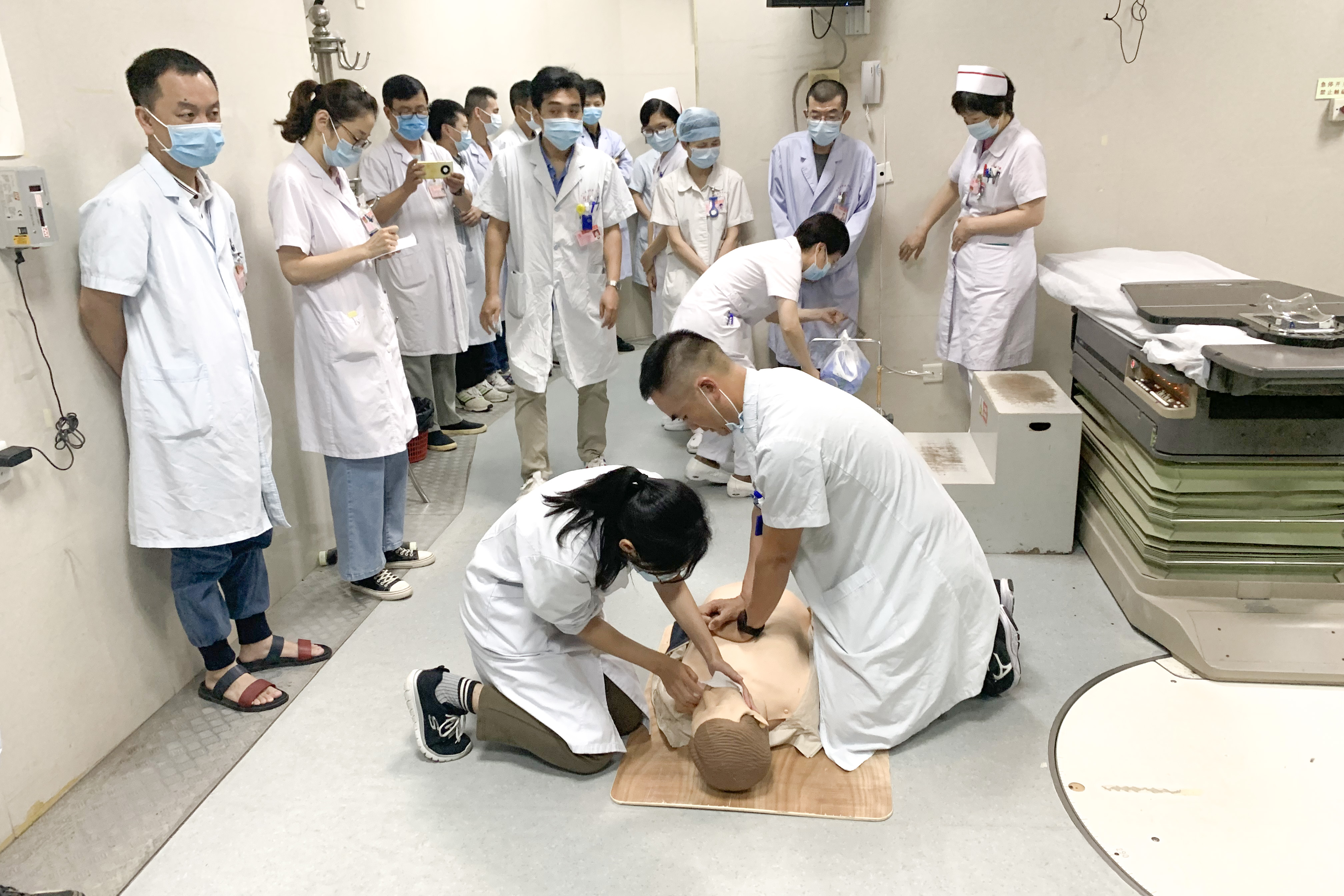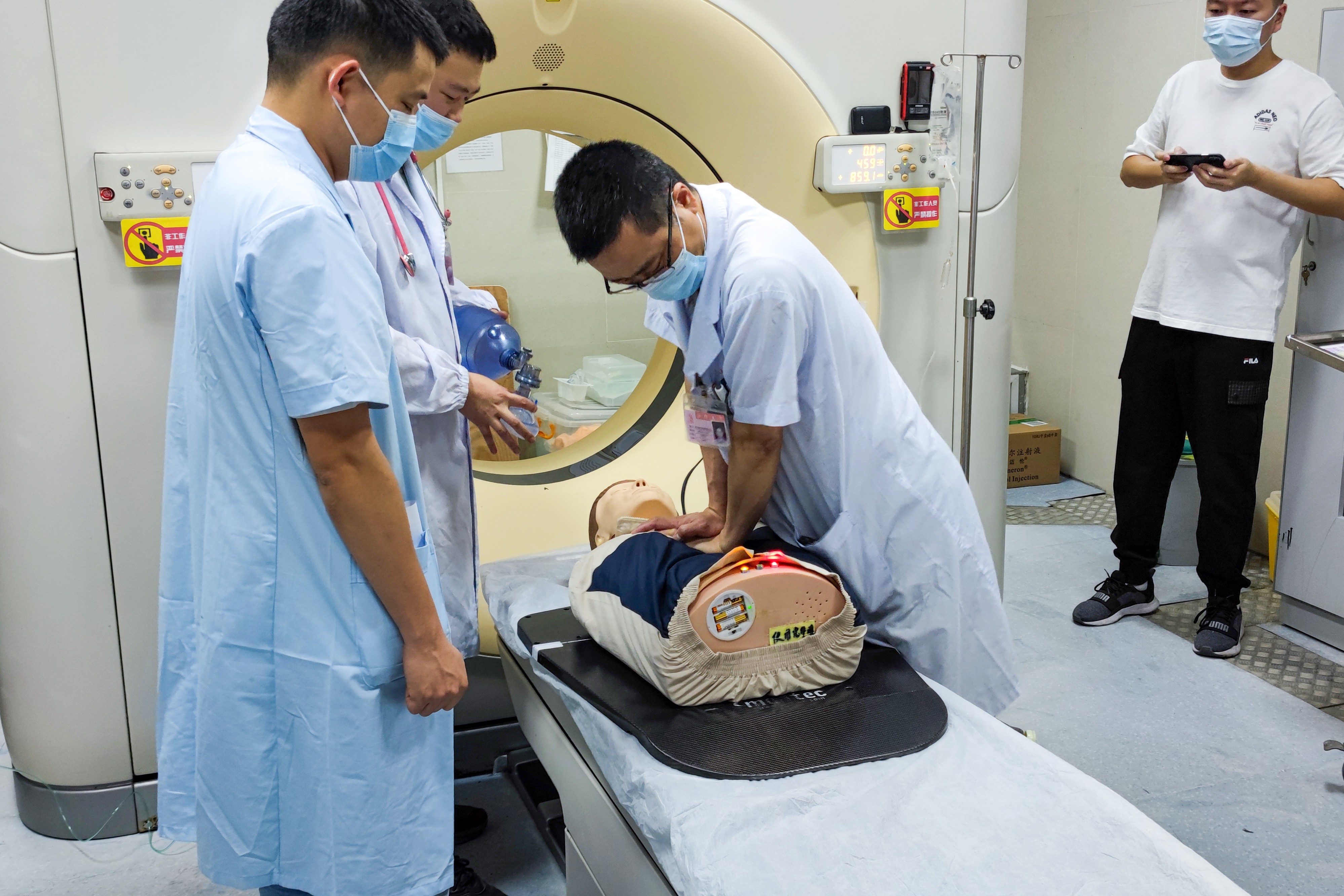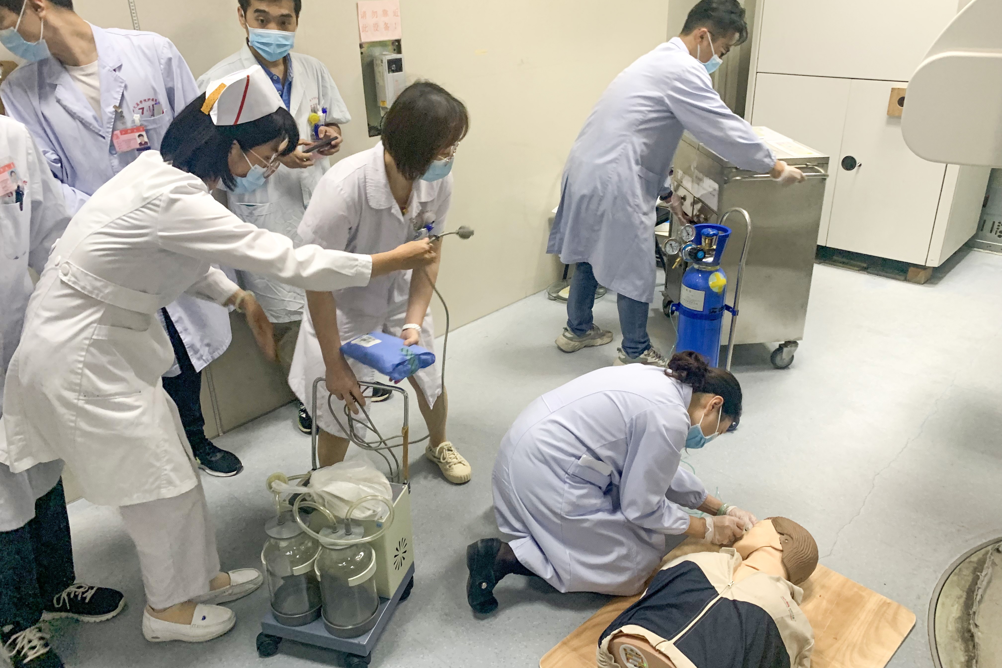 首场应急演练以CT增强扫描中突发重度过敏反应为背景,演练模拟了一名鼻咽癌患者在实施增强扫描过程中,表现出呼吸困难,脸色苍白、随后出现休克,窒息,呼吸心跳停止的突发情况。