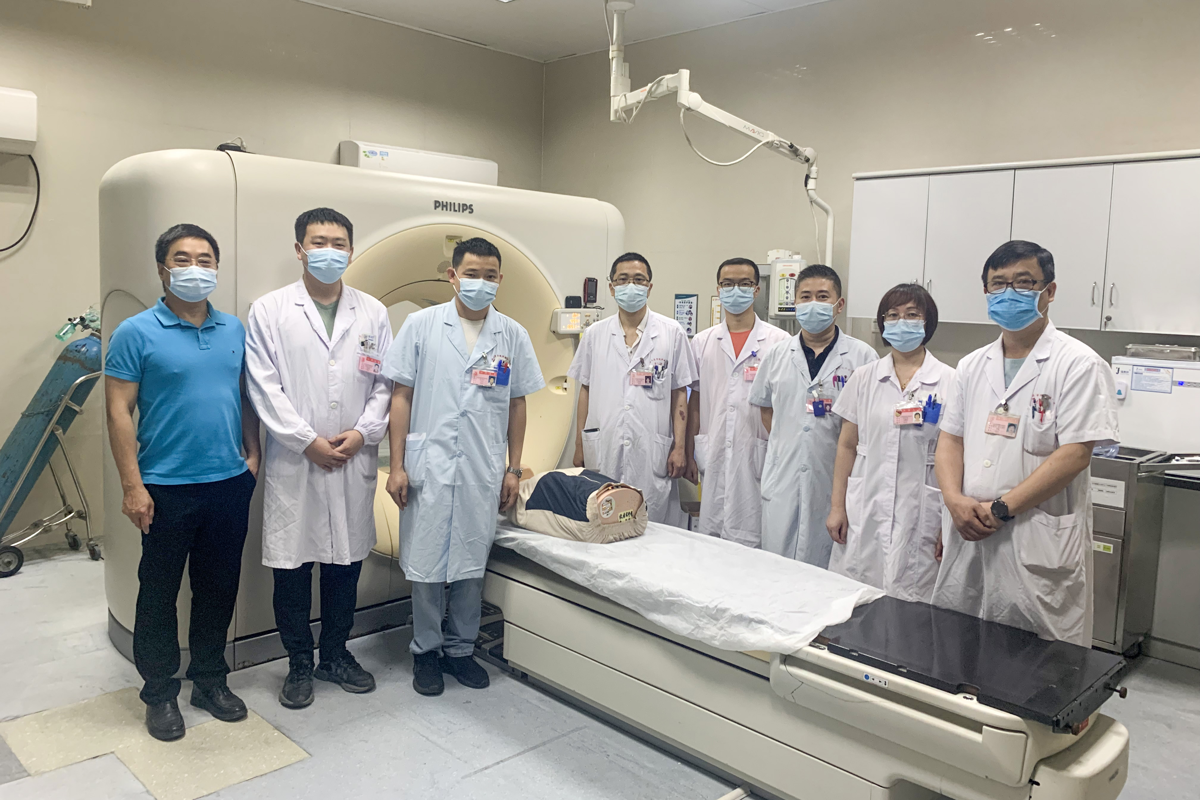 当班护士推来抢救车并测量记录病人生命体征,操作台治疗师紧急呼叫保健科医生和主管医生进行急救,病人情况稳定后转至放射科拍片对病情作进一步诊断。