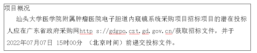 本合同包不接受联合体投标 合同履行期限:合同签订后60天内完成交货和安装调试并交付使用。 二、申请人的资格要求:1.投标供应商应具备《政府采购法》第二十二条规定的条件,提供下列材料: 1)具有独立承担民事责任的能力:在中华人民共和国境内注册的法人或其他组织或自然人,投标(响应)时提交有效的营业执照(或事业法人登记证或身份证等相关证明)副本复印件。 2)具有良好的商业信誉和健全的财务会计制度:供应商必须具有良好的商业信誉和健全的财务会计制度(提供2020 年度或2021年度财务状况报告(新成立公司提供成立至今的月或季度财务报表)或基本开户行出具的资信证明)。 3)履行合同所必需的设备和专业技术能力:按投标(响应)文件格式填报设备及专业技术能力情况。 4)有依法缴纳税收和社会保障资金的良好记录:提供投标截止日前6个月内任意1个月依法缴纳税收和社会保障资金的相关材料。如依法免税或不需要缴纳社会保障资金的,提供相应证明材料。 5)参加采购活动前3年内,在经营活动中没有重大违法记录:参照投标(报价)函相关承诺格式内容。重大违法记录,是指供应商因违法经营受到刑事处罚或者责令停产停业、吊销许可证或者执照、较大数额罚款等行政处罚。(依据财库〔2022〕3号文规定,较大数额罚款认定为200万元以上的罚款,法律、行政法规以及国务院有关部门明确规定相关领域“较大数额罚款”标准高于200万元的,从其规定。) 2.落实政府采购政策需满足的资格要求: 合同包1(电子胆道内窥镜系统)落实政府采购政策需满足的资格要求如下: 本项目不属于专门面向中小企业采购的项目。 3.本项目的特定资格要求: 合同包1(电子胆道内窥镜系统)特定资格要求如下: (1)投标人未被列入“信用中国”网站(www.creditchina.gov.cn)以下任何记录名单之一:①失信被执行人;②重大税收违法案件当事人名单;③政府采购严重违法失信行为。同时,不处于中国政府采购网(www.ccgp.gov.cn)“政府 采购严重违法失 信行为信息记录”中的禁止参加政府采购活动期间。(说明:①由采购人、采购代理机构于投标截止日在“信用中国”网站(www.creditchina.gov.cn)及中国政府采购网(www.ccgp.gov.cn)查询结果为准,如在上述网站查询结果均显示没有相关记录,视为不存在上述不良信用记录。②采购代理机构同时对信用信息查询记录和证据截 图或下载存档;③投标人为分支机构的,同时对该分支机构所属总公司(总所)进行信用记录查询,该分支机构所属总公司(总所)存在不良信用记录的,视同供应商存在不良信用记录。) (2)①为采购项目提供整体设计、规范编制或者项目管理、监理、检测等服务的供应商,不得再参加该采购项目同一合同项下的其他采购活动。(提供《投标人资格声明函》) ②单位负责人为同一人或者存在直接控股、管理关系的不同供应商,不得参加同一合同项下的政府采购活动。(提供《投标人资格声明函》) (3)投标人应具有《医疗器械生产企业许可证》(如投标人为制造商)或《医疗器械经营许可证》和《第二类医疗器械经营备案凭证》(如投标人为代理经销商);所投产品应具备《中华人民共和国医疗器械产品注册证》; (4)如所投产品为进口产品的,投标人应提供有效的授权证明材料。(如投标人为代理经销商) (5)已参与本次项目,并获取采购文件。 三、获取招标文件时间:2022年06月17日至2022年06月23日,每天上午00:00:00至12:00:00,下午12:00:00至23:59:59(北京时间,法定节假日除外) 地点:广东省政府采购网https://gdgpo.czt.gd.gov.cn/ 方式:在线获取 售价:免费获取 四、提交投标文件截止时间、开标时间和地点2022年07月07日 15时00分00秒(北京时间) 地点:汕头市龙湖区金砂路129号金信大厦A座1404-1405号(建成工程咨询股份有限公司汕头分公司) 五、公告期限自本公告发布之日起5个工作日。 六、其他补充事宜1.本项目采用电子系统进行招投标,请在投标前详细阅读供应商操作手册,手册获取网址:https://gdgpo.czt.gd.g ov.cn/help/transaction/download.html。投标供应商在使用过程中遇到涉及系统使用的问题,可通过400-1832-999进行咨询或通过广东政府采购智慧云平台运维服务说明中提供的其他服务方式获取帮助。 2.供应商参加本项目投标,需要提前办理CA和电子签章,办理方式和注意事项详见供应商操作手册与CA办理指南,指 南获取地址:https://gdgpo.czt.gd.gov.cn/help/problem/。 3.如需缴纳保证金,供应商可通过"广东政府采购智慧云平台金融服务中心"(http://gdgpo.czt.gd.gov.cn/zcdservi ce/zcd/guangdong/),申请办理投标(响应)担保函、保险(保证)保函。 本项目支持电子保函,可通过登录项目采购电子交易系统跳转至电子保函系统进行在线办理。电子保函办理办法详见供应商操作手册。 七、对本次招标提出询问,请按以下方式联系。1.采购人信息 名 称: 地 址:汕头市饶平路7号 联系方式:0754-88555844-1032 2.采购代理机构信息 名 称:建成工程咨询股份有限公司 地 址:汕头市龙湖区金砂东路129号金信大厦A座1404-1405号 联系方式:0754-87229021 3.项目联系方式 项目联系人:郑先生 电 话:0754-87229021