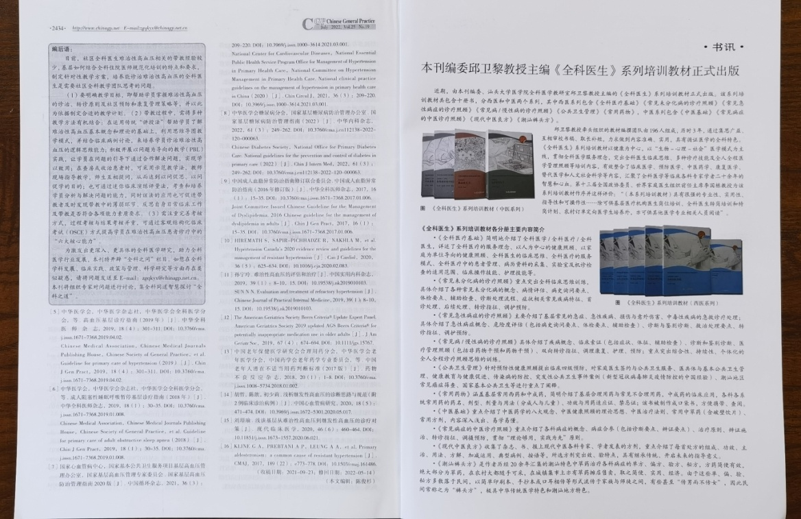 近期,由肿瘤医院邱卫黎副院长团队编写的《全科医生》系列培训教材正式出版。《中国全科医学》杂志社在得知相关消息后,主动与我院邱卫黎副院长联系,并决定在其网站及纸质版杂志进行该系列培训教材的宣传推介。