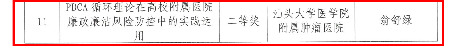 二等奖 《新时代高校附属医院党建与业务深度融合新途径的思考与探索》李佳琳 姚锡涛 罗晓明 陈铮 《PDCA 循环理论在高校附属医院廉政廉洁风险防控中的实践运用》翁舒绿