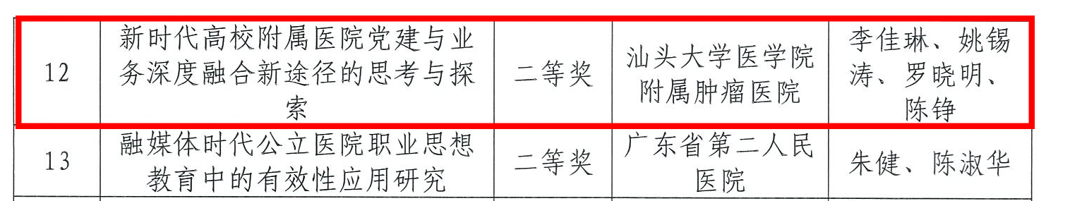 为弘扬精益求精、追求卓越、勇于奉献的新时代追梦精神,2022年11月,广东省医院协会医院党建与文化建设专业委员会开展“喜迎二十大,奋进新征程”2022年年会征文活动。近日,活动评选结果公布,肿瘤医院报送作品取得优秀论文一等奖2篇,二等奖2篇,三等奖1篇的好成绩。