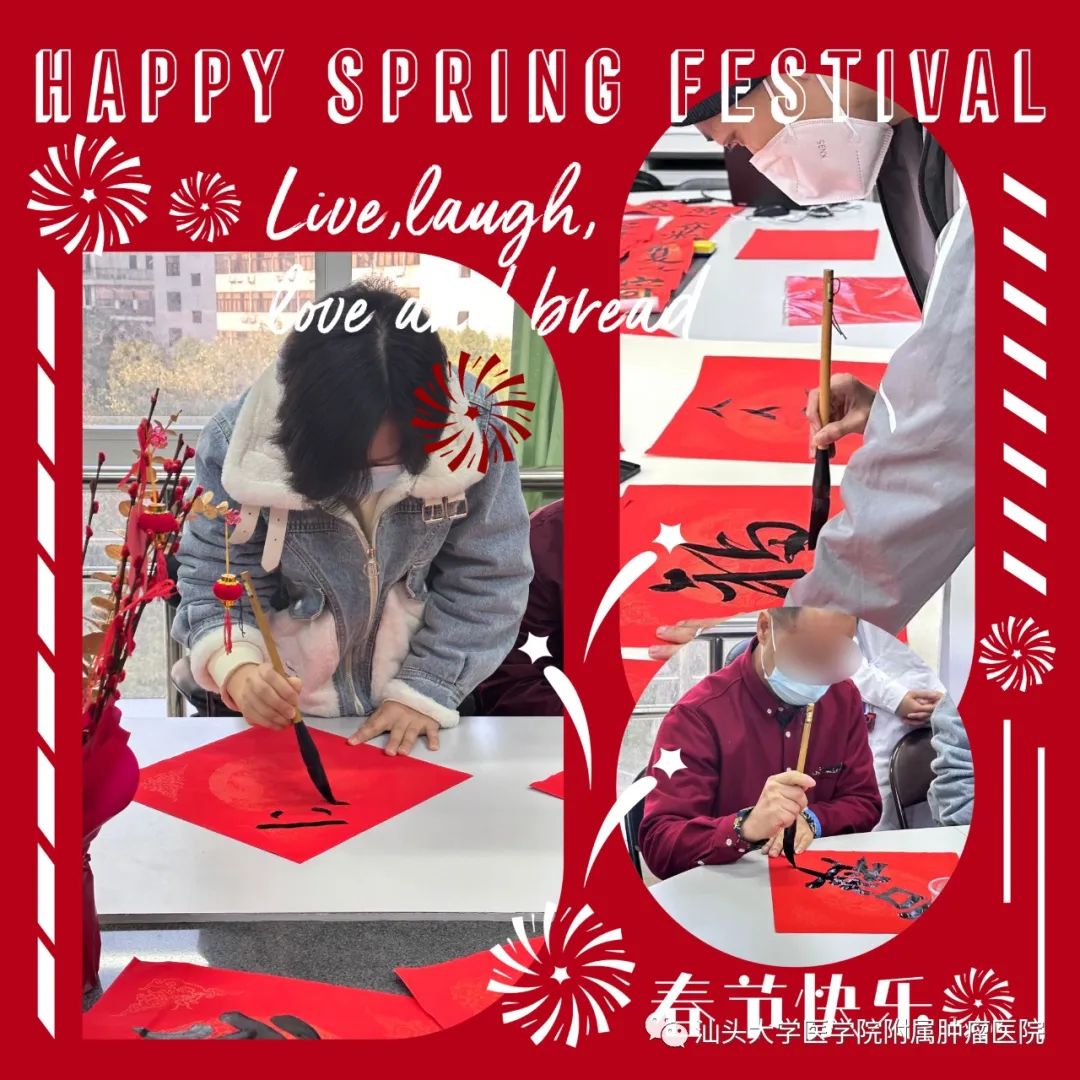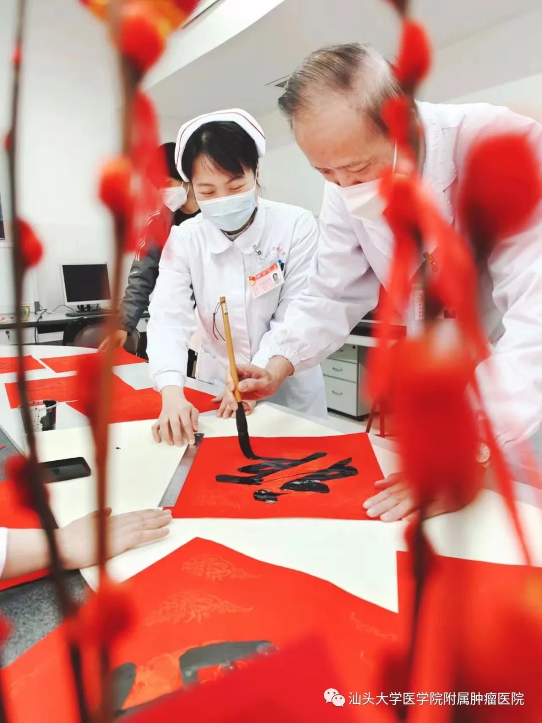 1月19日下午,在汕头大学附属肿瘤医院放疗三区,伴随着喜庆洋溢的新春乐曲,周明镇副主任、林韵副护士长共同进行新春致辞,开启轻松愉快的“辞旧迎新,传递祝福”活动。 活动现场,近30位患者及家属在“游戏”中接力书写 “福”“吉祥”“平安”“开心”“家和万事兴”等美好希冀和祝愿,并依次上前为彼此送上新春的祝福,共同祝福伟大的祖国繁荣富强。