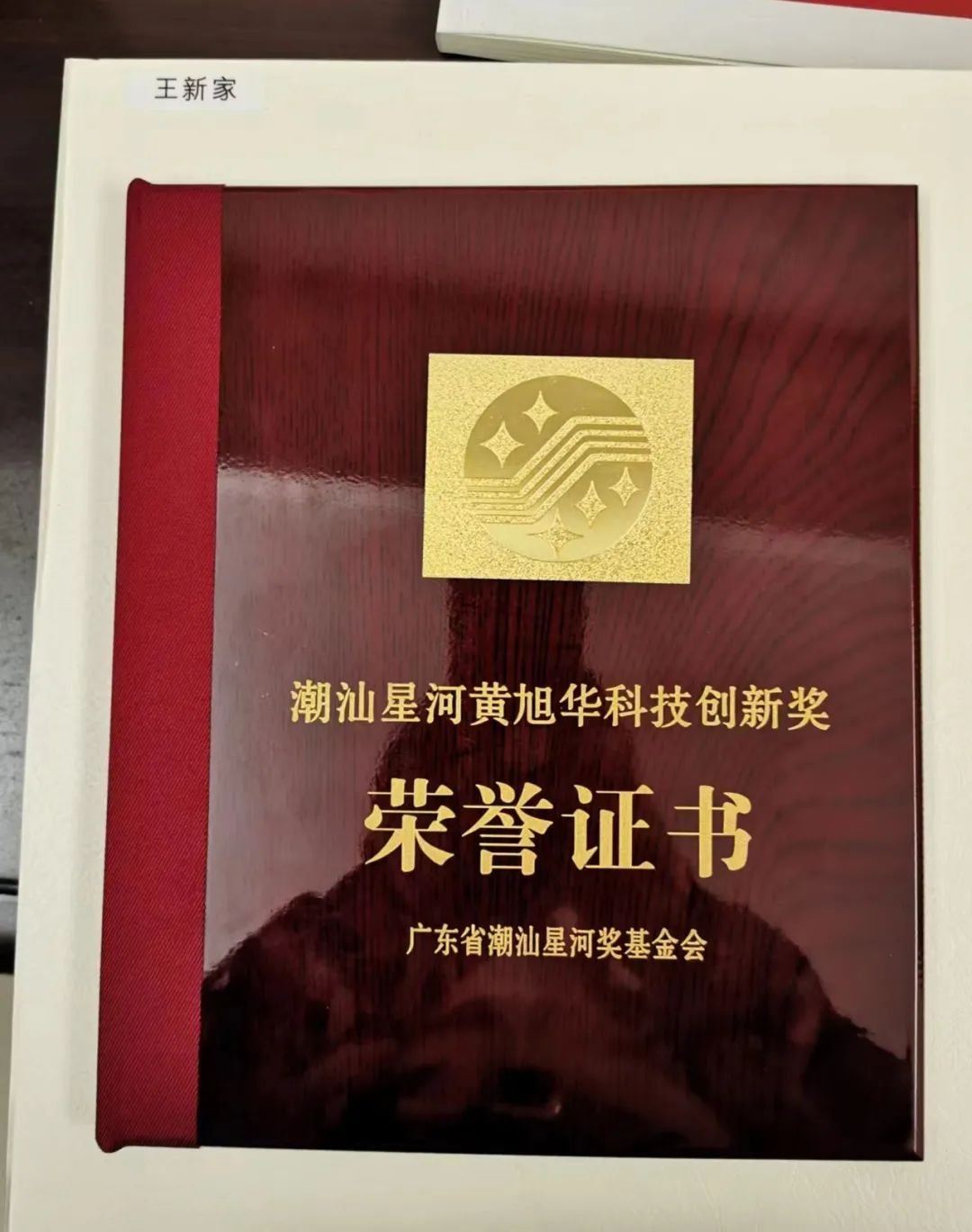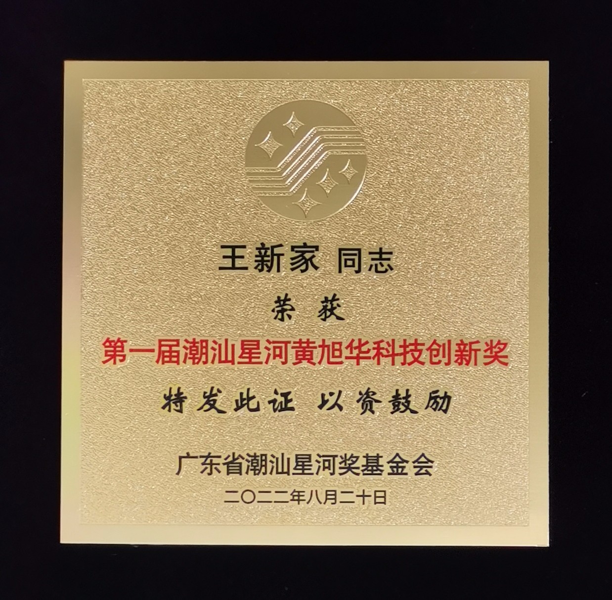 “潮汕星河黄旭华科技创新奖”是广东省潮汕星河奖基金会为学习黄旭华院士敬业奉献、勇于创新、为党和人民作出重大贡献的精神风貌,进一步营造浓厚的科技创新氛围,以星河奖基金会永远荣誉会长黄旭华院士的名义设立的。用于重奖潮汕三市在工、农、医等领域有发明创造、取得较大经济效益或良好社会效益的科技工作者。王新家院长凭借在科、教、研方面取得的突出成就,成为7名获奖的科技工作者中的一员。