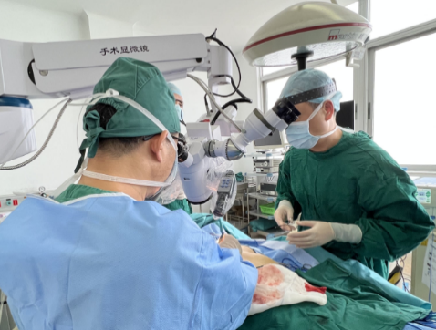 术中照片 经过术前精心的准备,手术当日,参与手术的医疗团队成员包括吴俊东主任、彭汉伟主任、吴浩明博士、郭翠萍主治医师以及方煜彤医师,历经8小时,层层递进,有条不紊地完成了左乳癌保乳、左腋窝前哨淋巴探查、腹壁下动脉穿支游离皮瓣制备、右胸壁乳房重建区域准备,供受区血管吻合、重塑双侧对称乳房、脐部整形等手术过程。