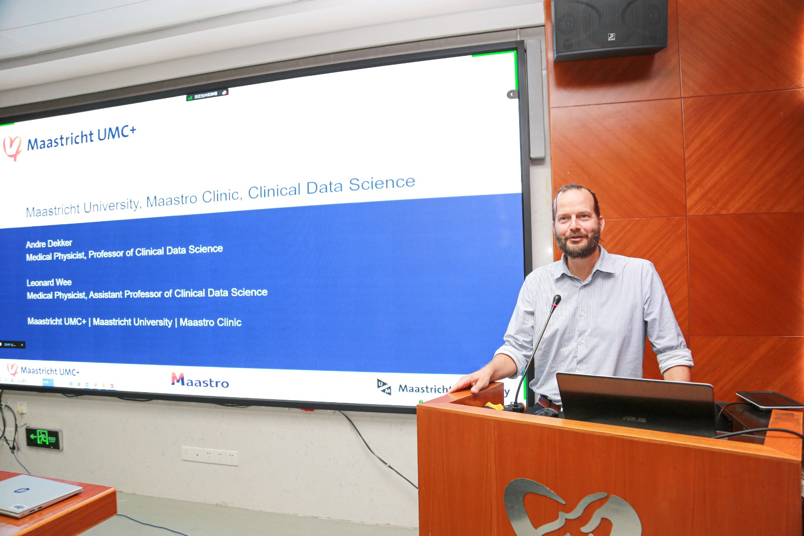王新家院长首先对来自荷兰马斯特里赫特大学放疗中心和临床大数据中心的Andre Dekker教授及Leonard Wee副教授表示欢迎,期待与马斯特里赫特大学临床大数据中心在专业人才培养和肿瘤相关的交叉学科方面有更多交流和合作,共同提高研究能力,培养具有国际化视野的高水平肿瘤专业人才。